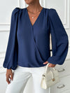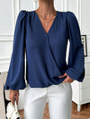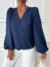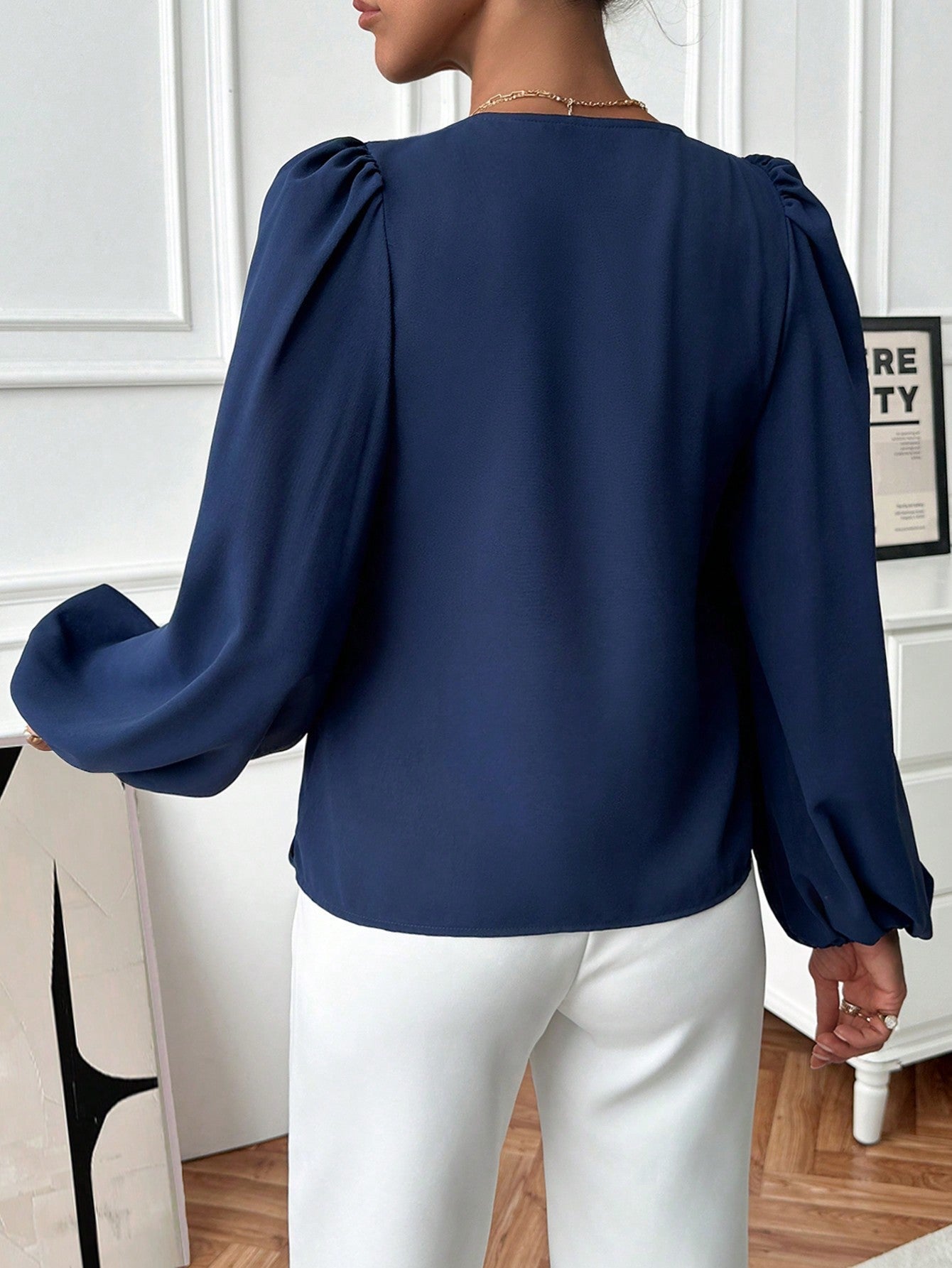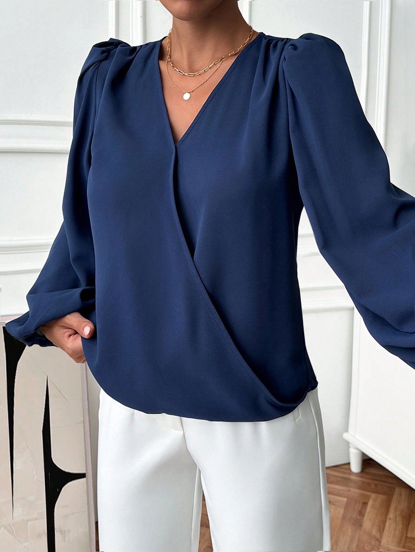 Blusa elegante lunga a maniche lunghe con scollo a V e chiusura ad avvolgere, di colore unito, per donna