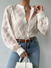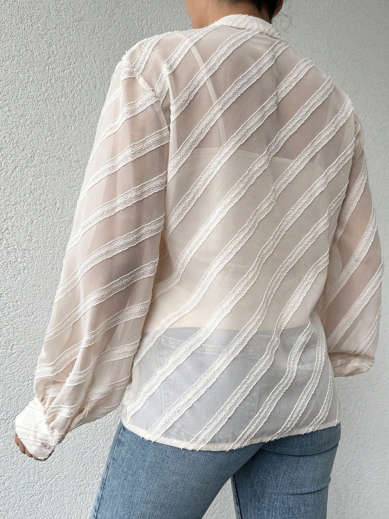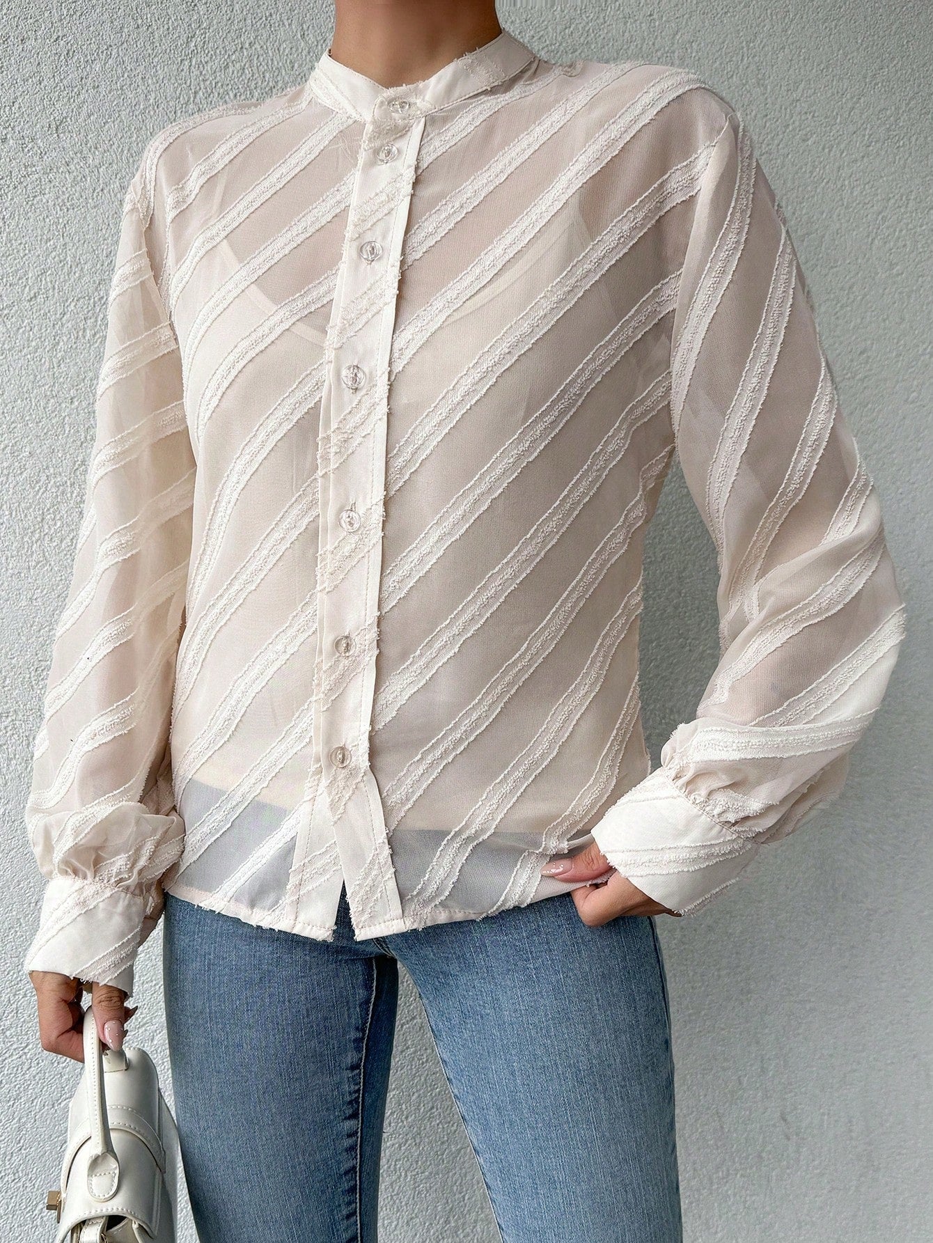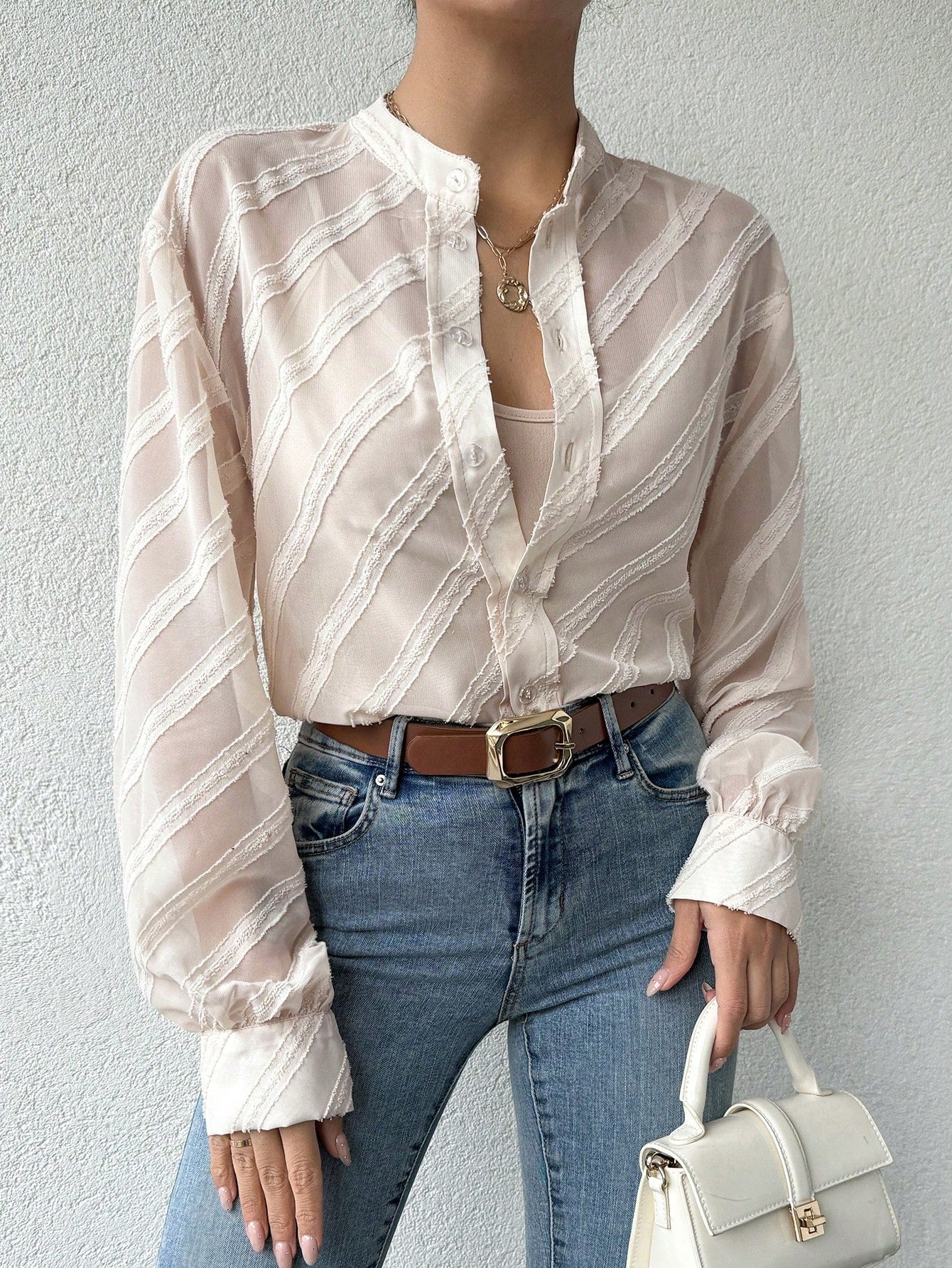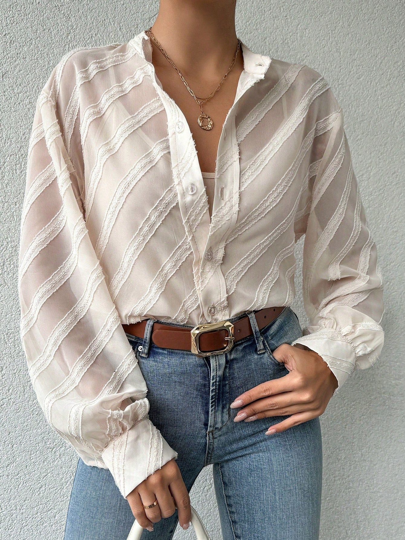 Camicia A Maniche Corte A Spalle Basse Con Bottoni, Tinta Unita Con Tessuto A Texture