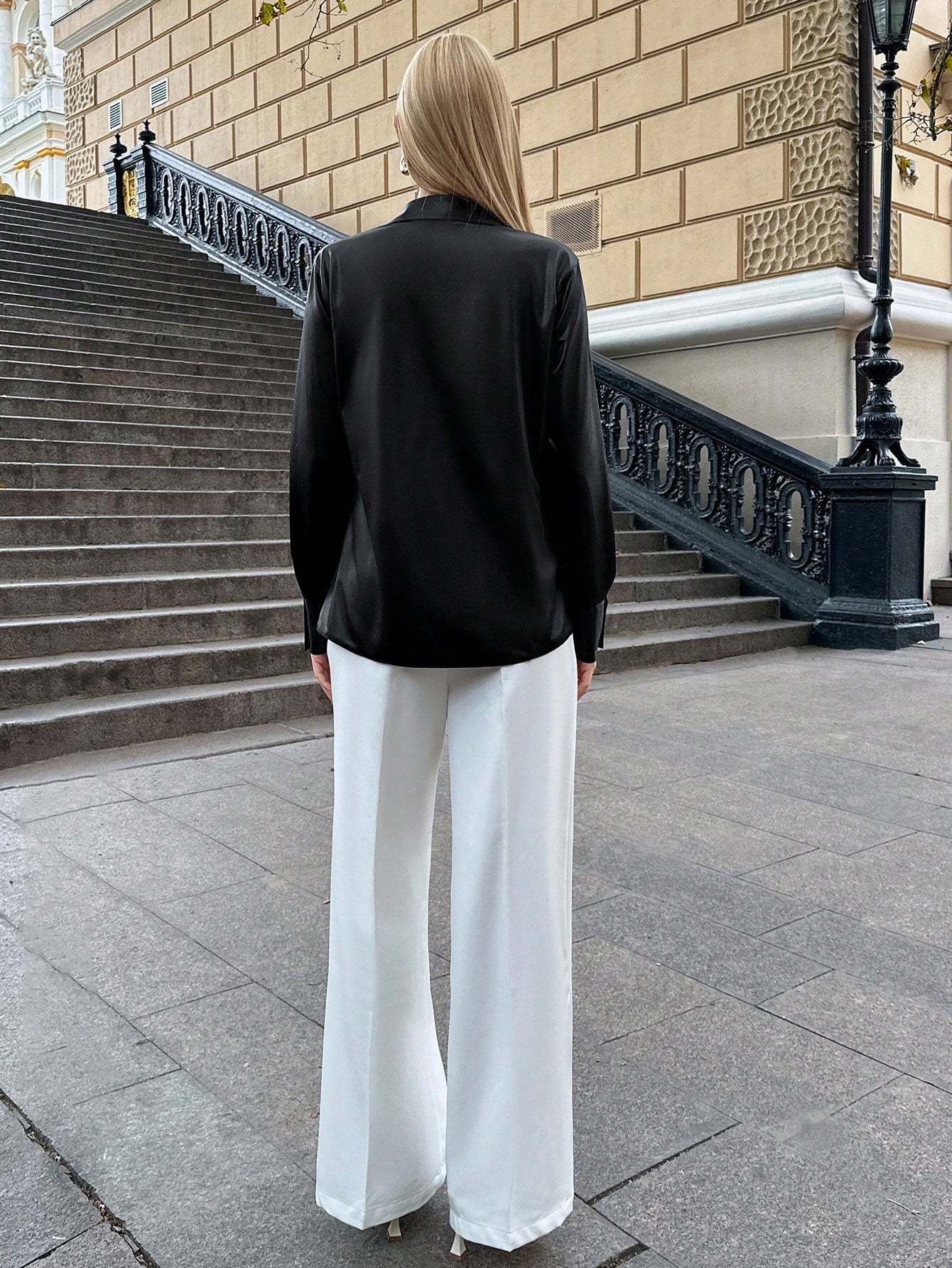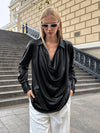 Camicia elegante in tessuto lucido tinta unita con dettagli di collo a imbuto