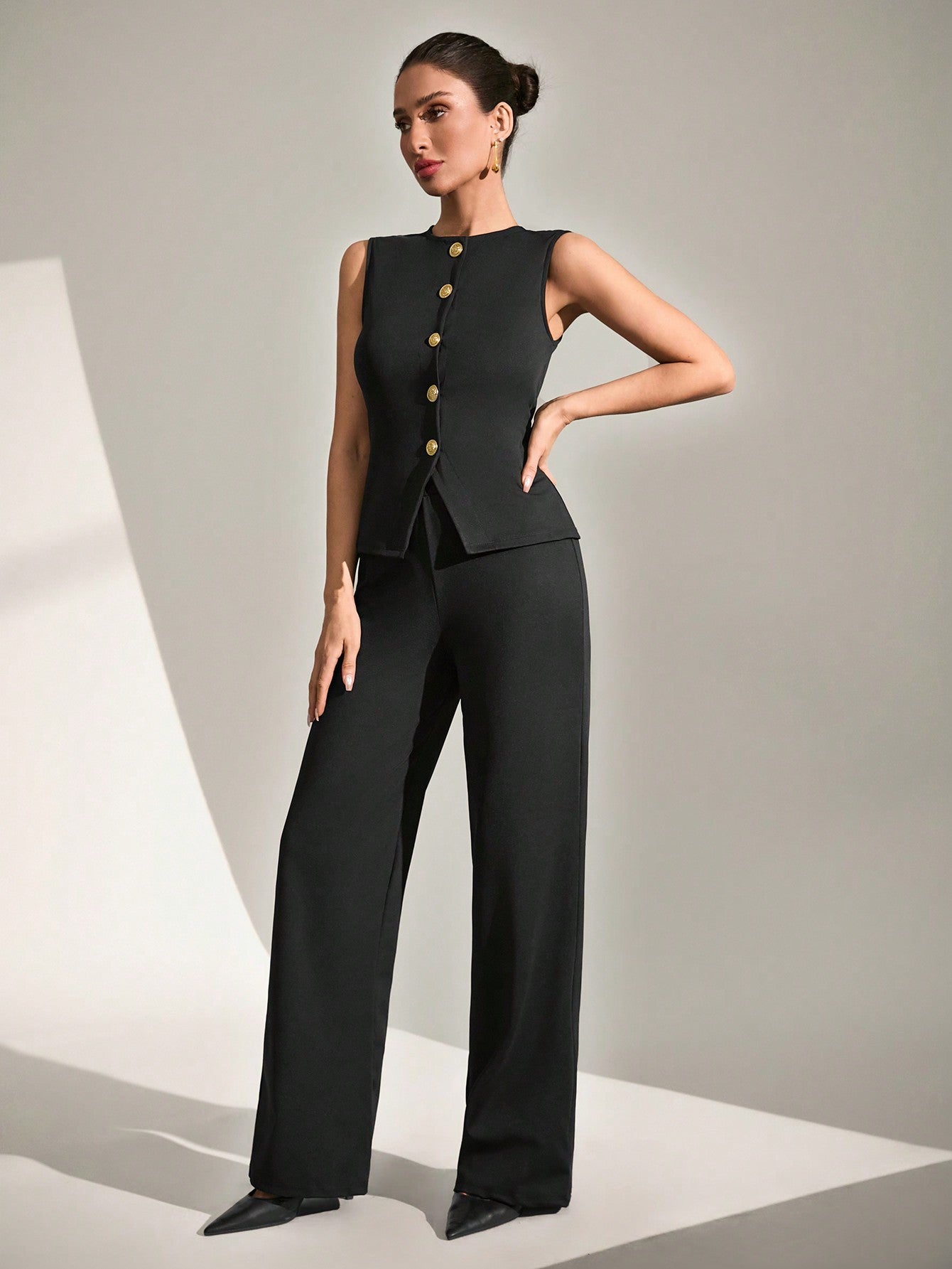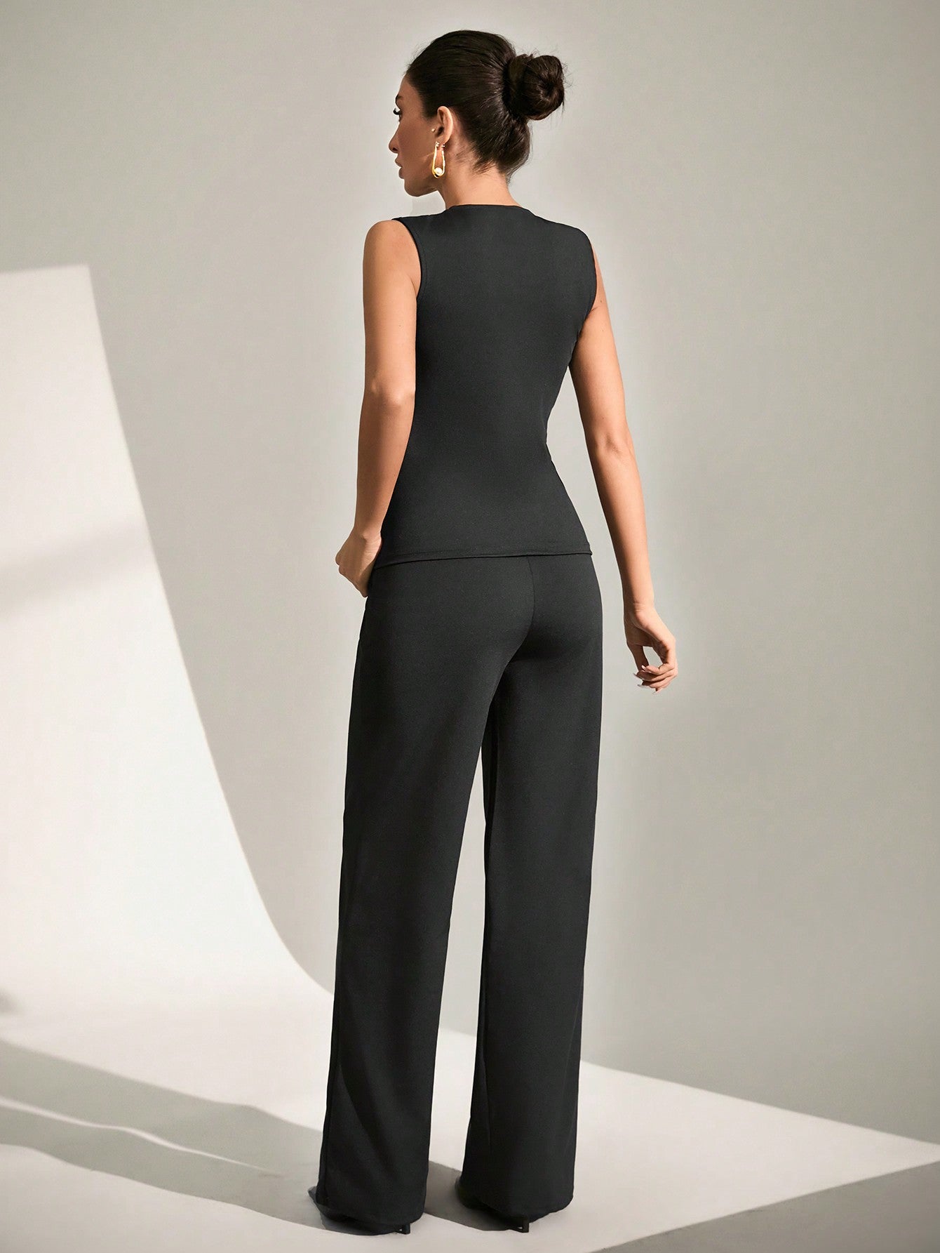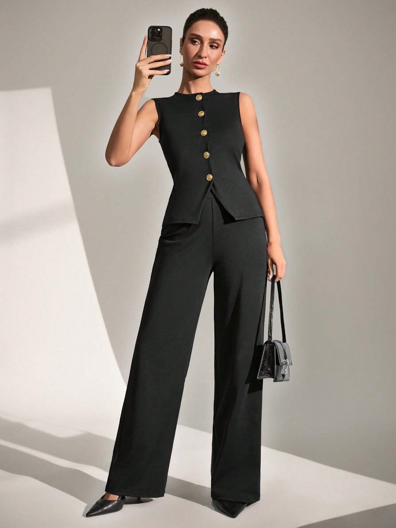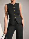 Completo casual da donna composto da gilet monopetto con scollo a ciurlo e pantaloni, in tinta unita