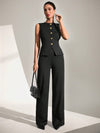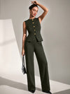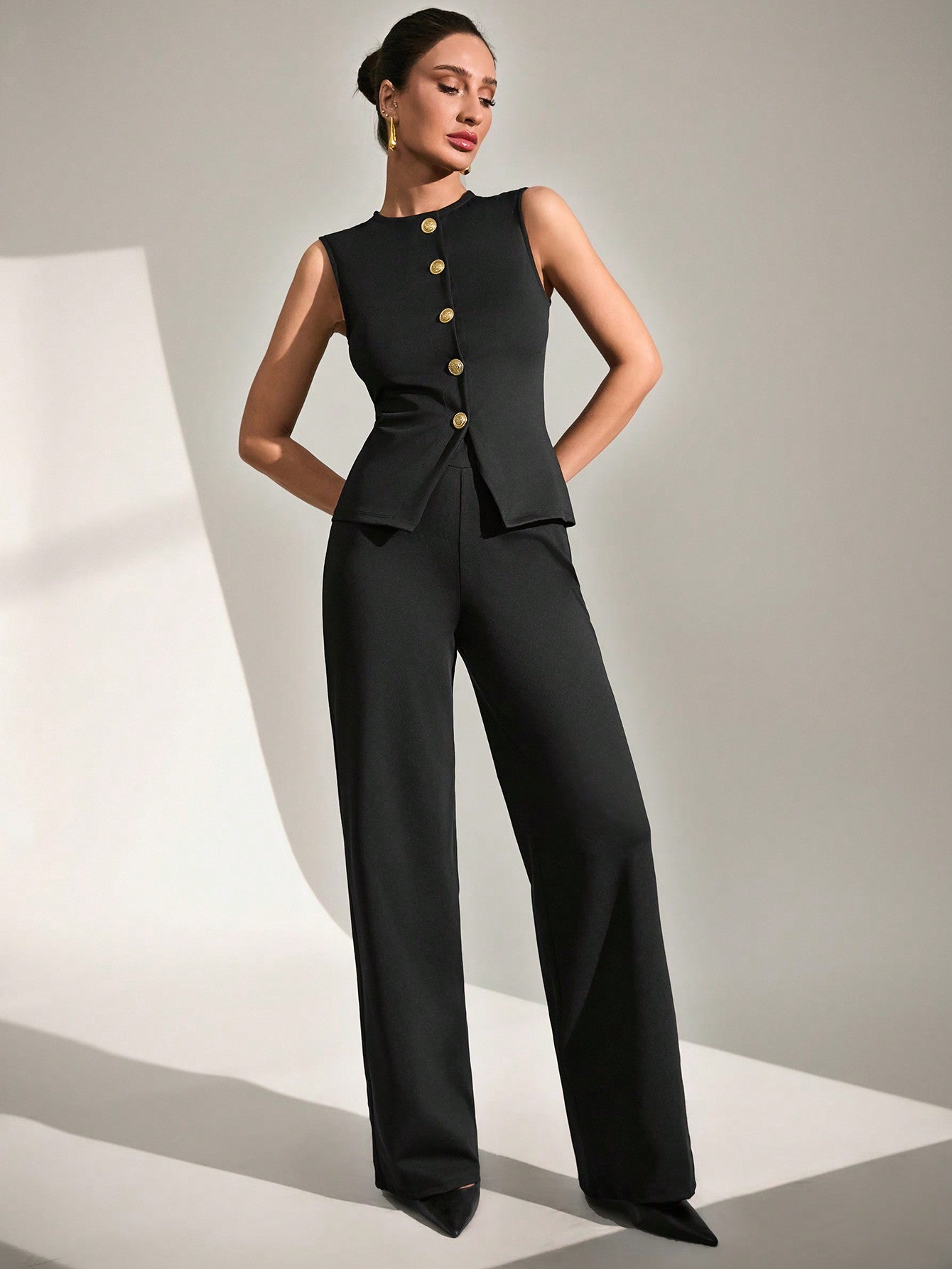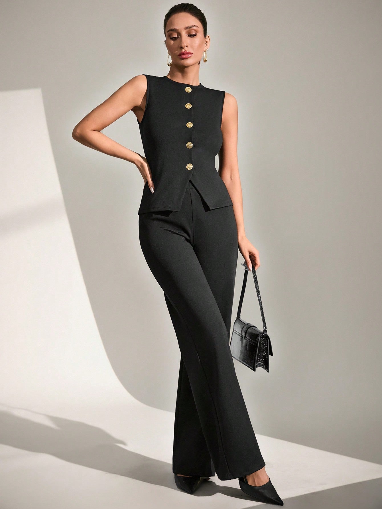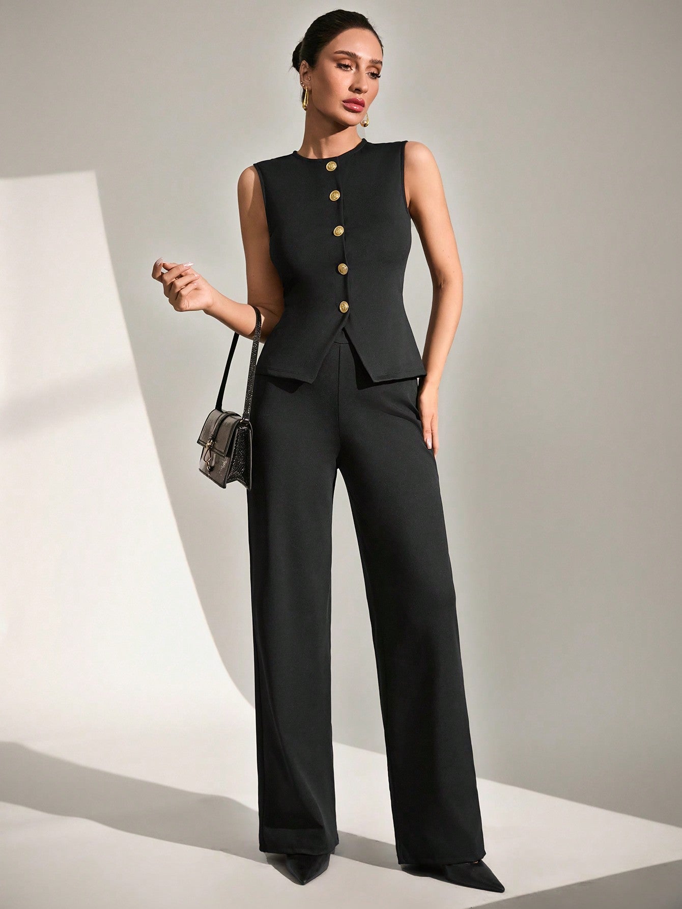 Completo casual da donna composto da gilet monopetto con scollo a ciurlo e pantaloni, in tinta unita