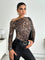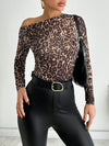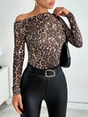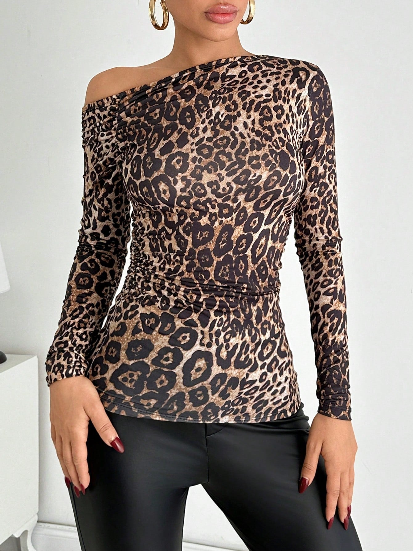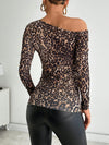 Camicetta leopardata con maniche lunghe e dettaglio asimmetrico sulla spalla