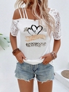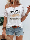 Maglietta casuale estiva in manica corta con scollo asimmetrico in laccetti a contrasto a stampa leopardata cuore per donne