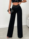 Pantalone Nero A Gamba Larga In Tessuto Di Lycra A Maglia Larga, Con Cintura Elastica A Righe Semi-trasparente E Vita A V