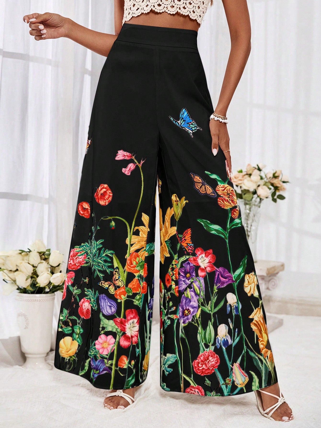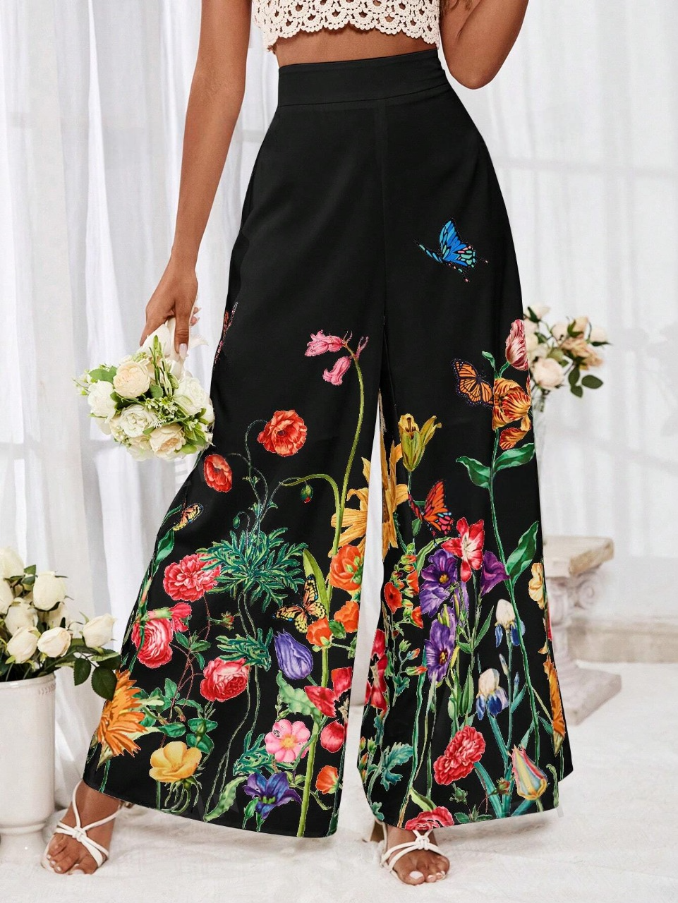 Pantaloni Larghi A Vita Alta Con Stampa Floreale Per Le Vacanze