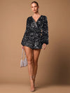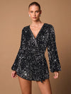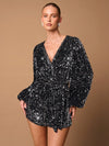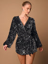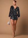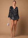 Tuta corta nera sexy con scollo a V profondo, maniche lunghe, decorata con paillettes