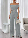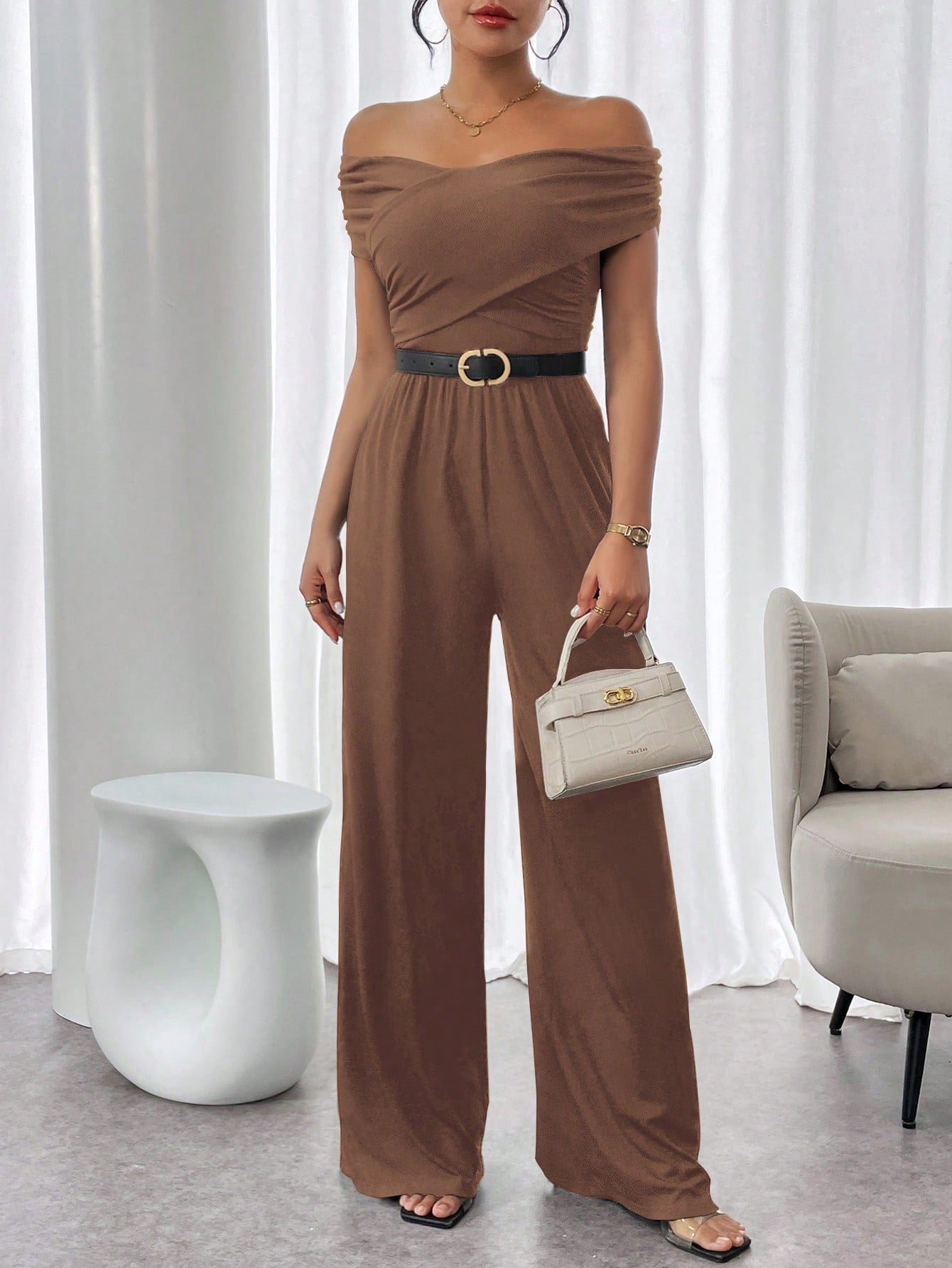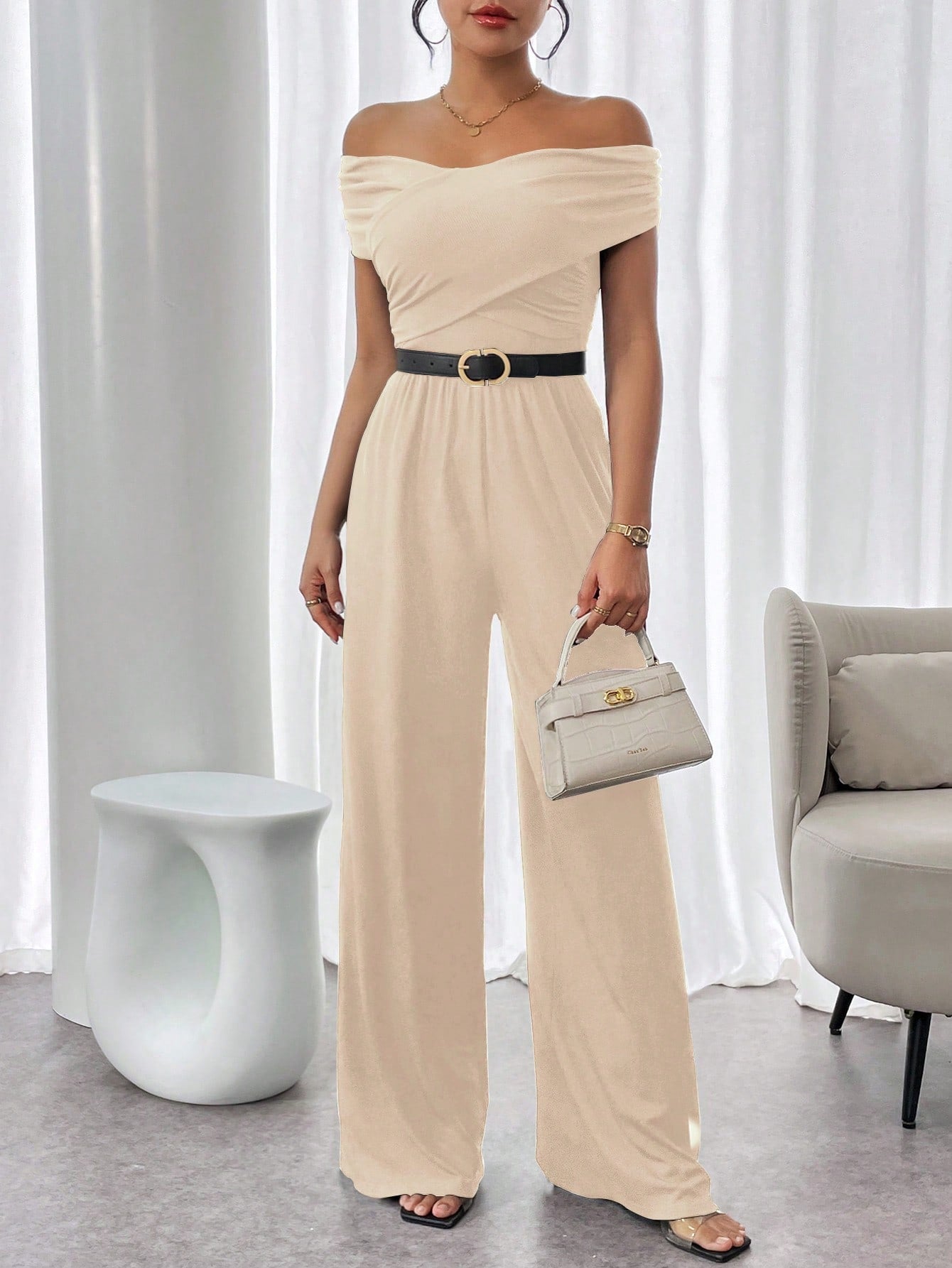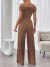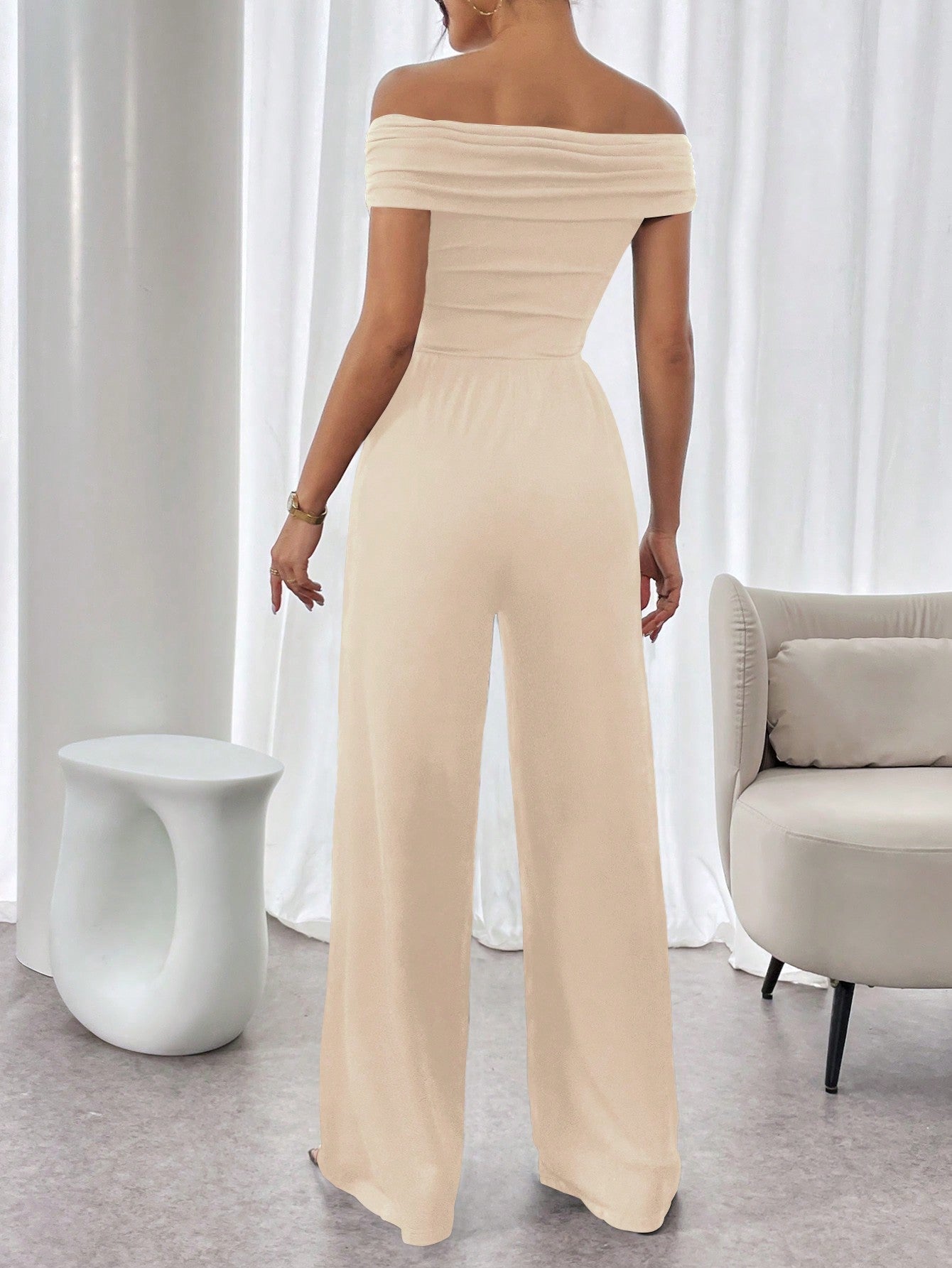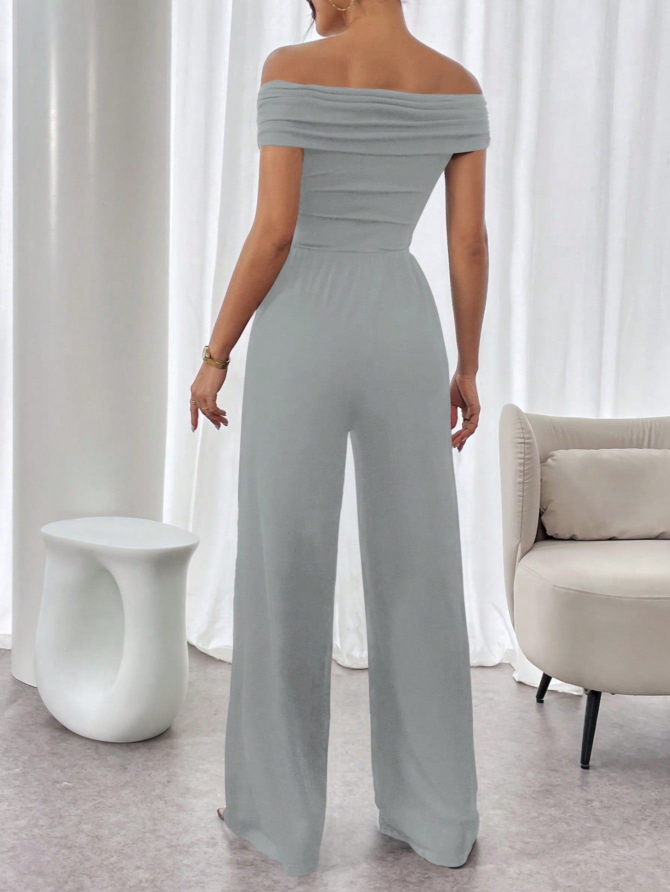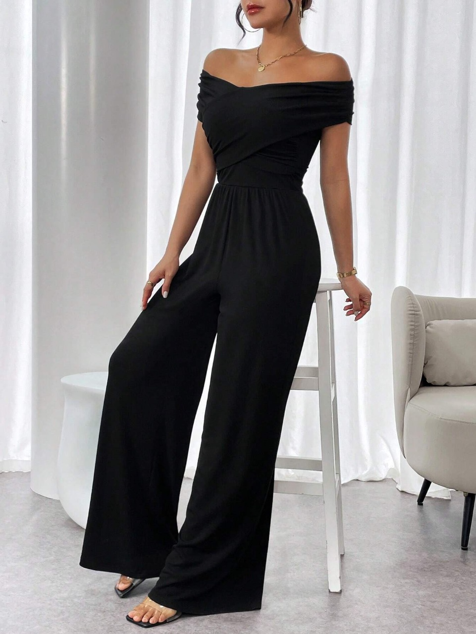 Tuta Elegante Casual A Gamba Ampia Con Pieghe A Spalle Scoperte E In Colore Tinta Unita