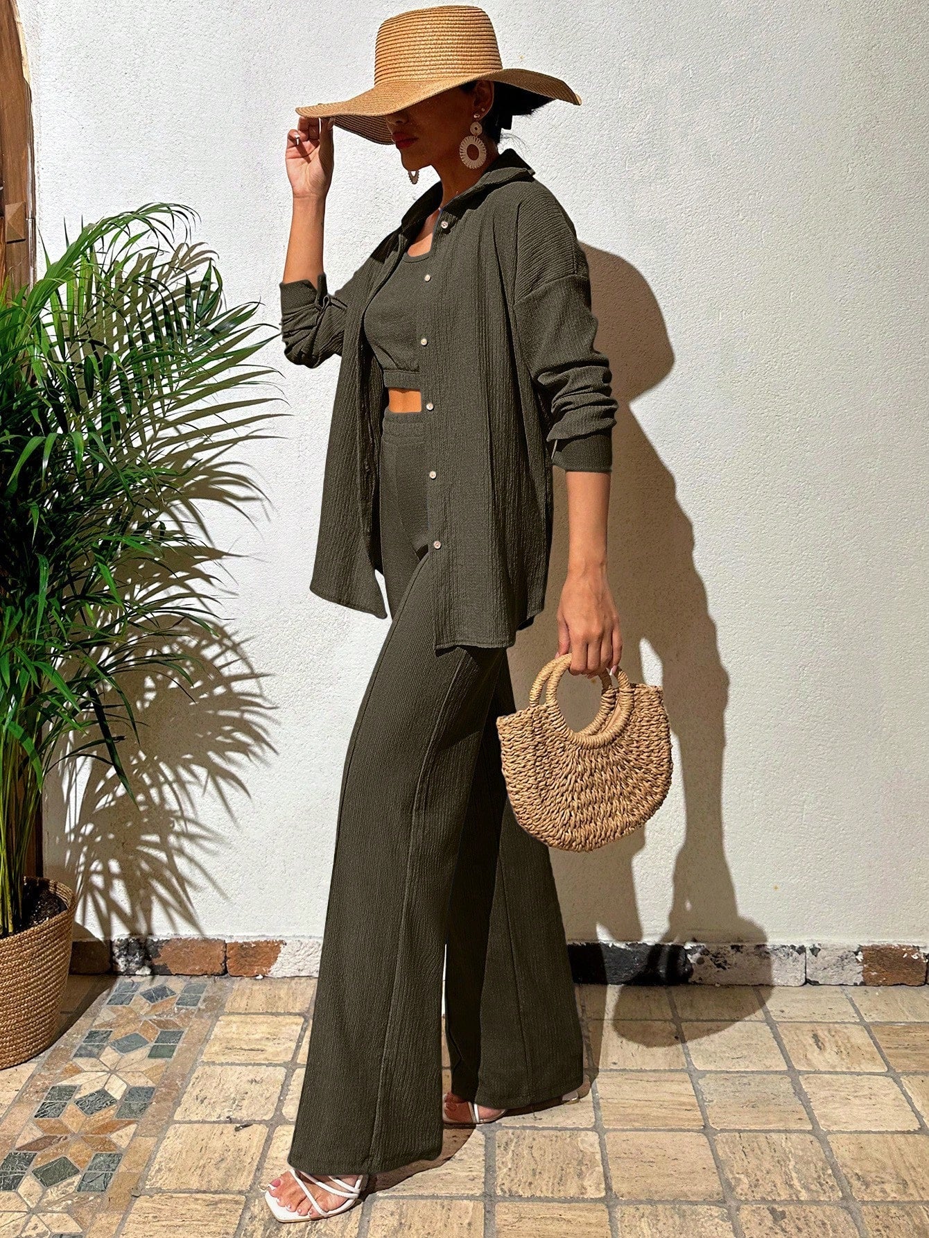 Stile : CasualScollatura : Colletto risvoltoTipo di motivo : Colore unicoDettaglio : Bottone frontaleTipo di manica : Spalle CadentiColore : Verde militareTipo di top : CamicettaTipo di bottom : PantaloniTemperatura...