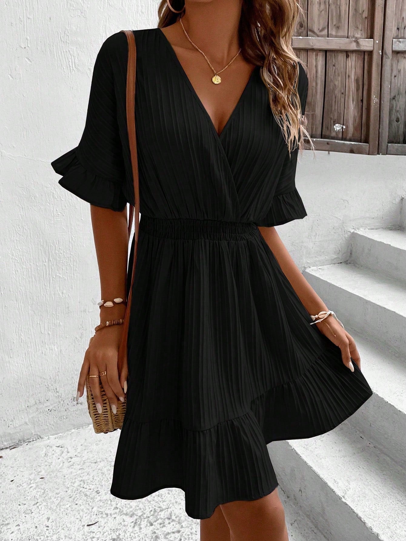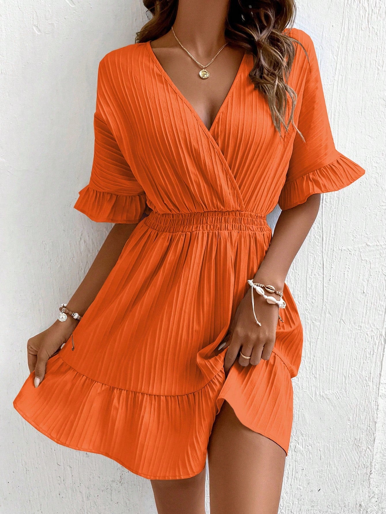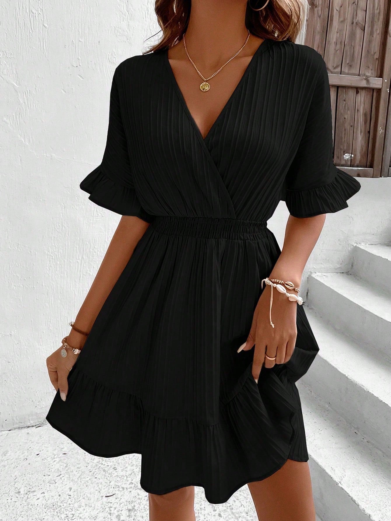 Tipo : A lineaStile : CasualTipo di manica : SvasataLinea vita : Vita altaDettaglio : Nodo, Volanti, Orlo arricciato, avvolgenteTipo di motivo : Colore unicoScollatura : Scollatura a VOrlo/ Forma...