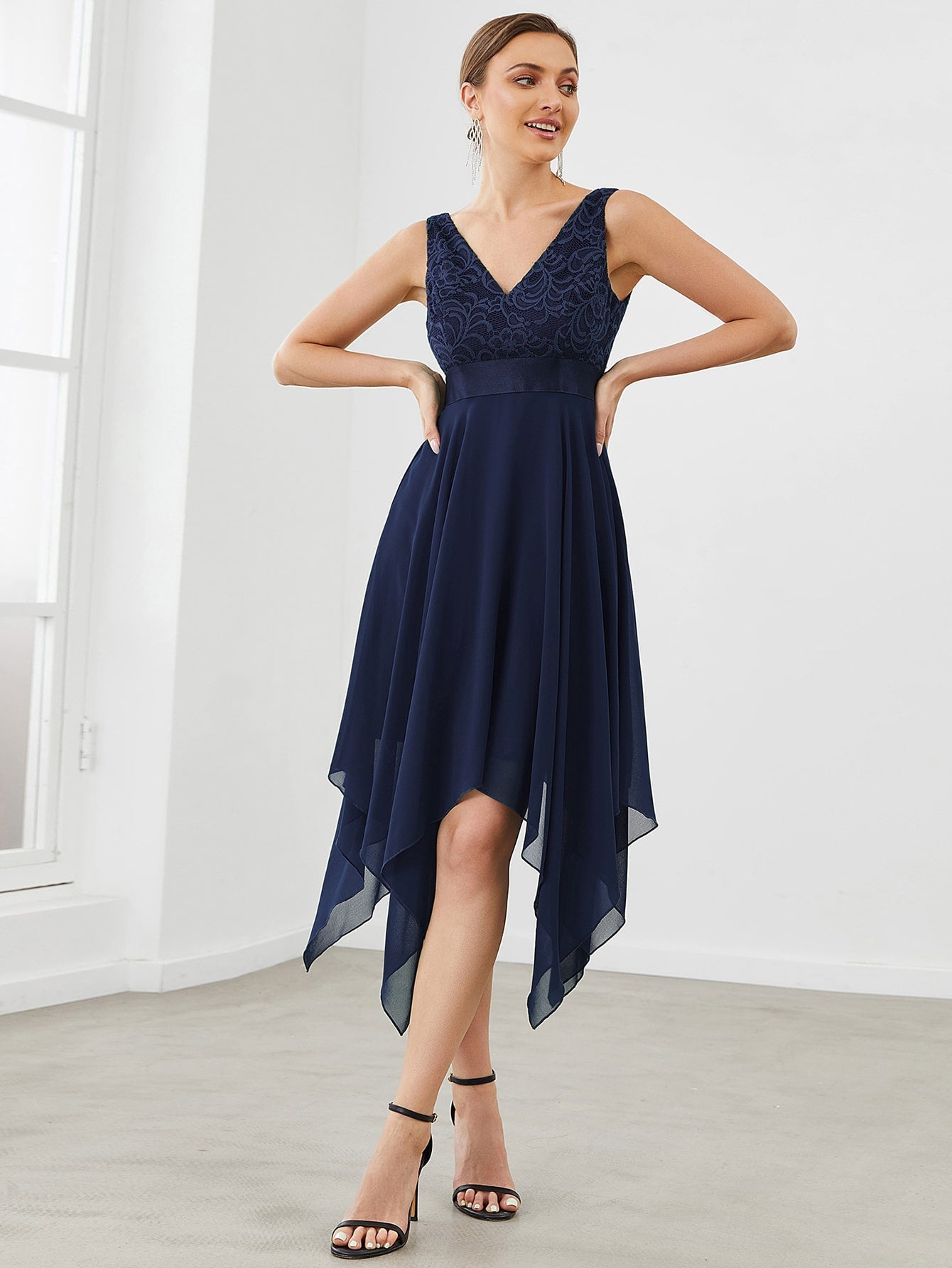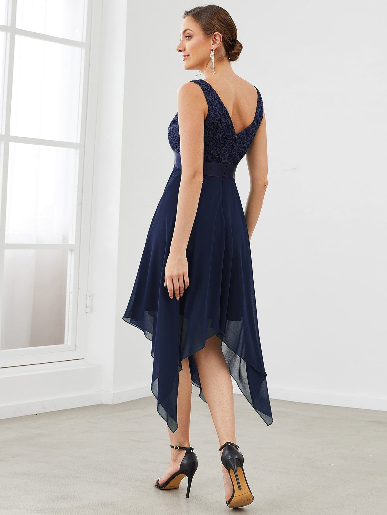 Colore : Blu CadettoStile : EleganteTipo di motivo : Colore unicoTipo : A lineaDettaglio : Asimmetrico, Pizzo a contrasto, CernieraScollatura : Scollatura a VLunghezza manica : Senza manicheTipo di montaggio...