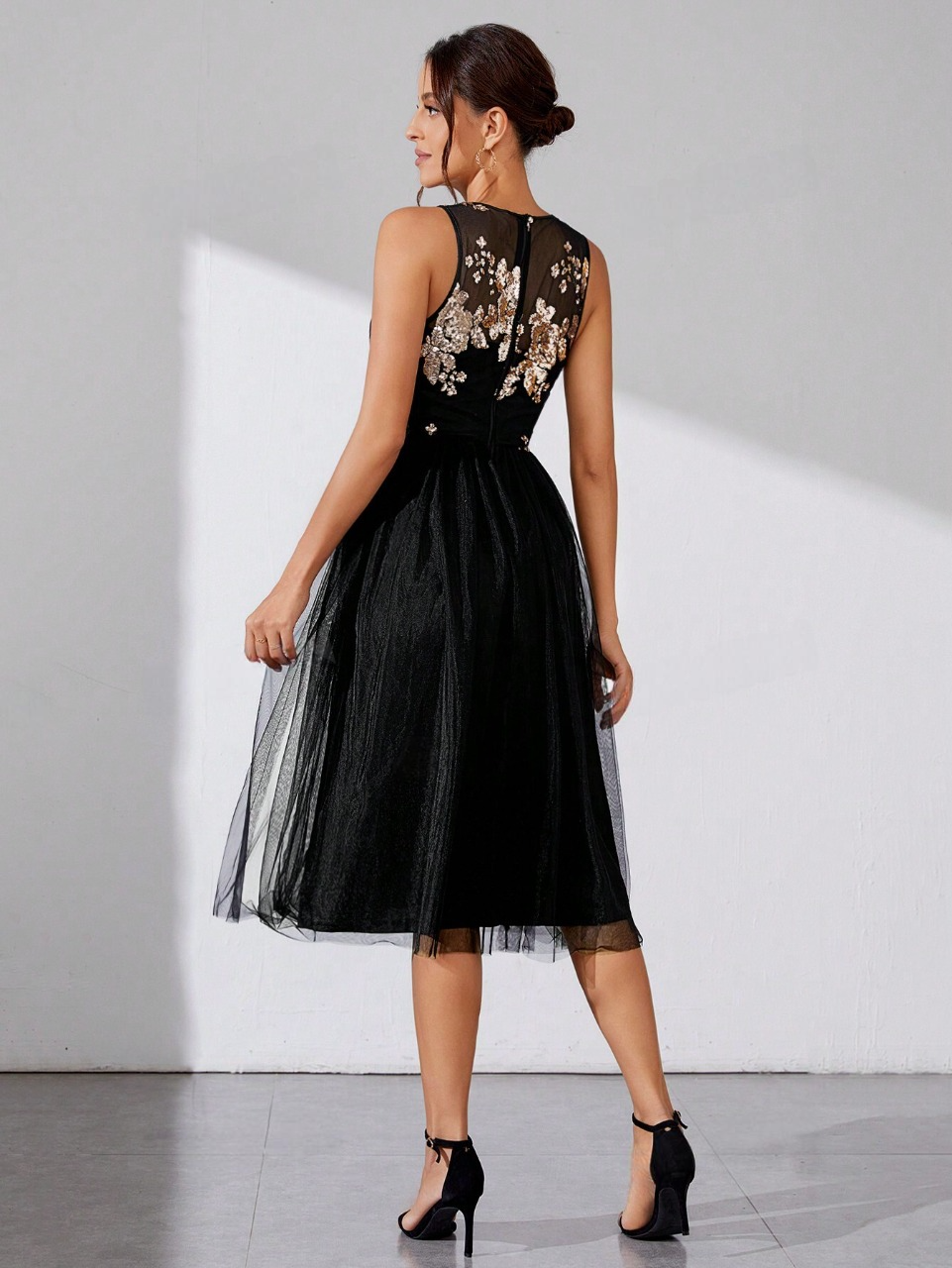 Colore : nero Stile : Elegante, Festa Tipo di motivo : Floreale Tipo : A linea Dettaglio : Creste, Contrasto Mesh, Cerniera Scollatura : Scollo rotondo Lunghezza manica : Senza...