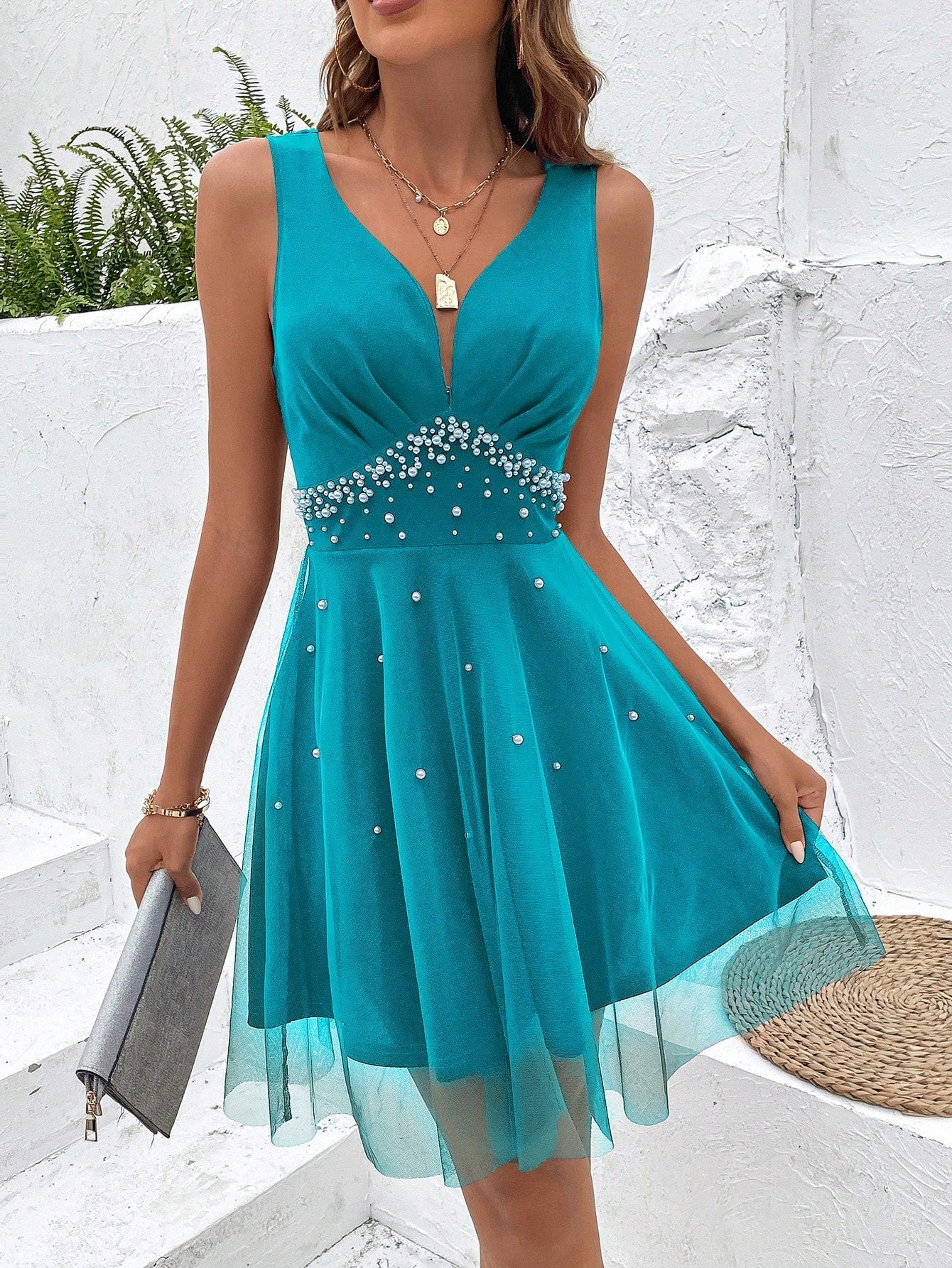 Abito in maglia sovrapposta con perle