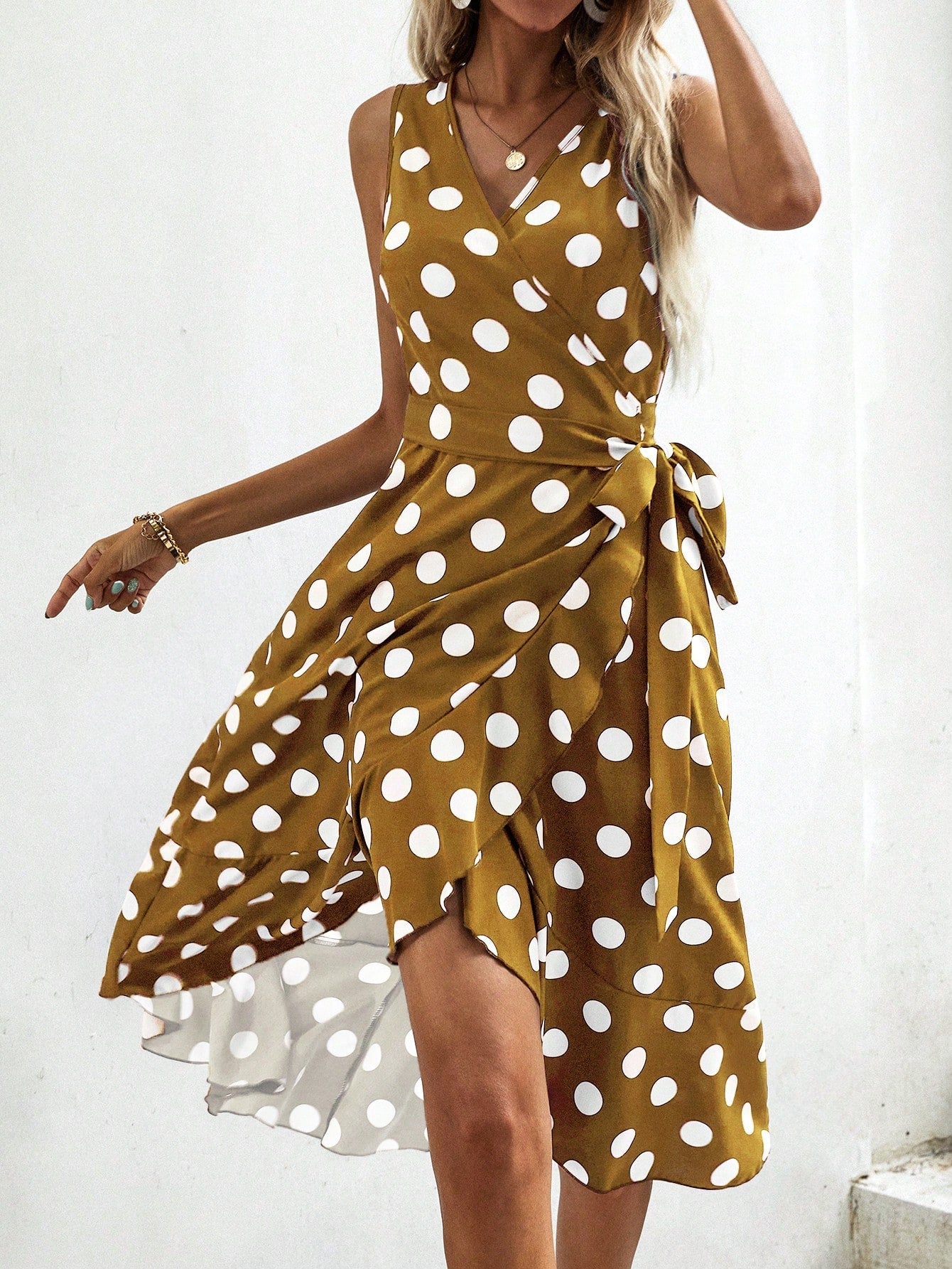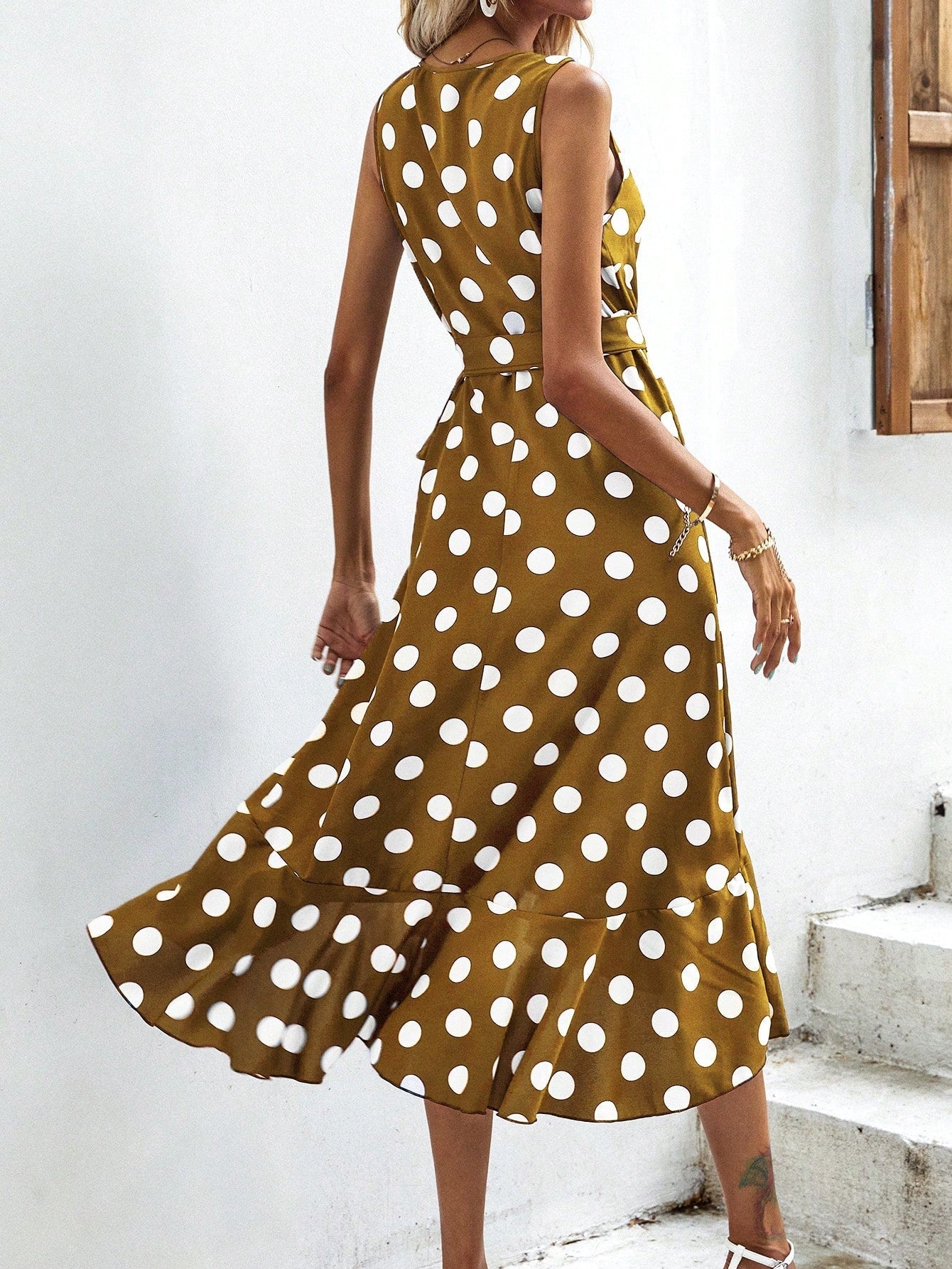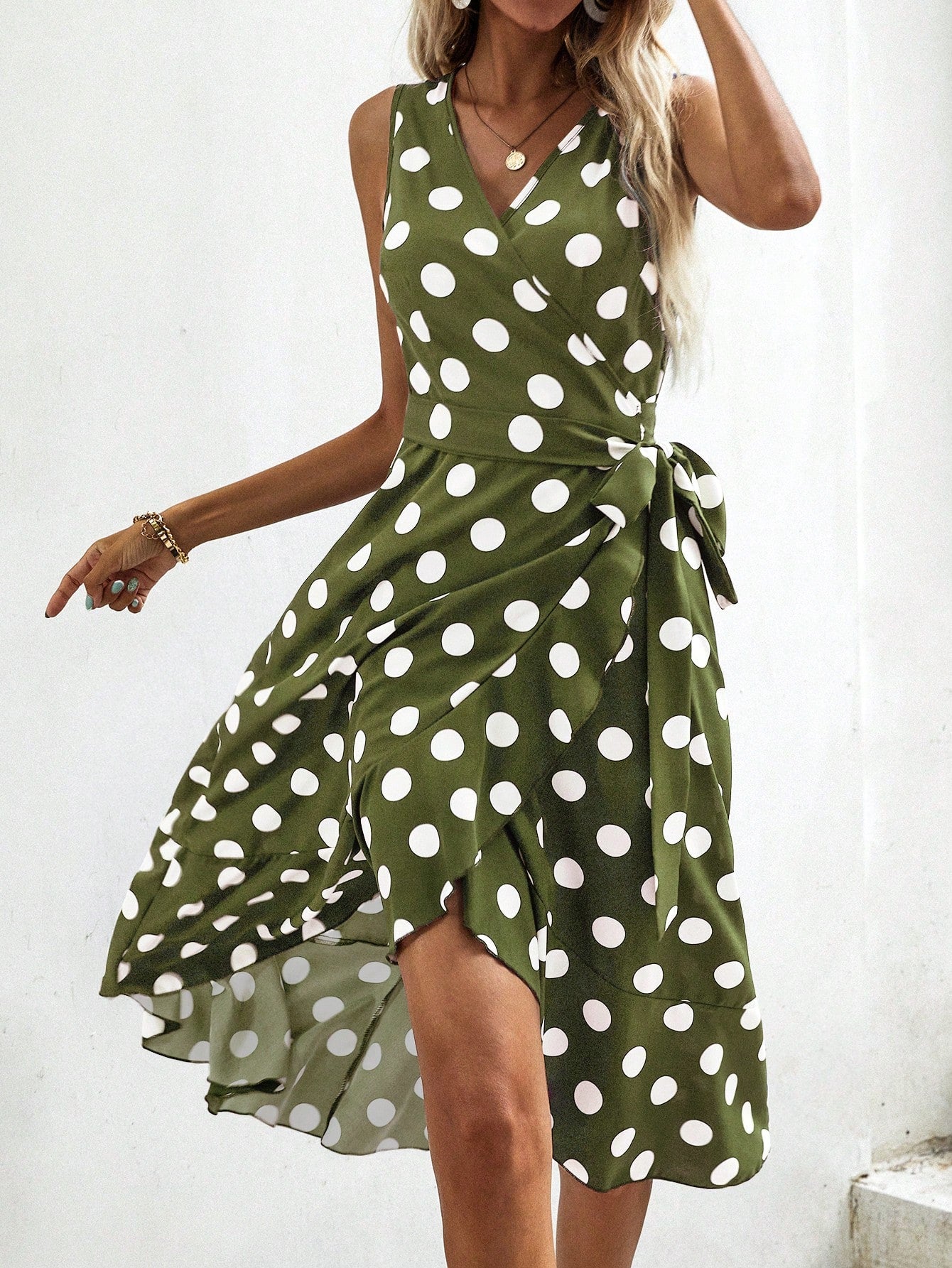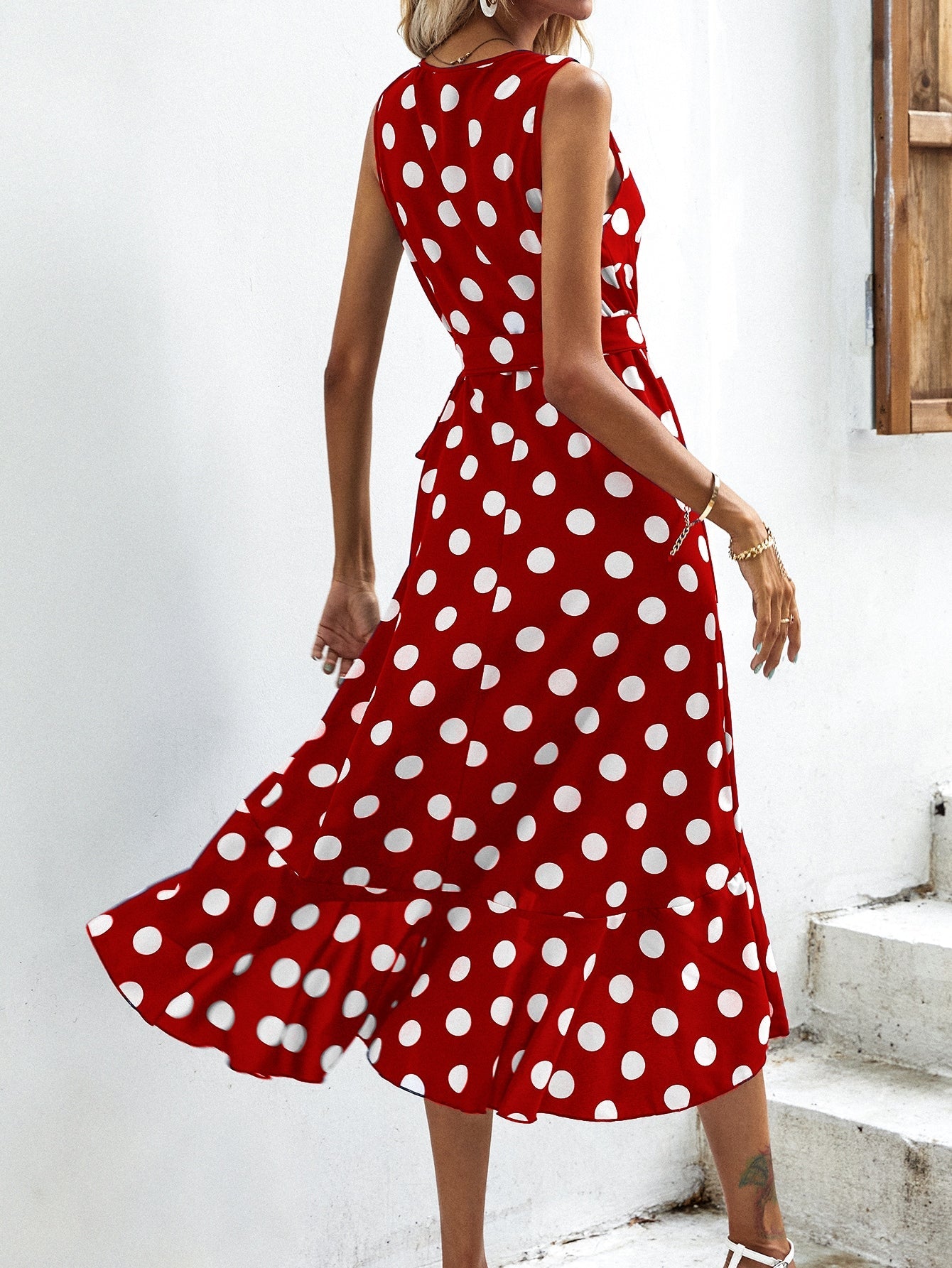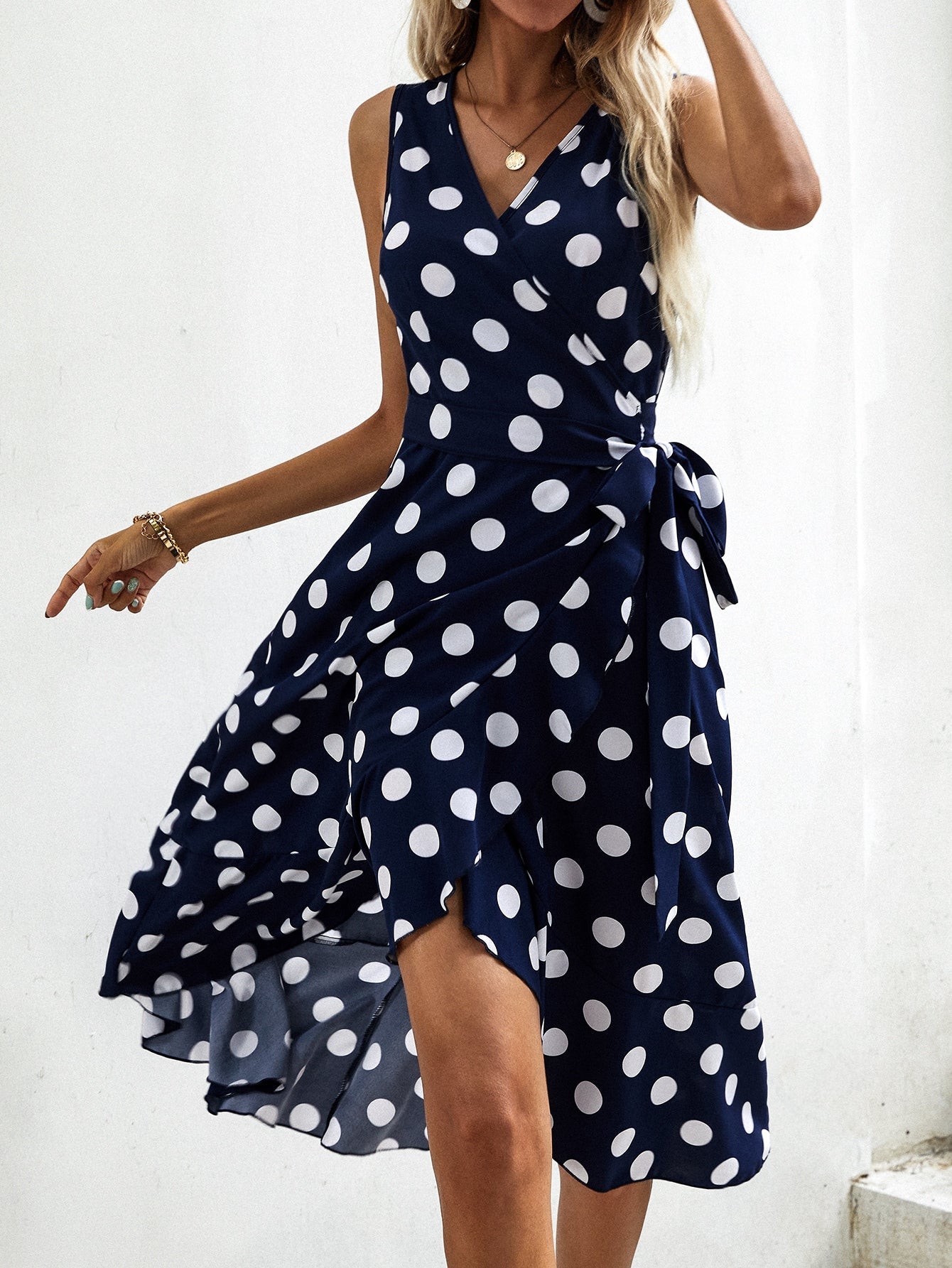 Colore : Blu Navy Stile : Bohemien Tipo di motivo : Pois Tipo : A linea Dettaglio : avvolgente Scollatura : Scollatura a V Lunghezza manica : Senza maniche Tipo...