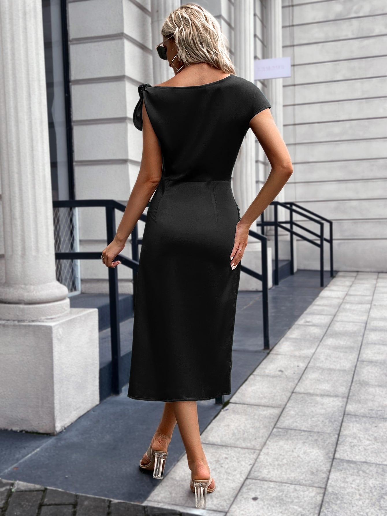 Colore : Verde ScuroStile : EleganteTipo di motivo : Colore unicoTipo : AderenteDettaglio : Nodo, Plissettato, avvolgenteScollatura : Scollatura a barcaLunghezza manica : Manica ad alettaTipo di manica : PipistrelloTipo...