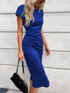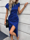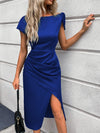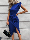 Abito lungo in raso da donna con nodo singolo sulla spalla, orlo asimmetrico