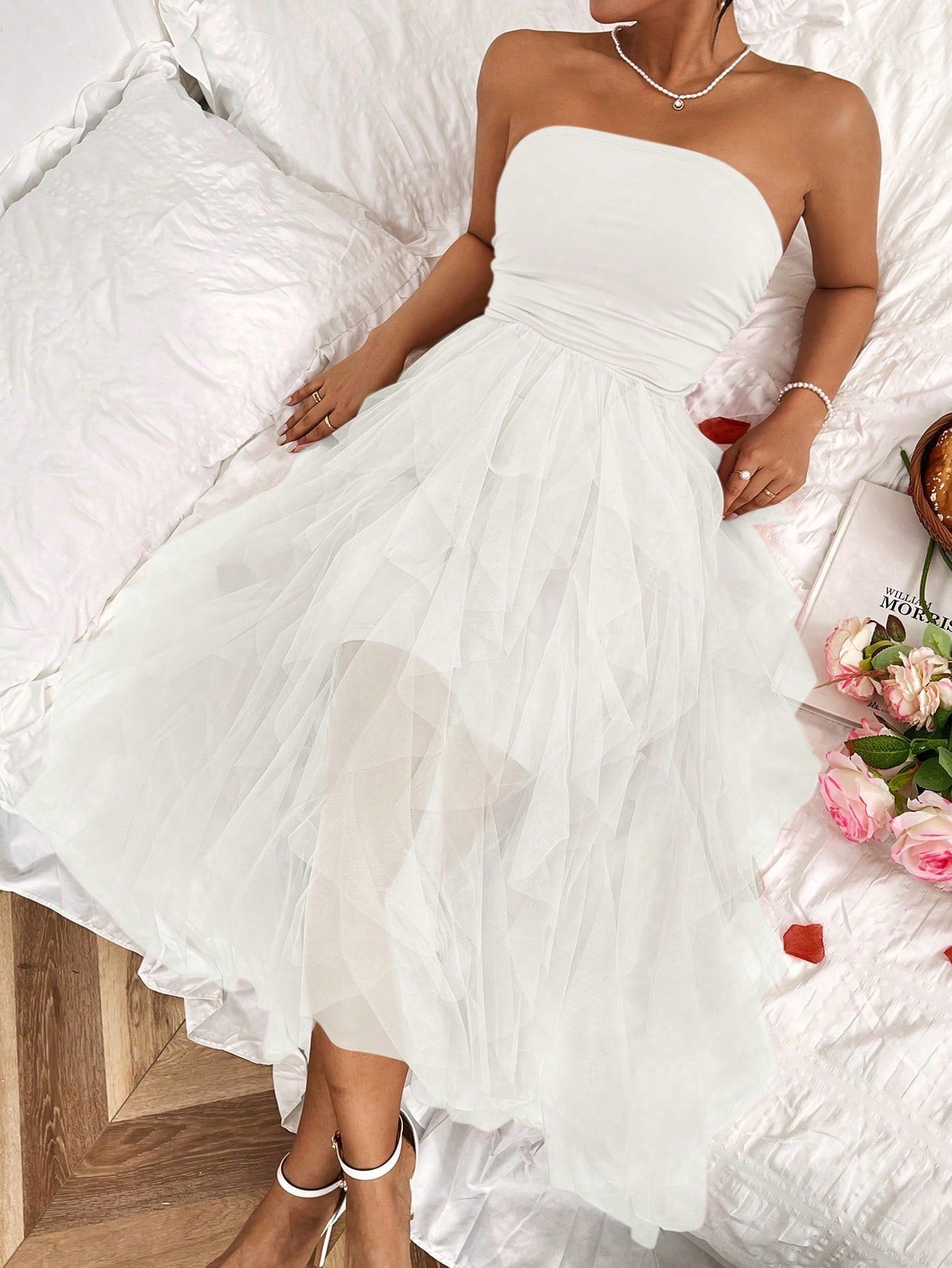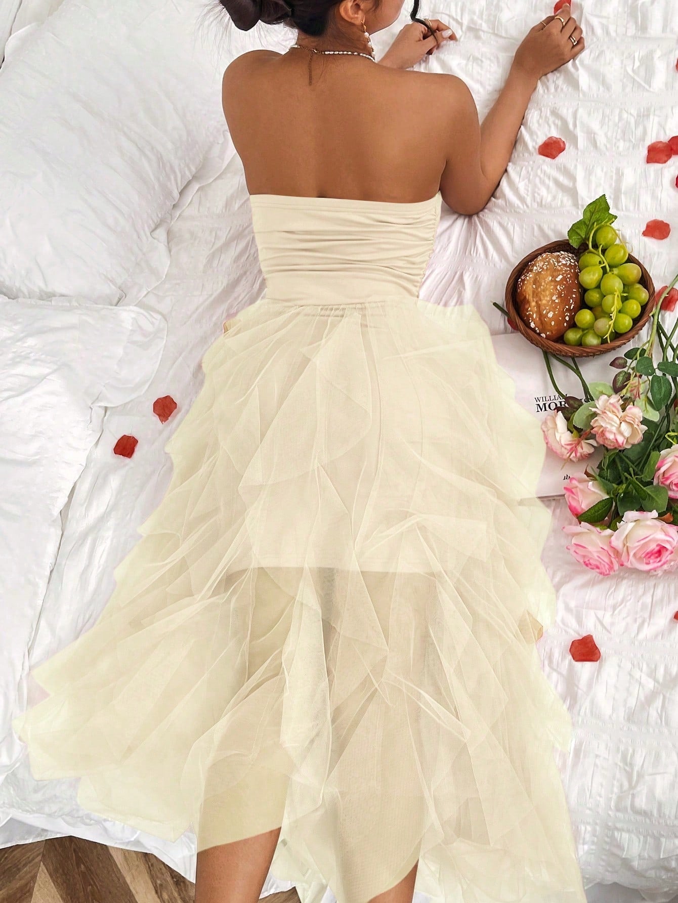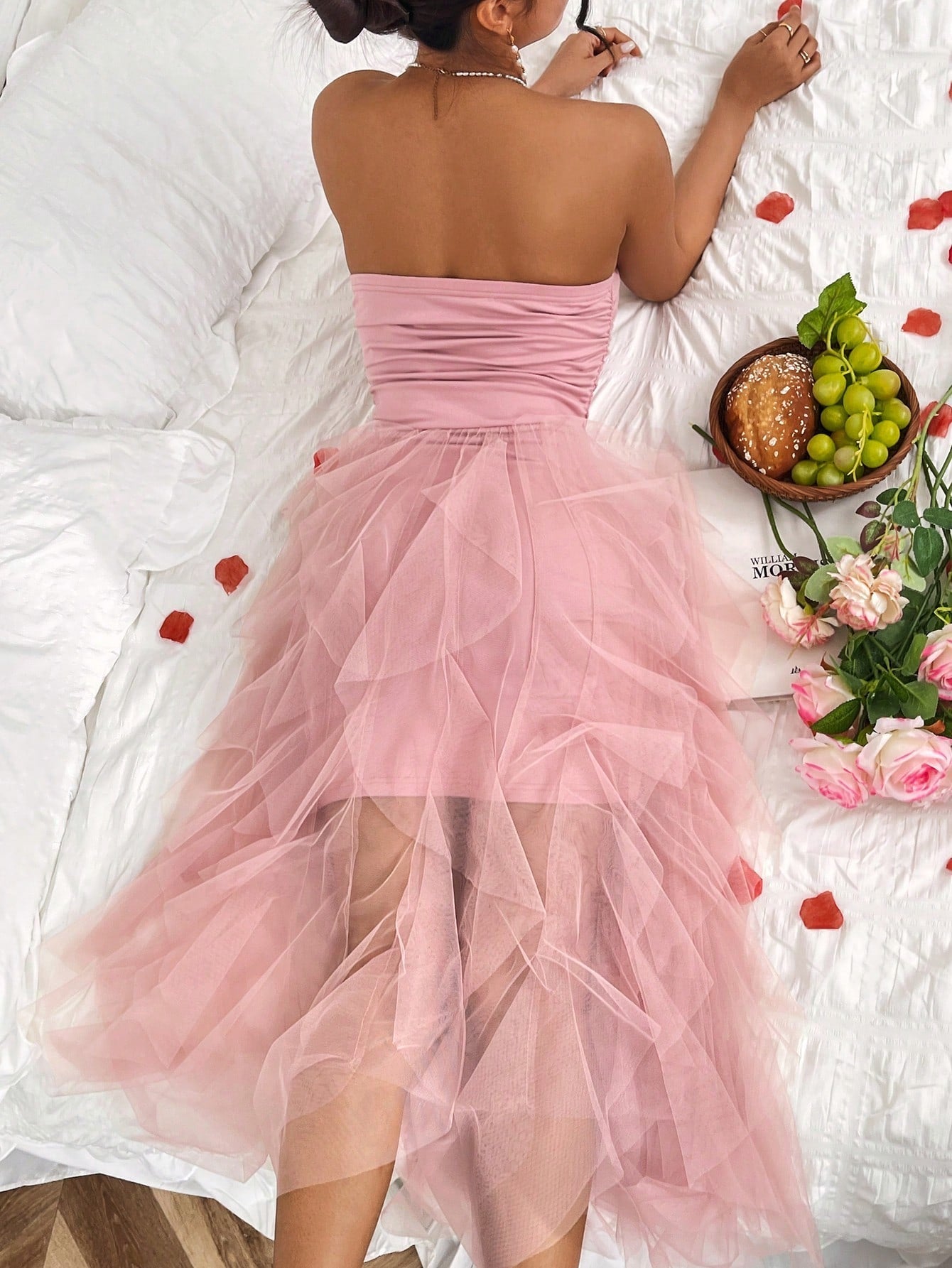 Abito Senza Spalline Con Pieghe E Patchwork In Rete E Tinta Unita