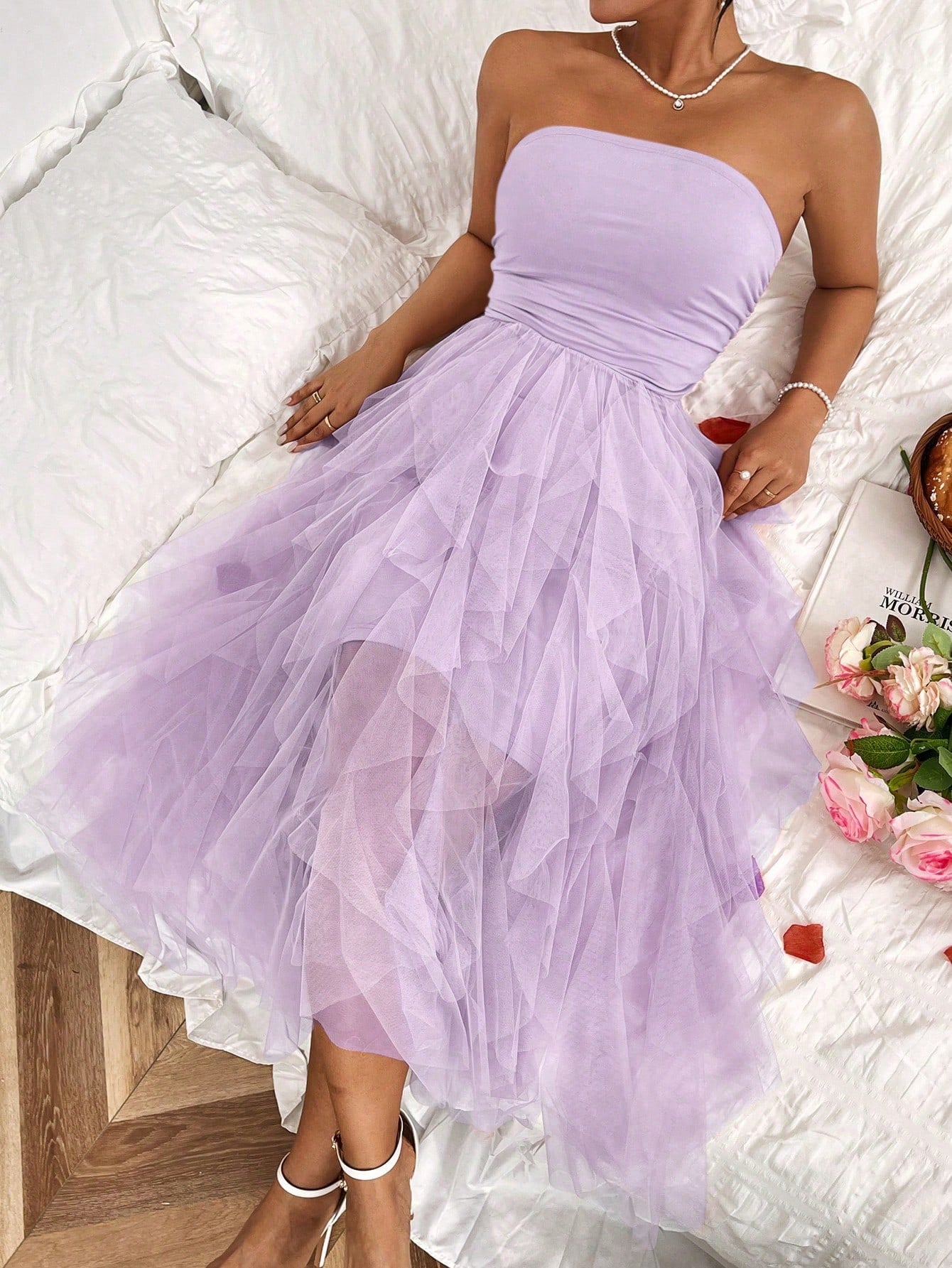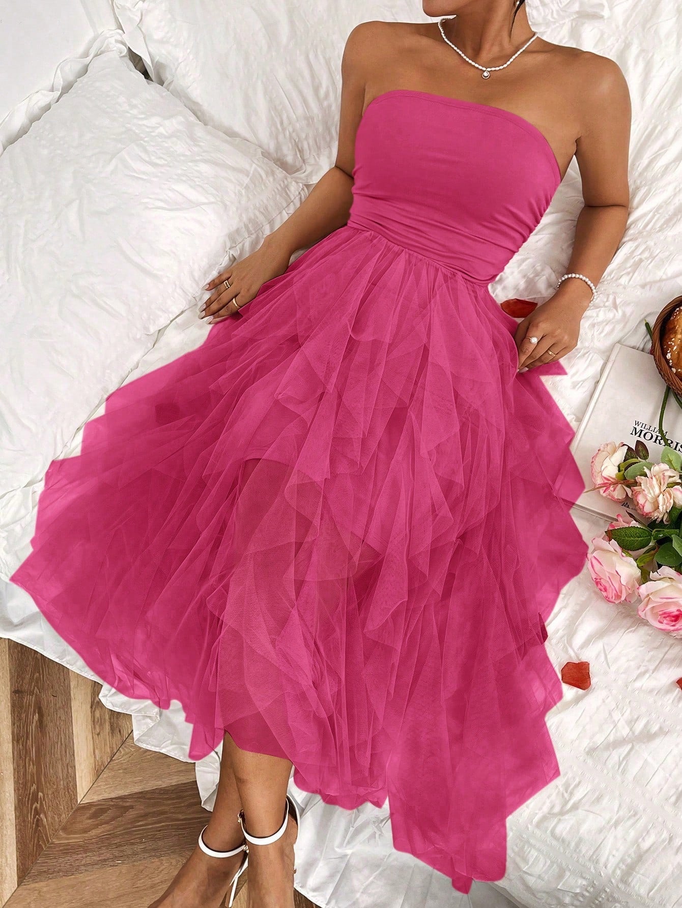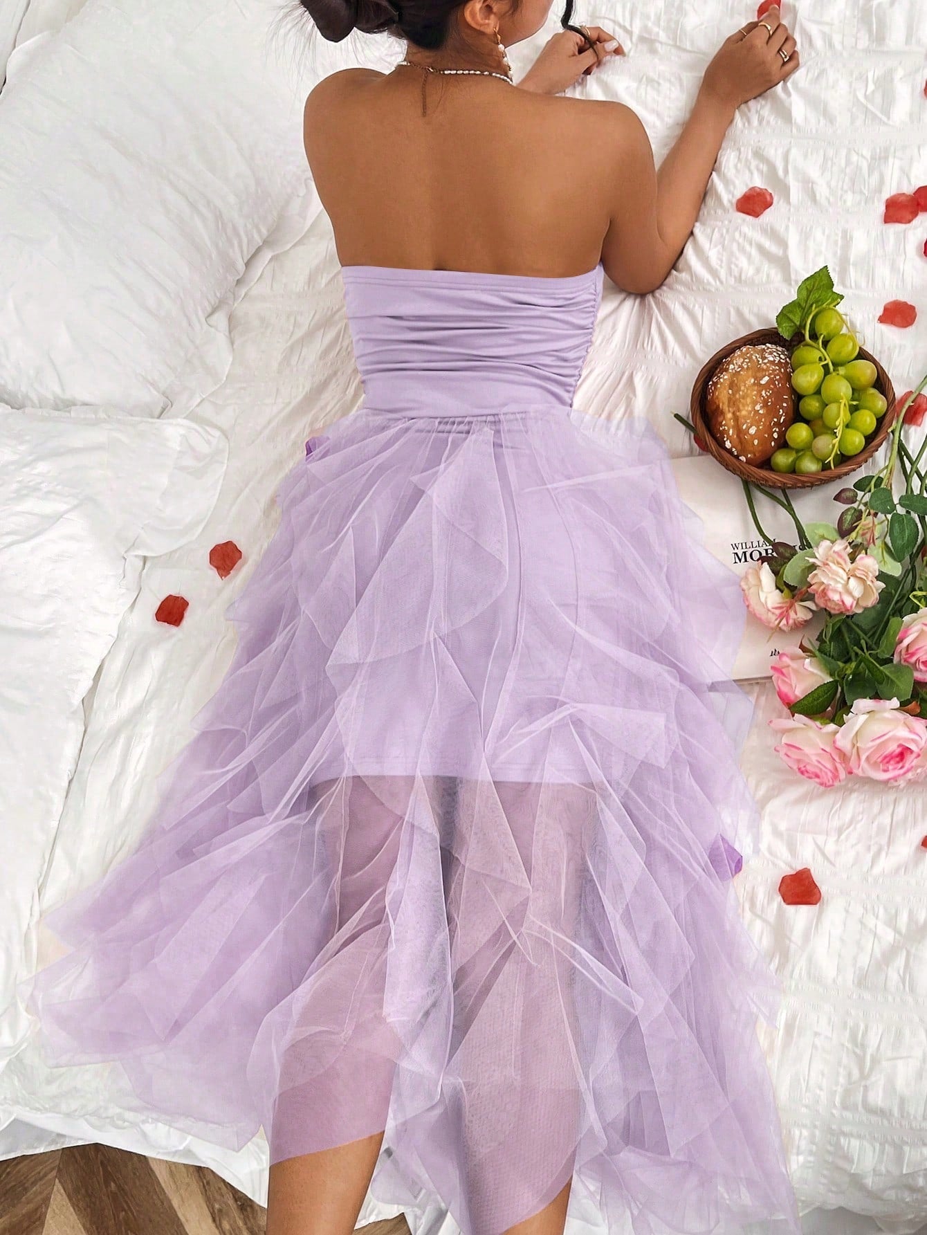 Abito Senza Spalline Con Pieghe E Patchwork In Rete E Tinta Unita