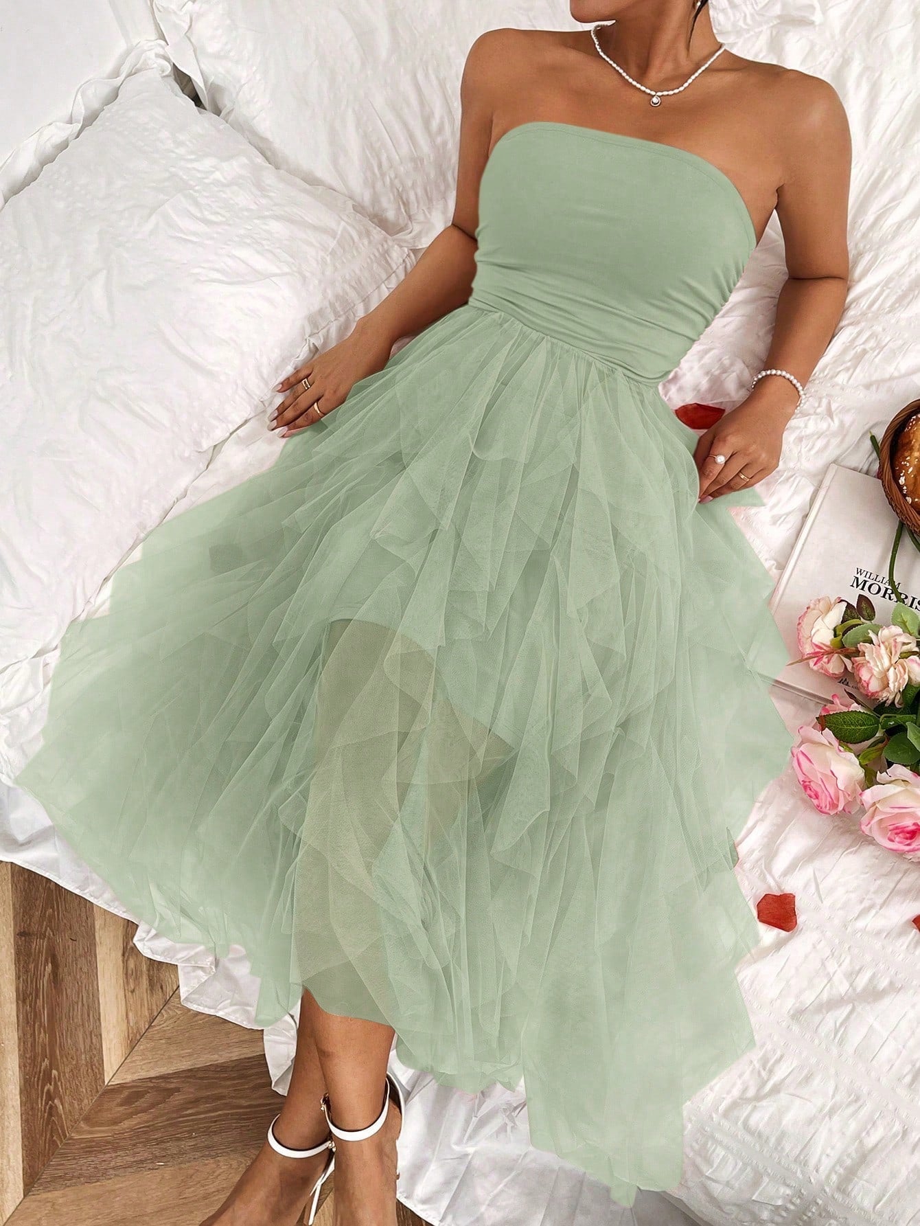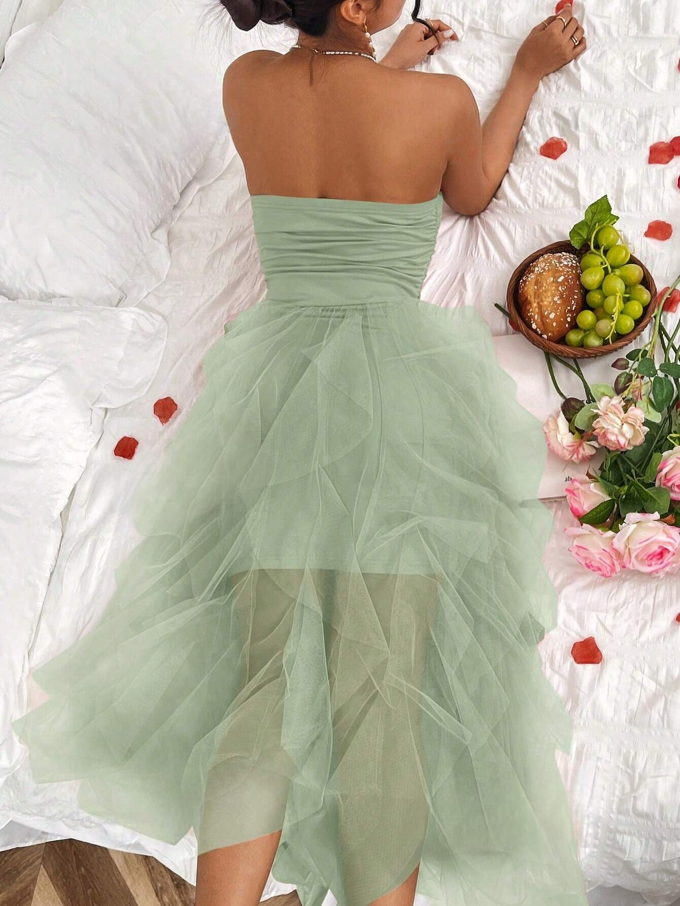 Colore : VerdeStile : CasualTipo di motivo : Colore unicoTipo : A lineaDettaglio : Asimmetrico, Plissettato, arricciatoScollatura : BustierLunghezza manica : Senza manicheTipo di montaggio : Forma normaleLunghezza : midiLinea...