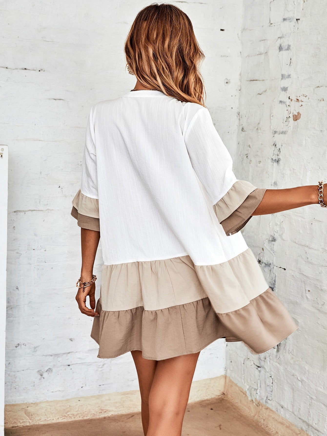 Abito smock color block manica svasata con collo quadrato con volant