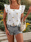 Blusa estiva casual da donna con ricamo floreale, scollo a quadrato, orlo a volant e decorazione per le vacanze