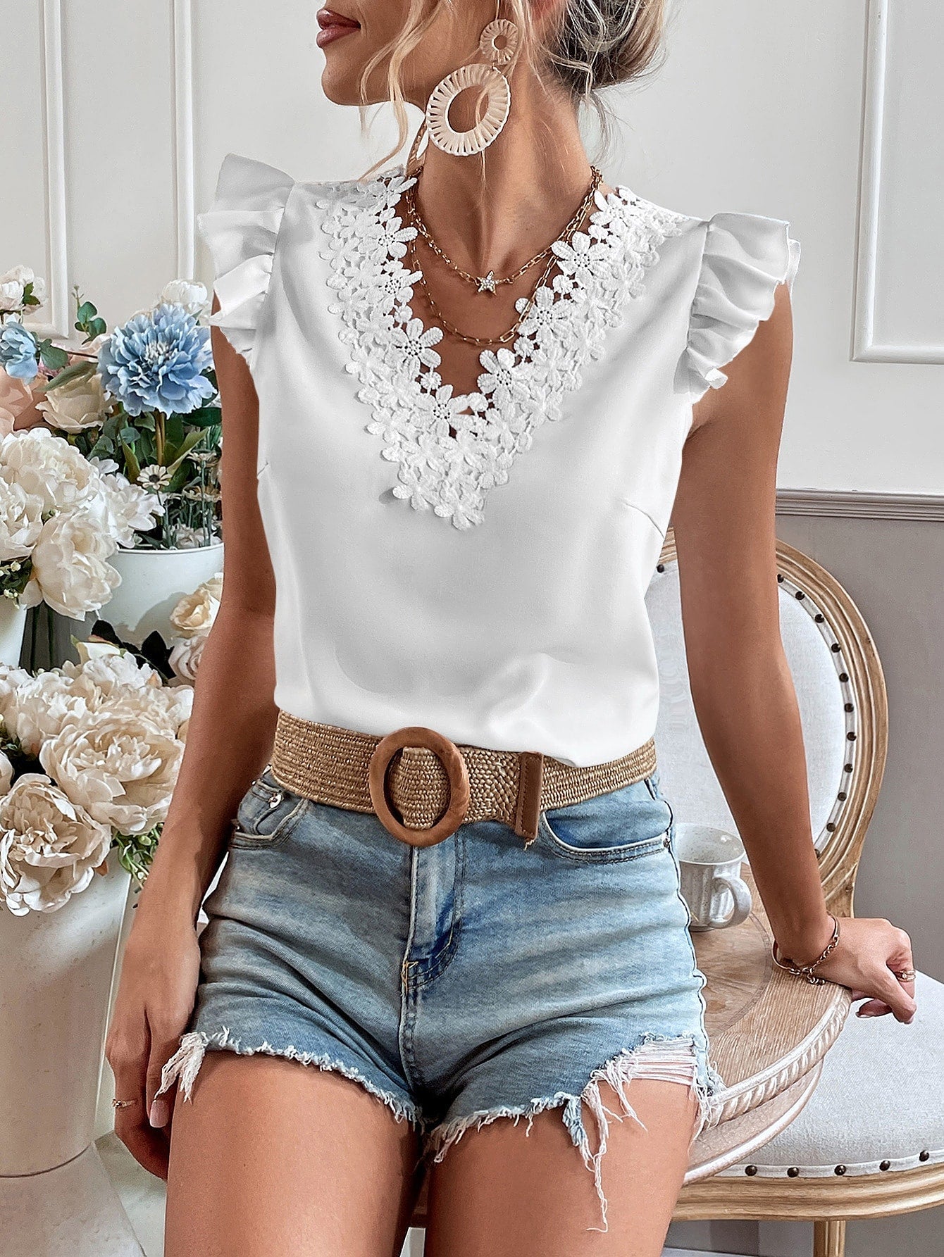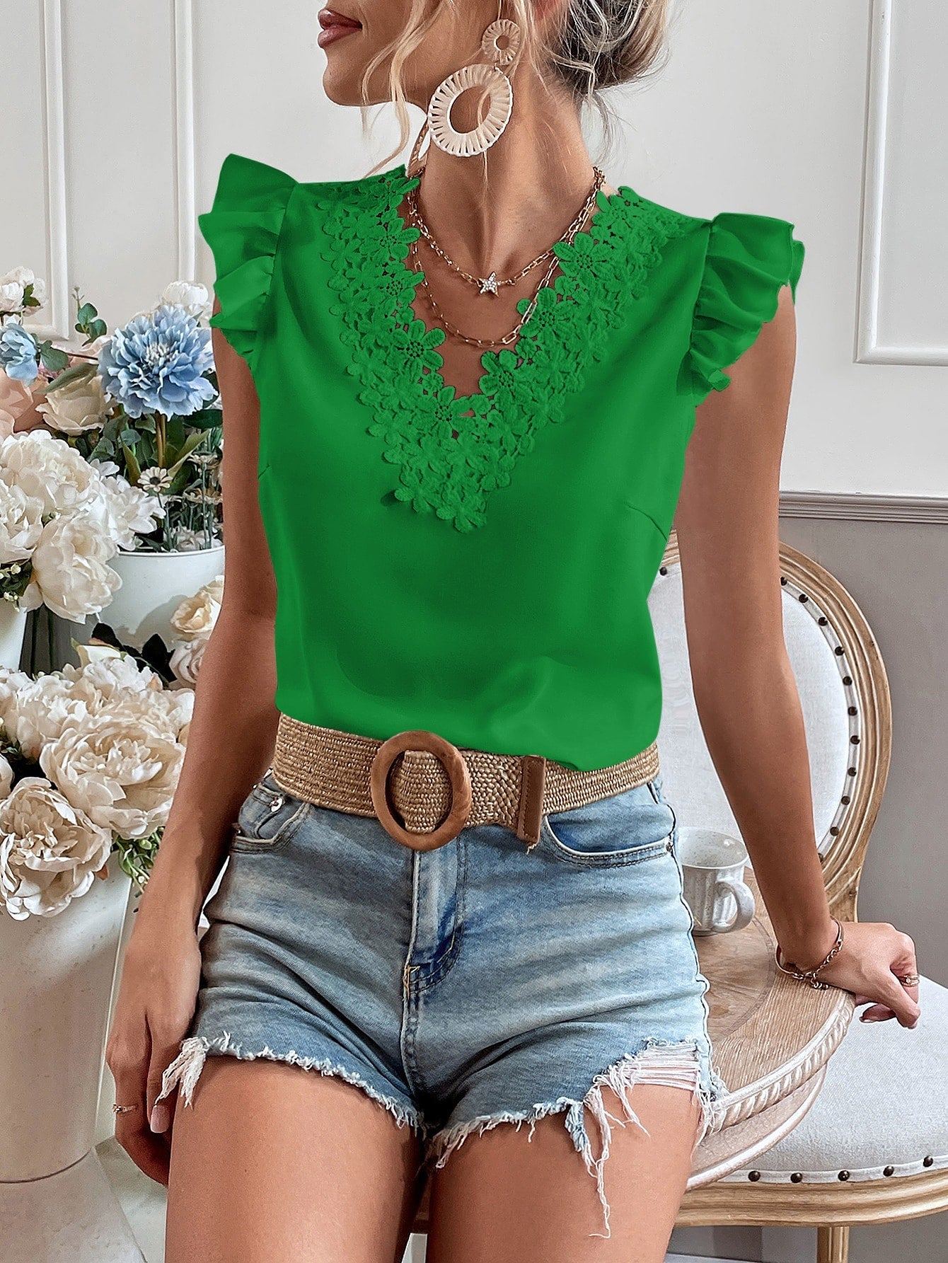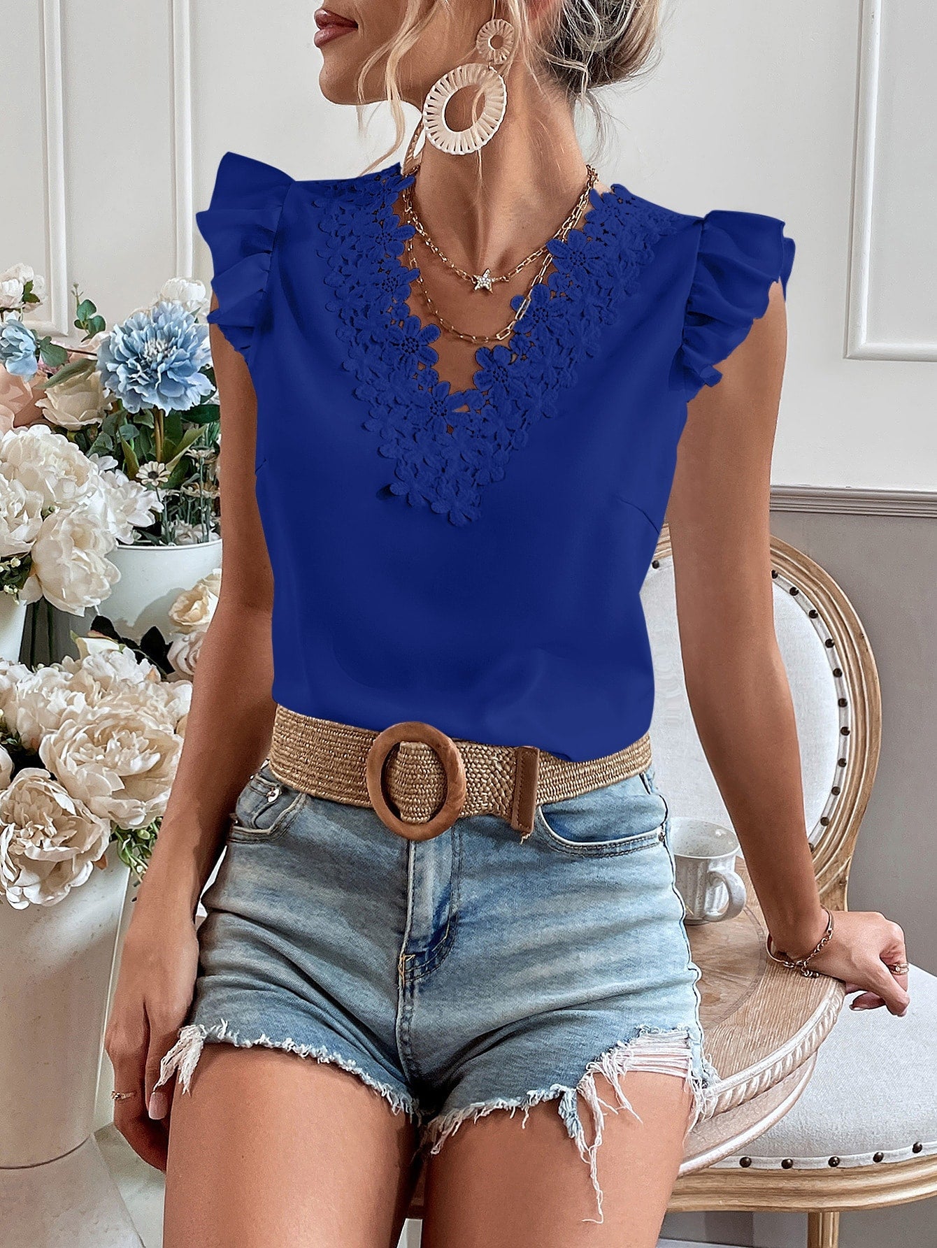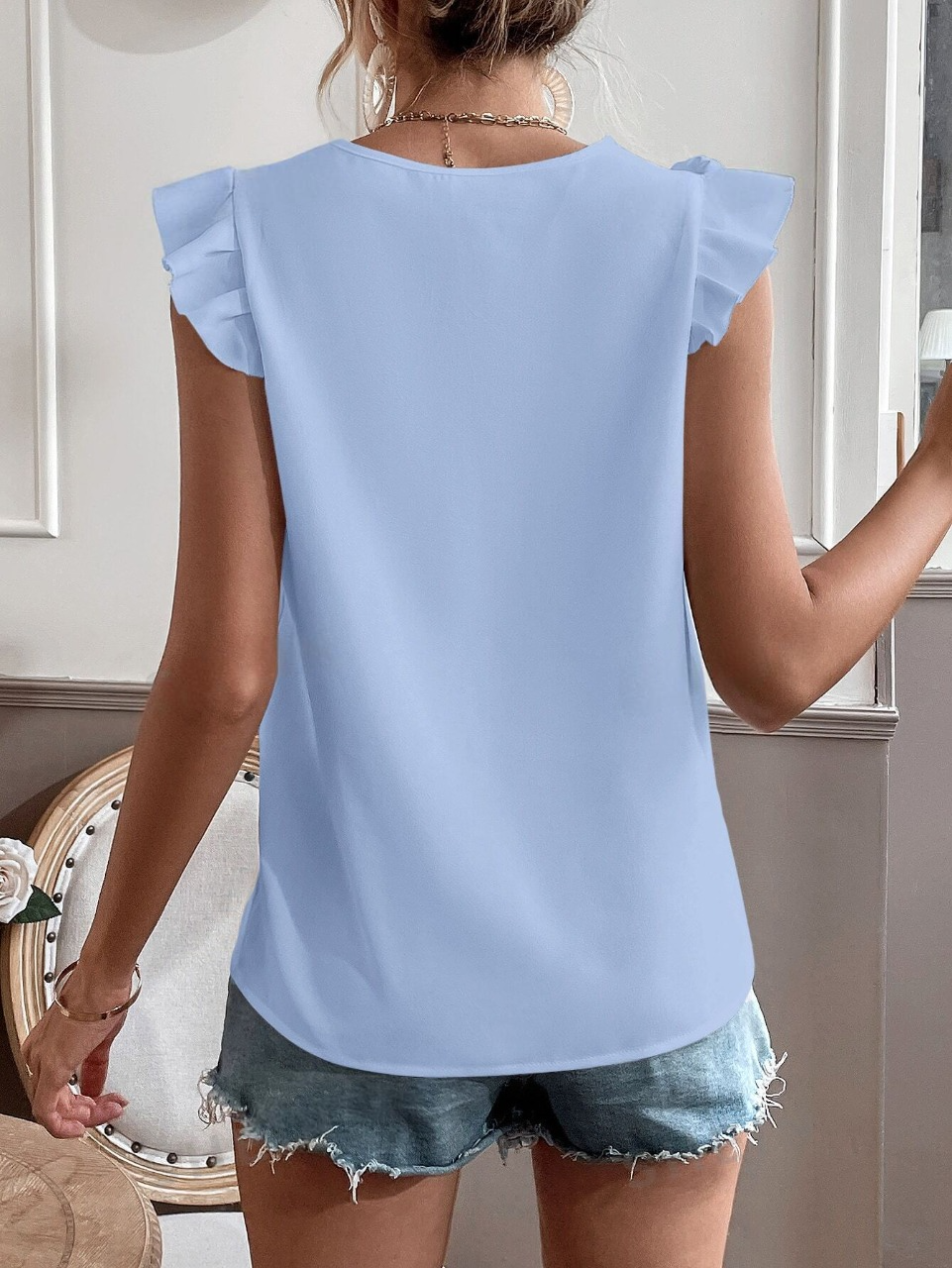 Colore : celesteStile : EleganteTipo di motivo : Colore unicoTipo : TopDettaglio : Volanti, Pizzo a contrastoLunghezza manica : Manica ad alettaScollatura : Scollatura a VTipo di manica : SvasataLunghezza...