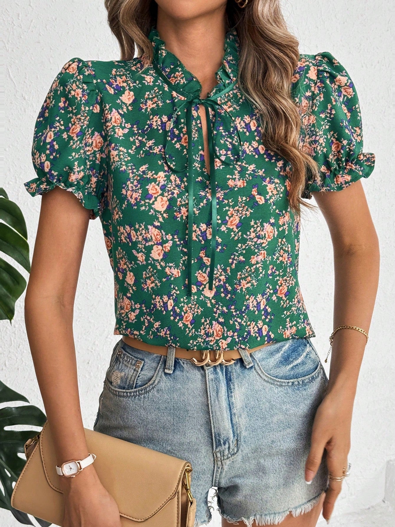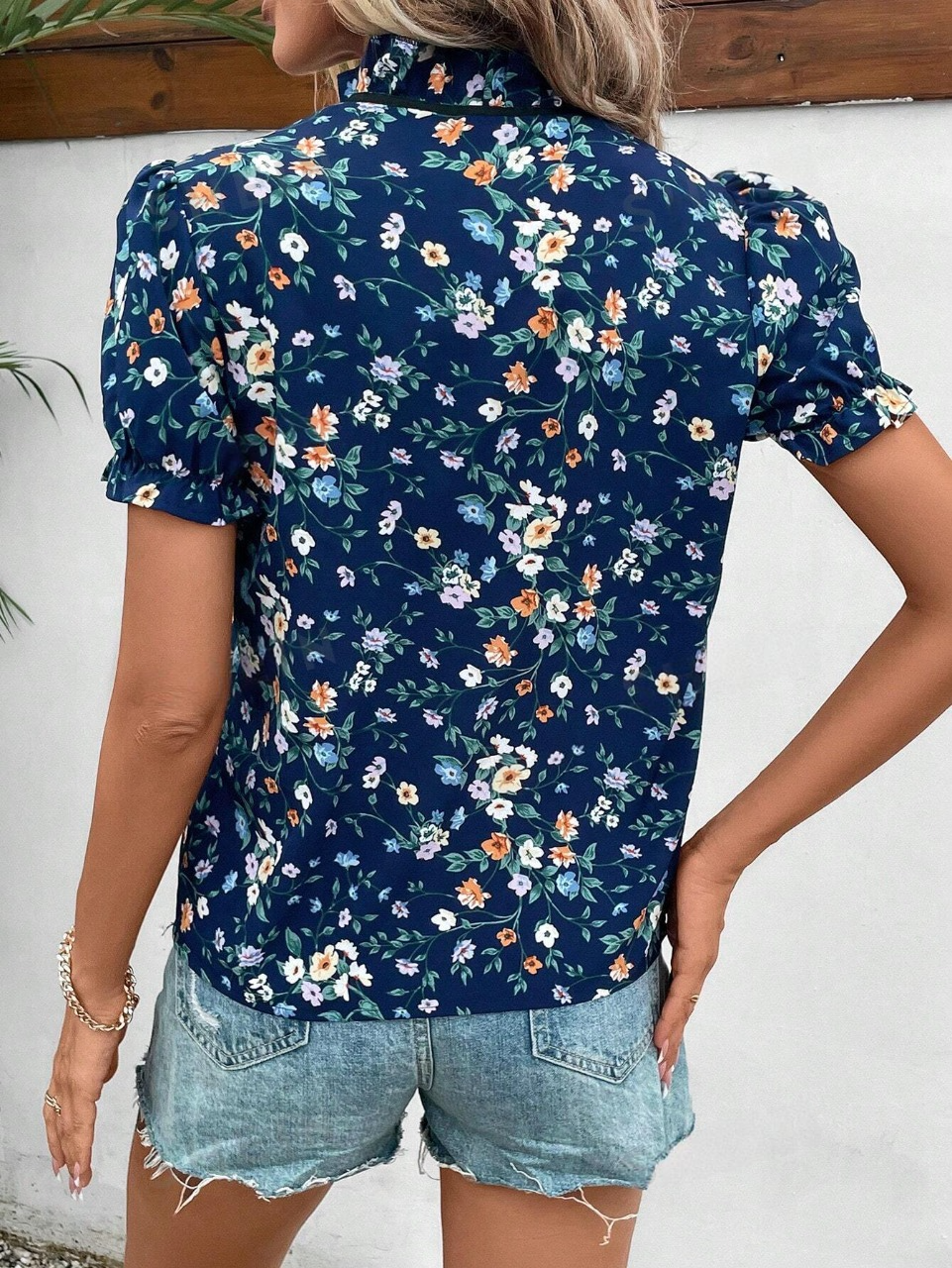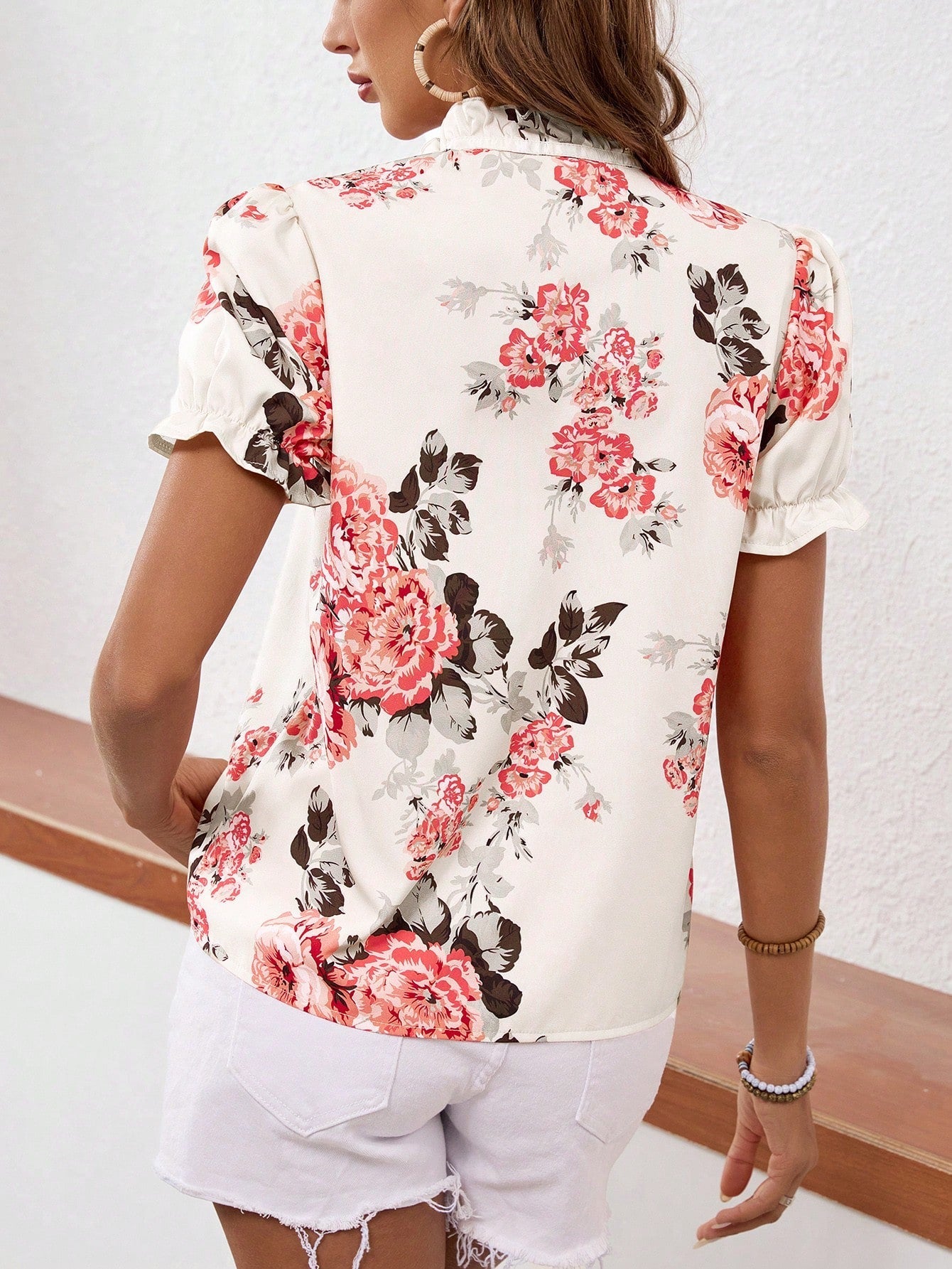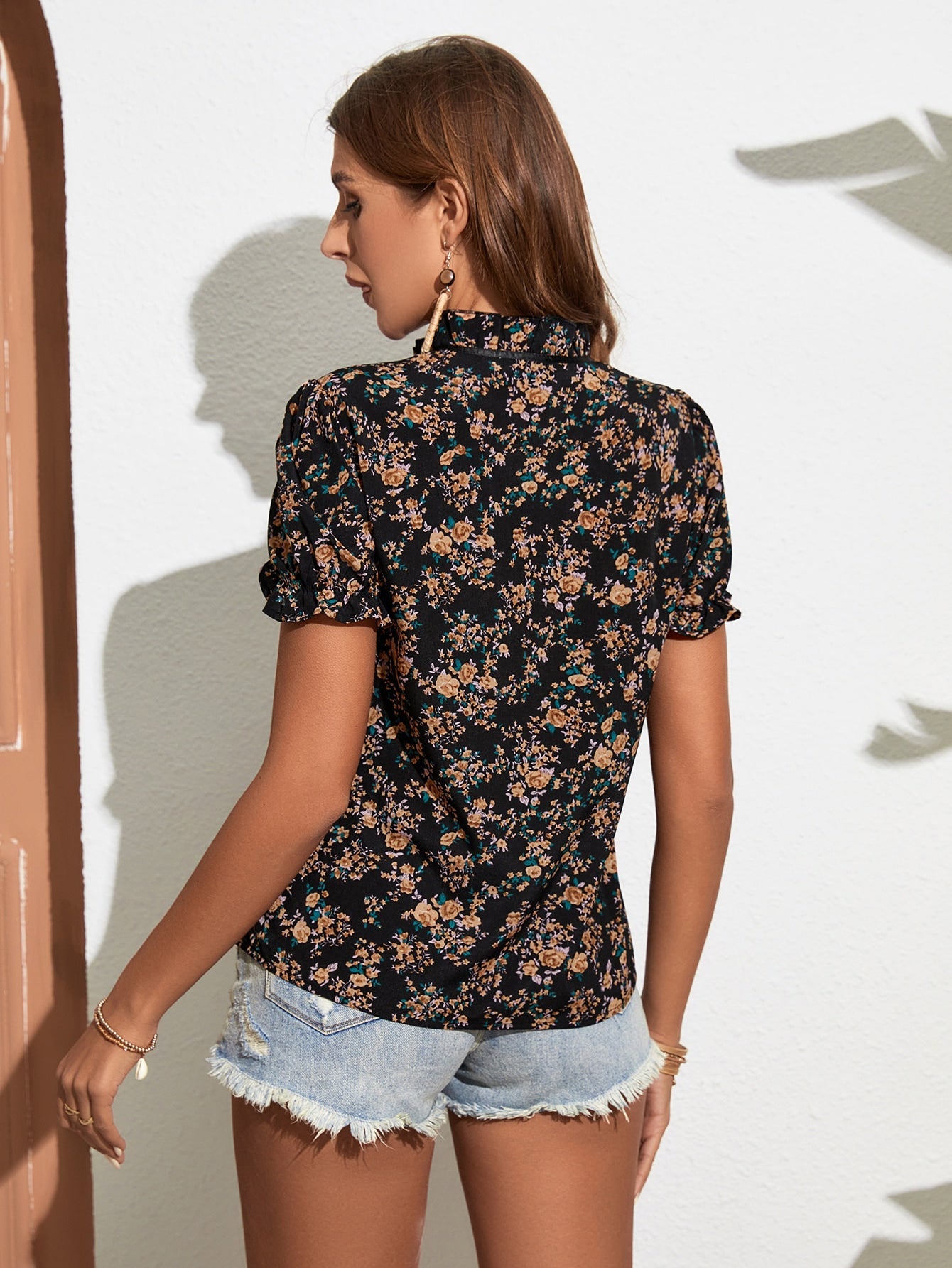 Camicetta con stampa floreale con cravatta al collo con manica a sbuffo