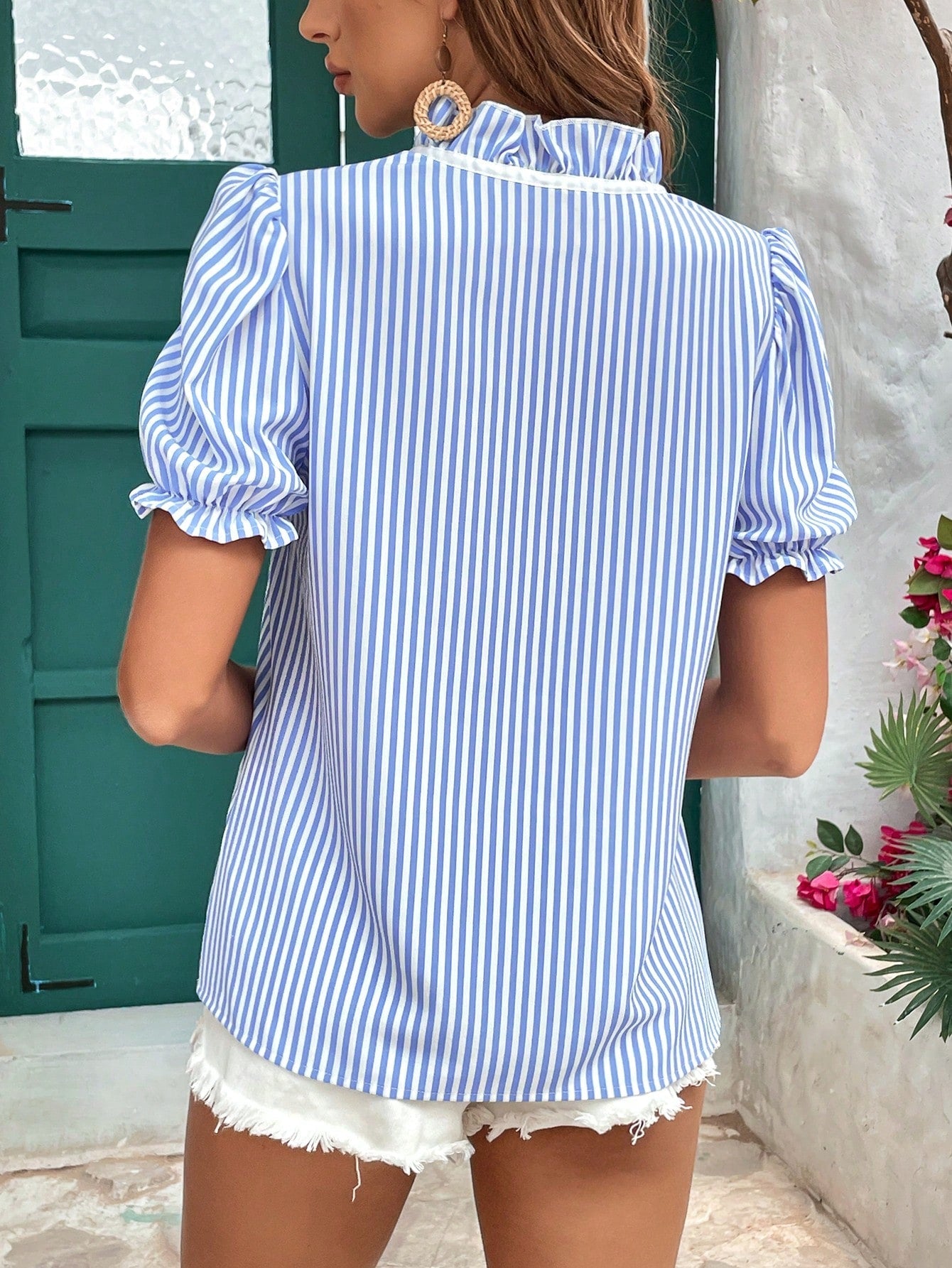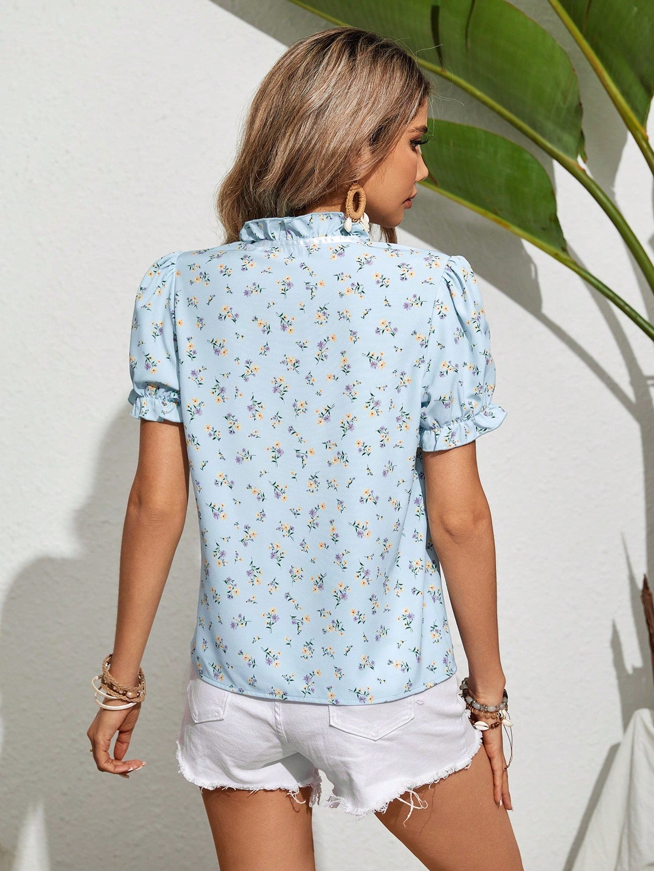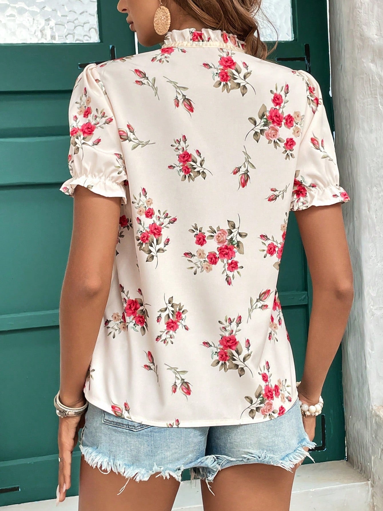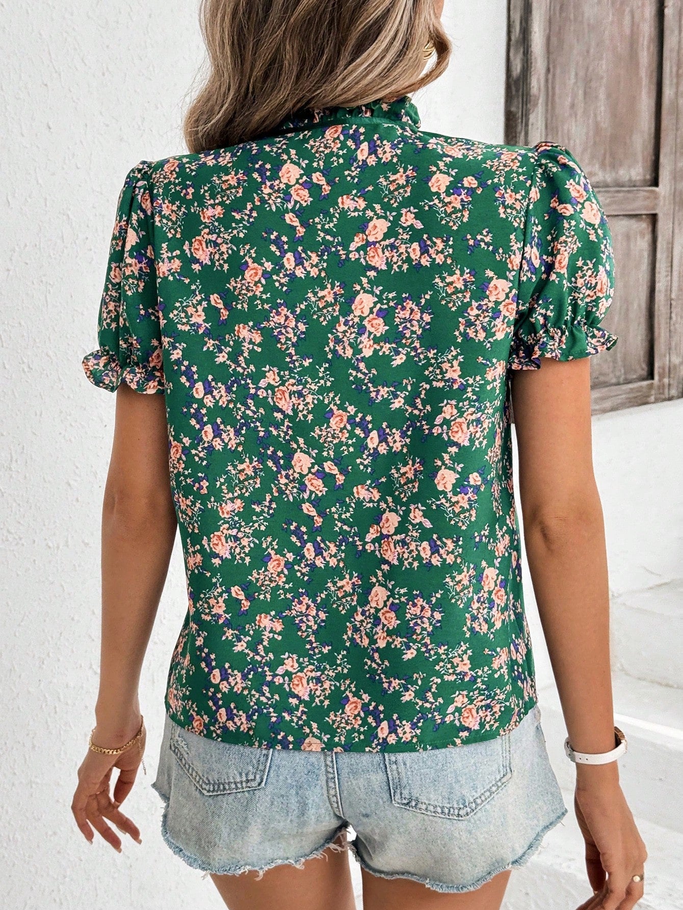 Camicetta con stampa floreale con cravatta al collo con manica a sbuffo