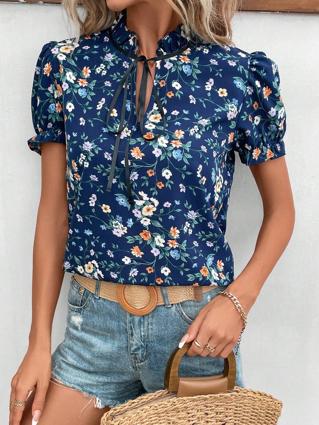 Colore : Blu Navy Stile : Bohemien Tipo di motivo : Floreale, stampa dappertutto Tipo : Top Dettaglio : Volanti, Nodo Lunghezza manica : Maniche Corte Scollatura : Nodo al...