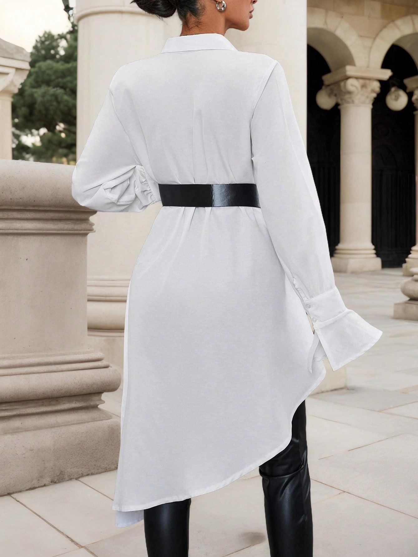 Stile : CasualDettaglio : CinturaTipo di motivo : Colore unicoTipo : CamiciaColore : BiancoOrlo/ Forma : AsimmetricoTipo di manica : Manica svasataScollatura : Colletto risvoltoLunghezza manica : Manica lungaLunghezza :...