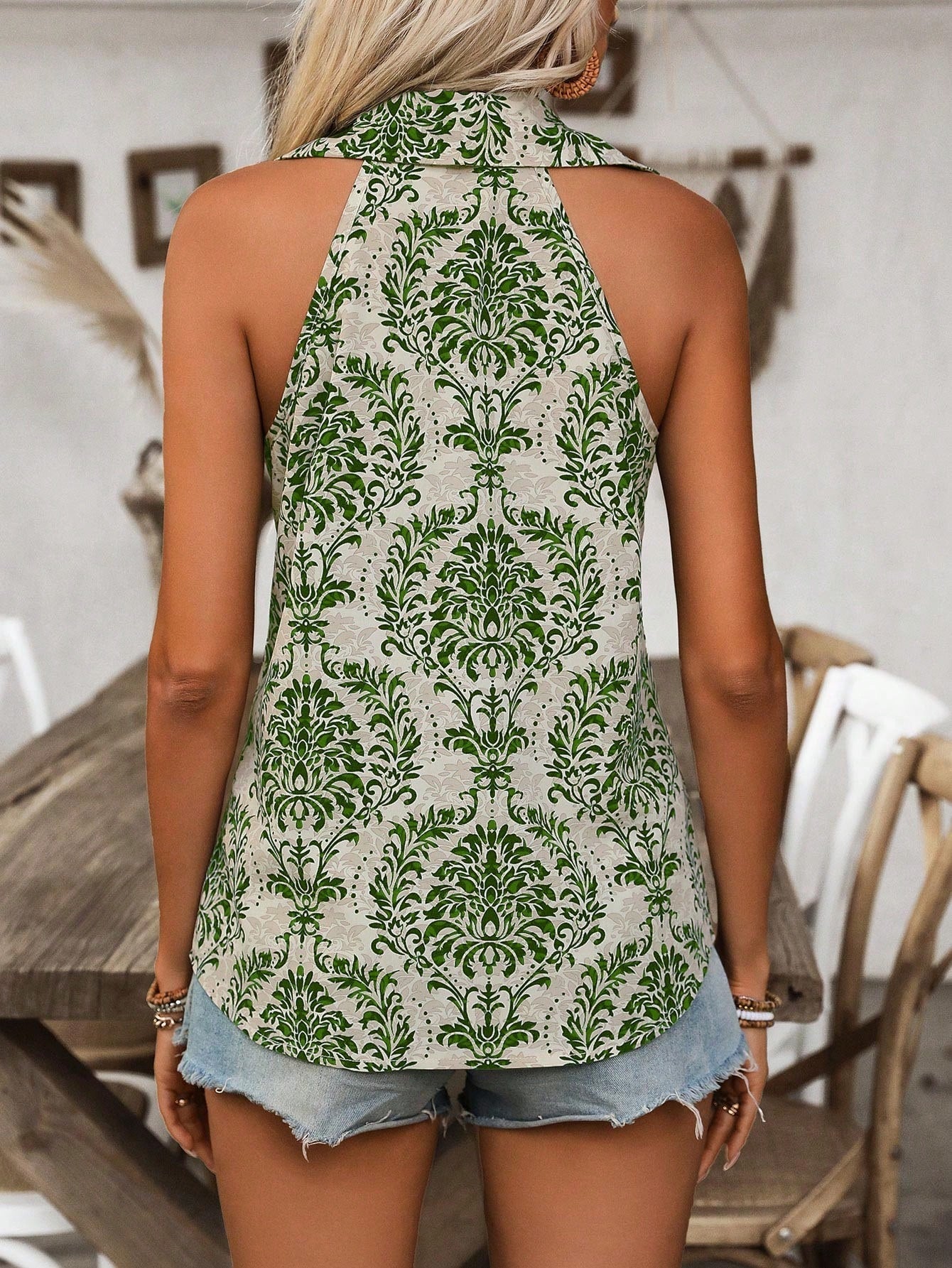 Camicia senza maniche casual estiva stampata con colletto e bottoni per le vacanze delle donne