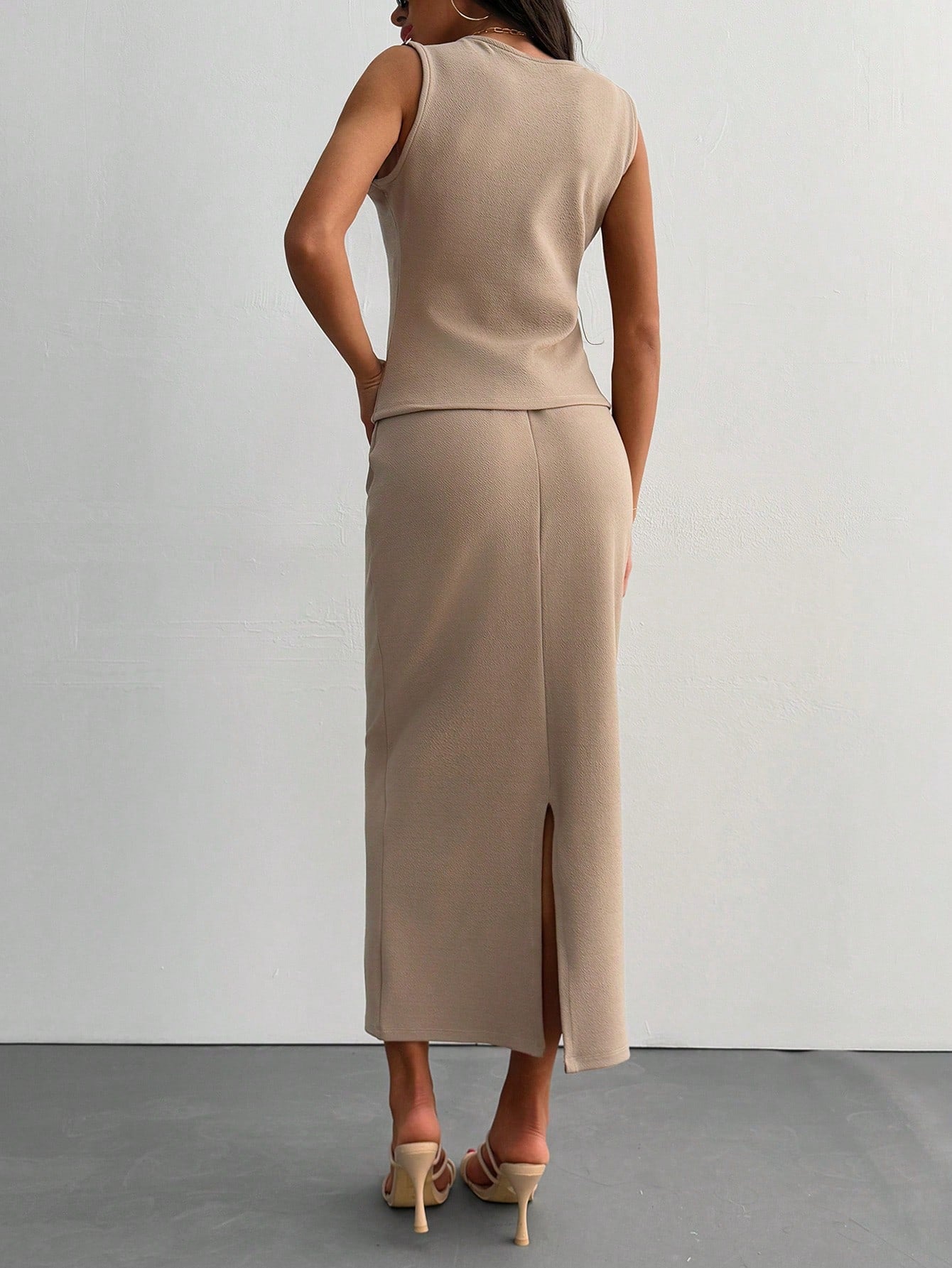 Completo coordinato di gilet con scollo quadrato e bottoni dorati e gonna