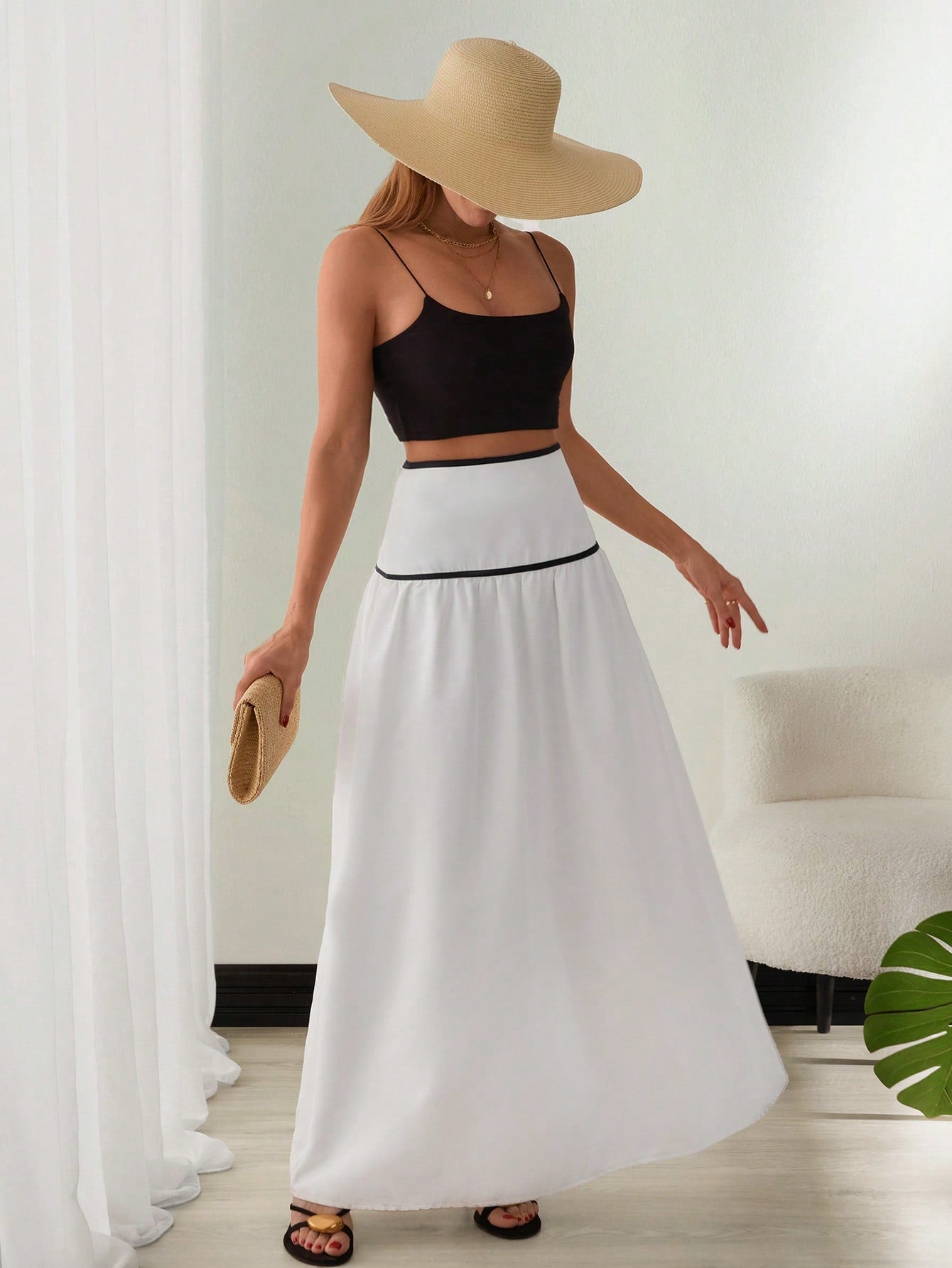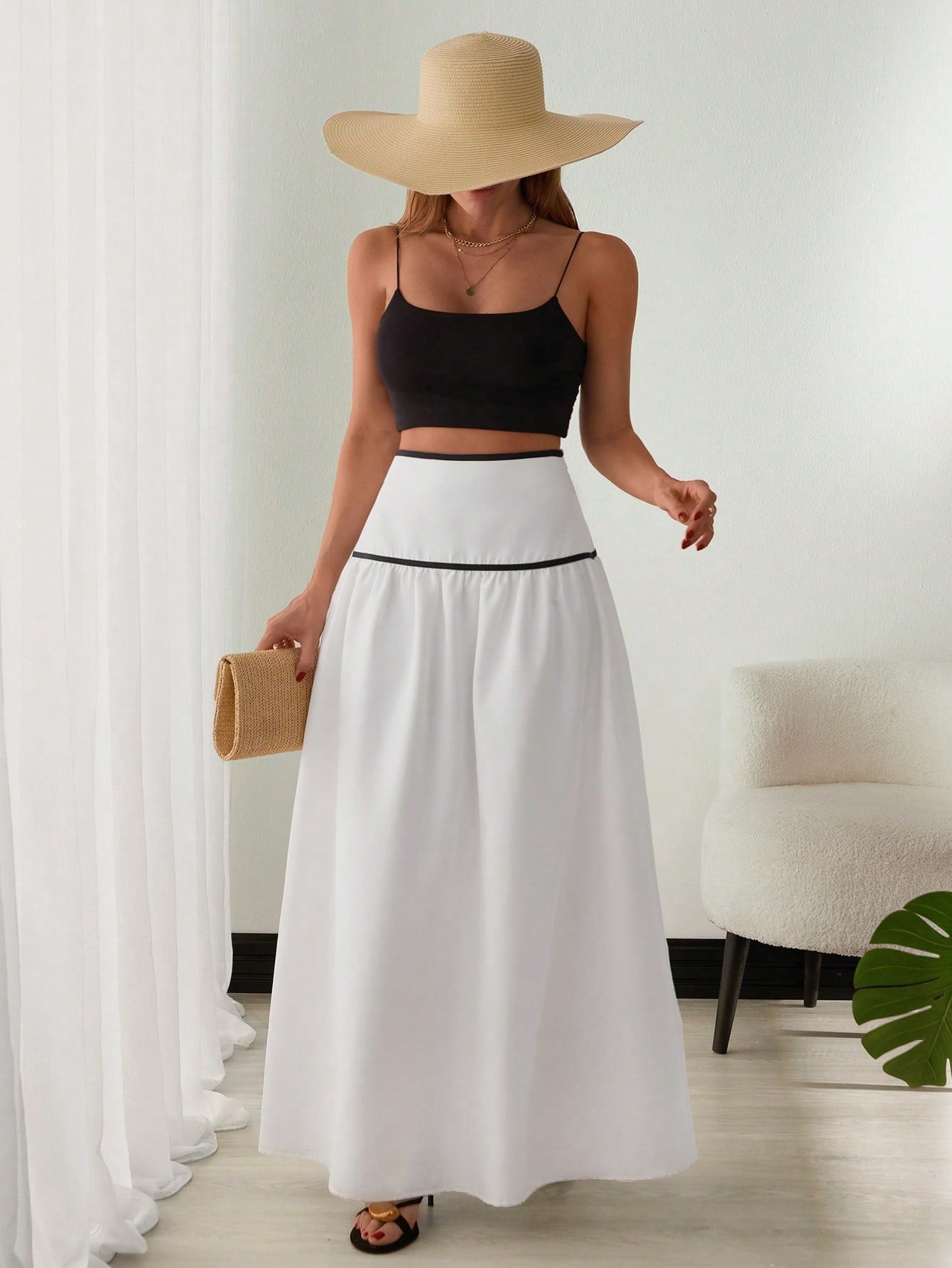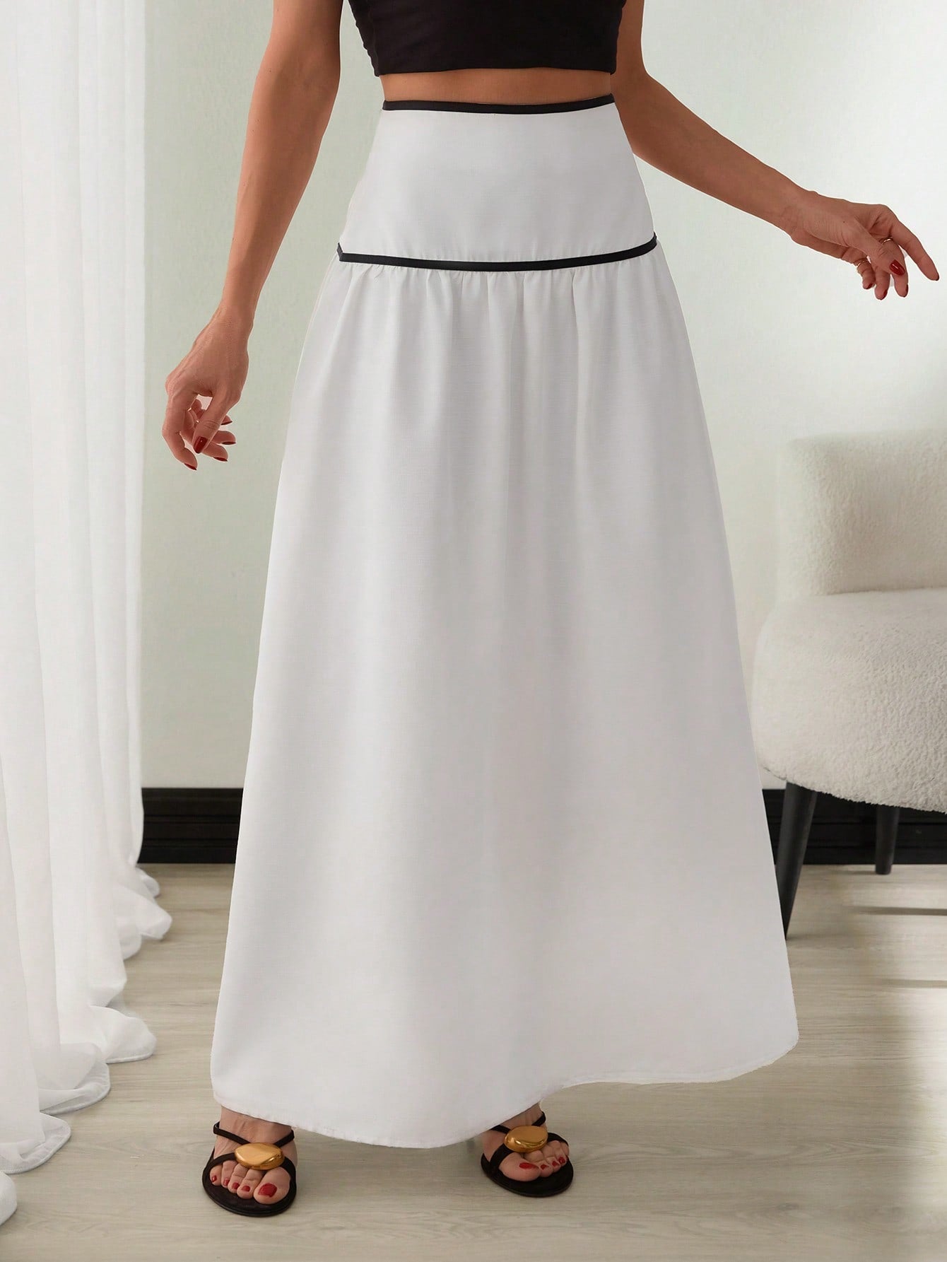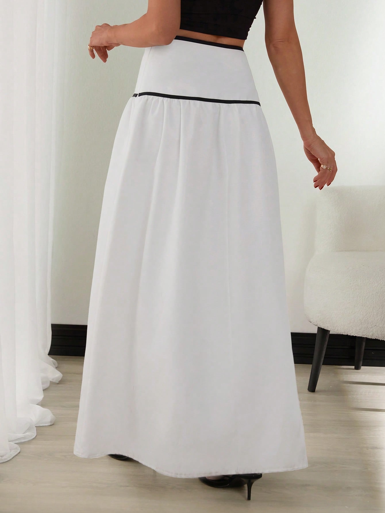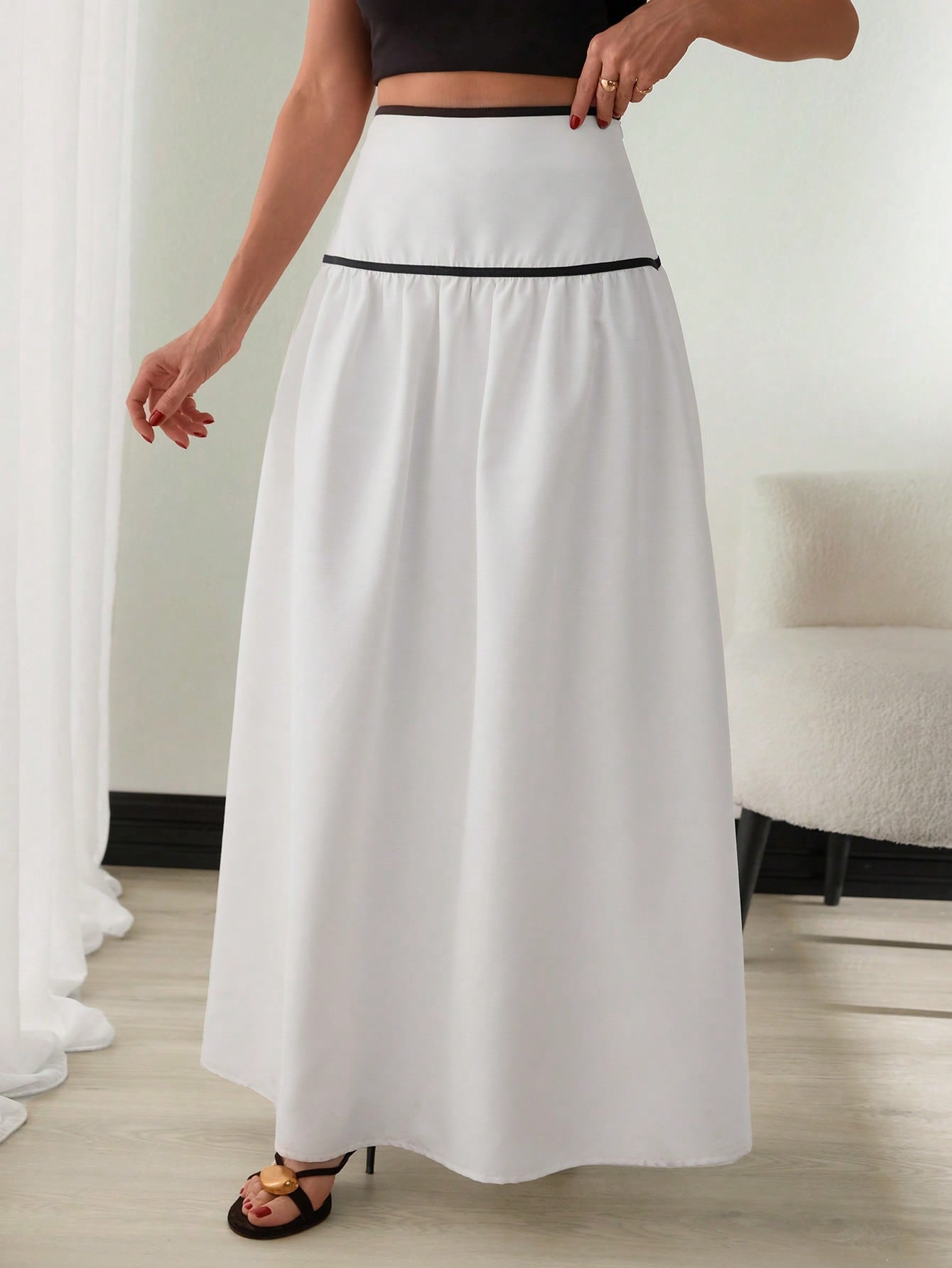 Gonna lunga bianca vita alta, con dettaglio borchiato, profili a contrasto neri, in misto cotone
