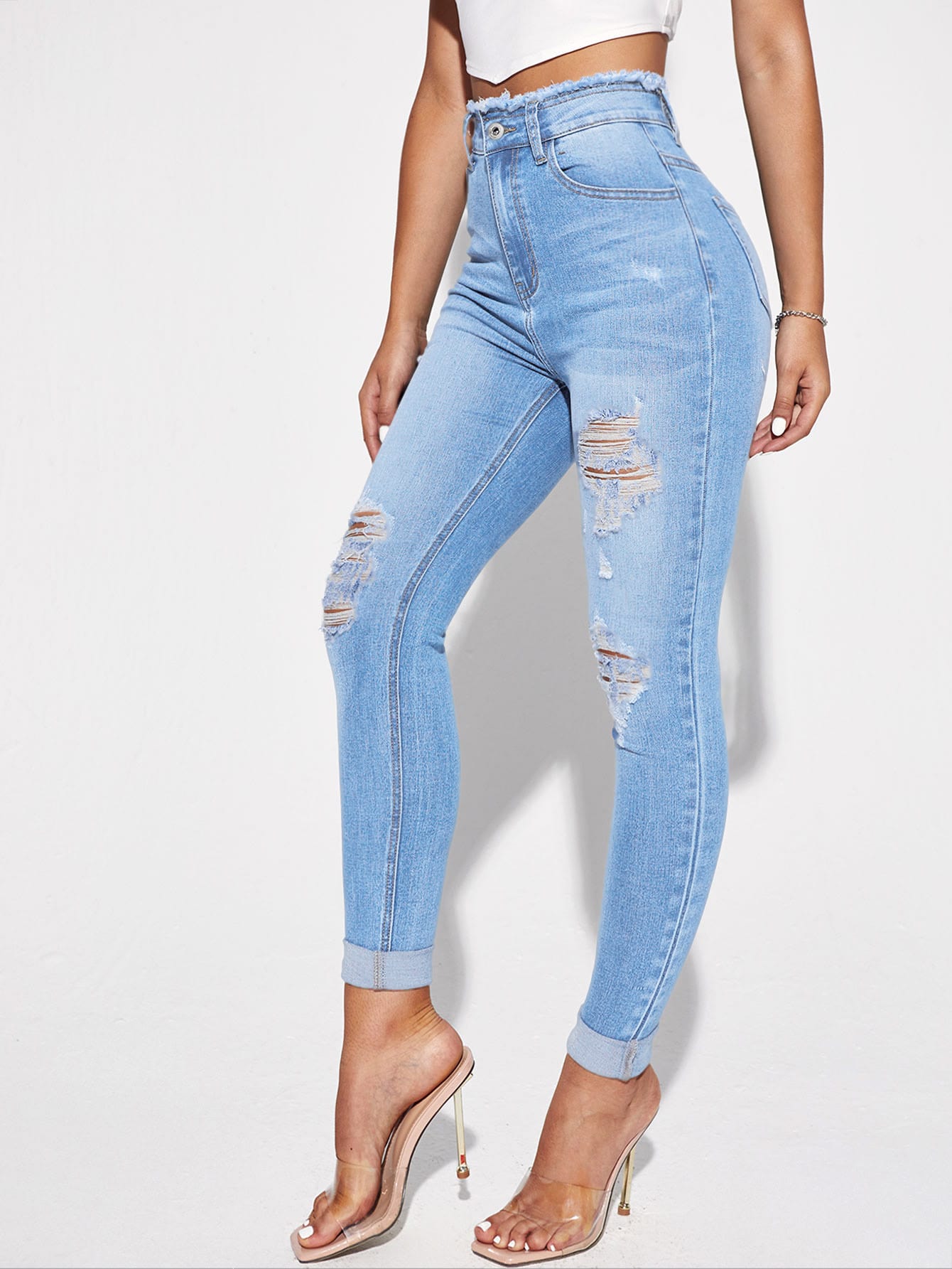 Jeans skinny strappati con vita alta