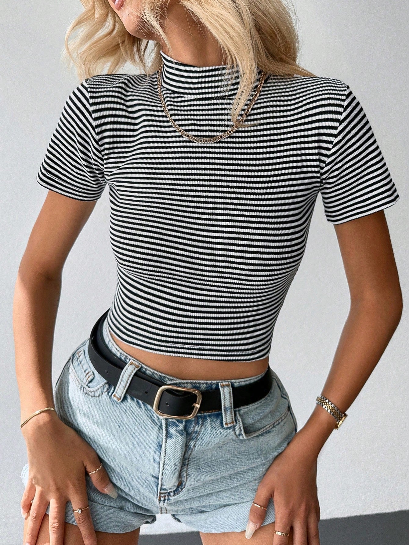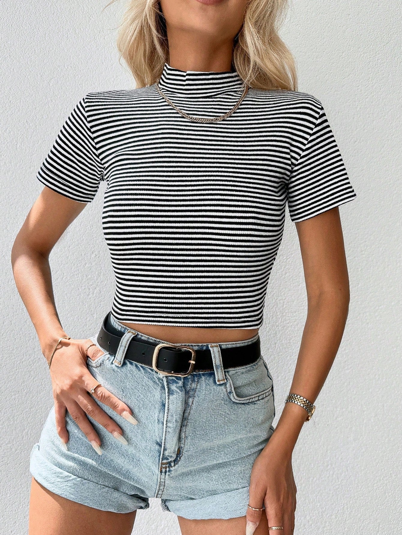 Orlo/ Forma : AsimmetricoTipo di motivo : A strisceTipo di manica : ClassicaColore : Bianco e neroDettaglio : Lacci, Schiena scoperta, Spalline incrociateStile : CasualScollatura : Collo altoLunghezza manica :...