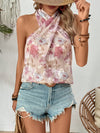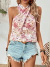 Maglietta estiva senza maniche, con incrocio di alle spalle e stampa floreale per donna