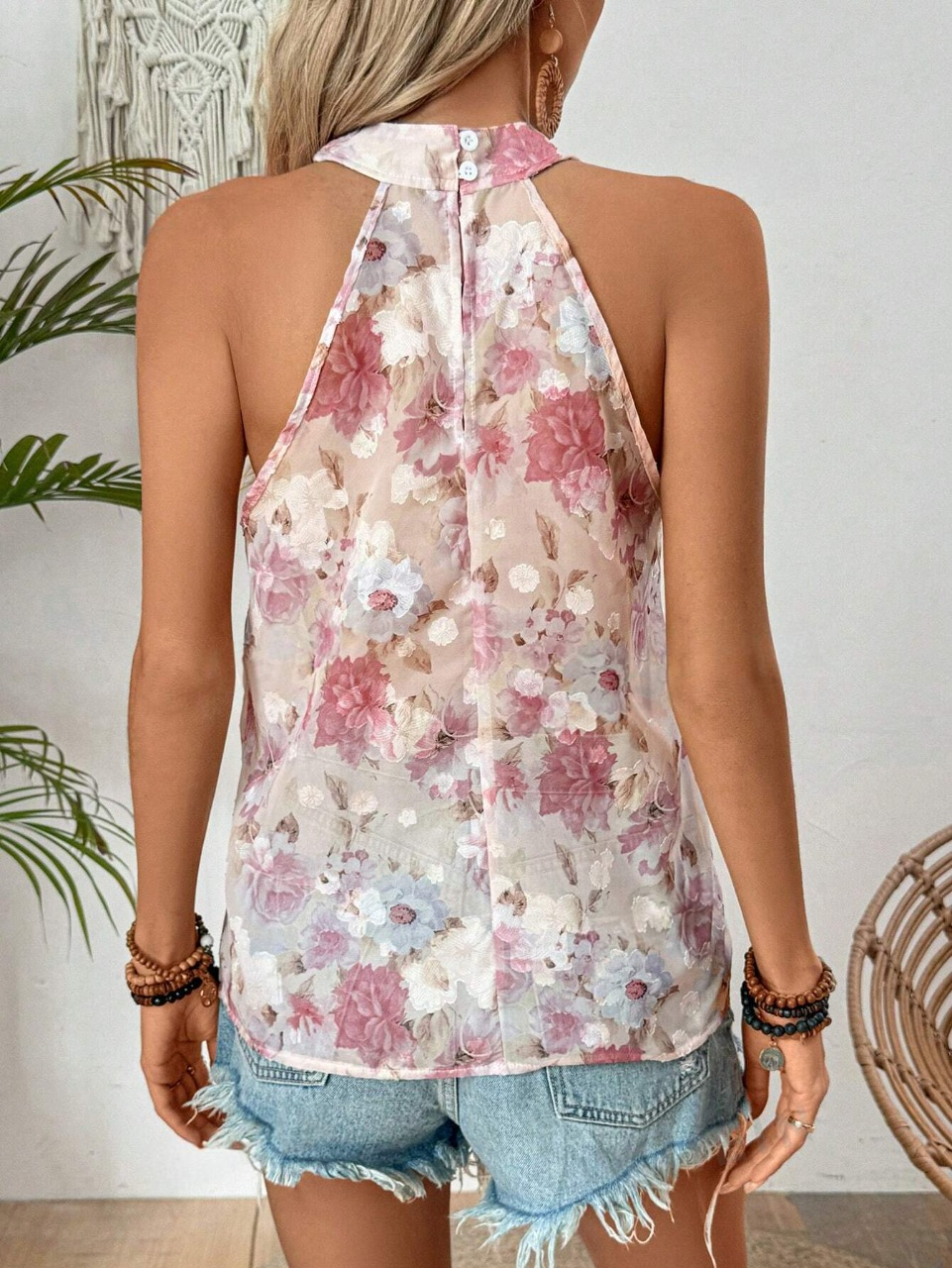 Maglietta estiva senza maniche, con incrocio di alle spalle e stampa floreale per donna