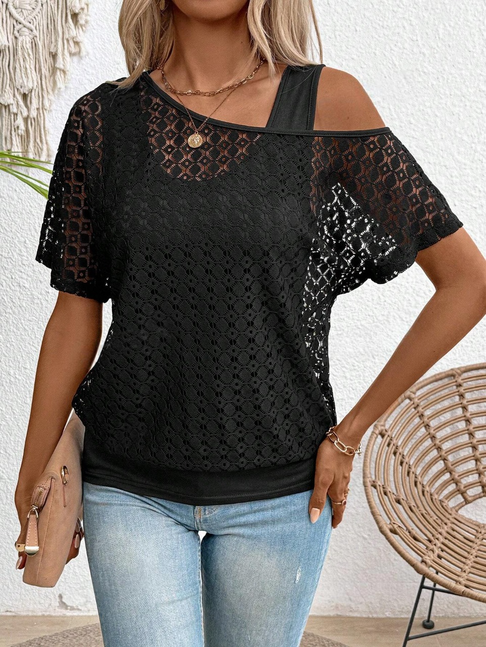 Maglietta estiva trasparente ampia in pizzo con scollatura asimmetrica per signore