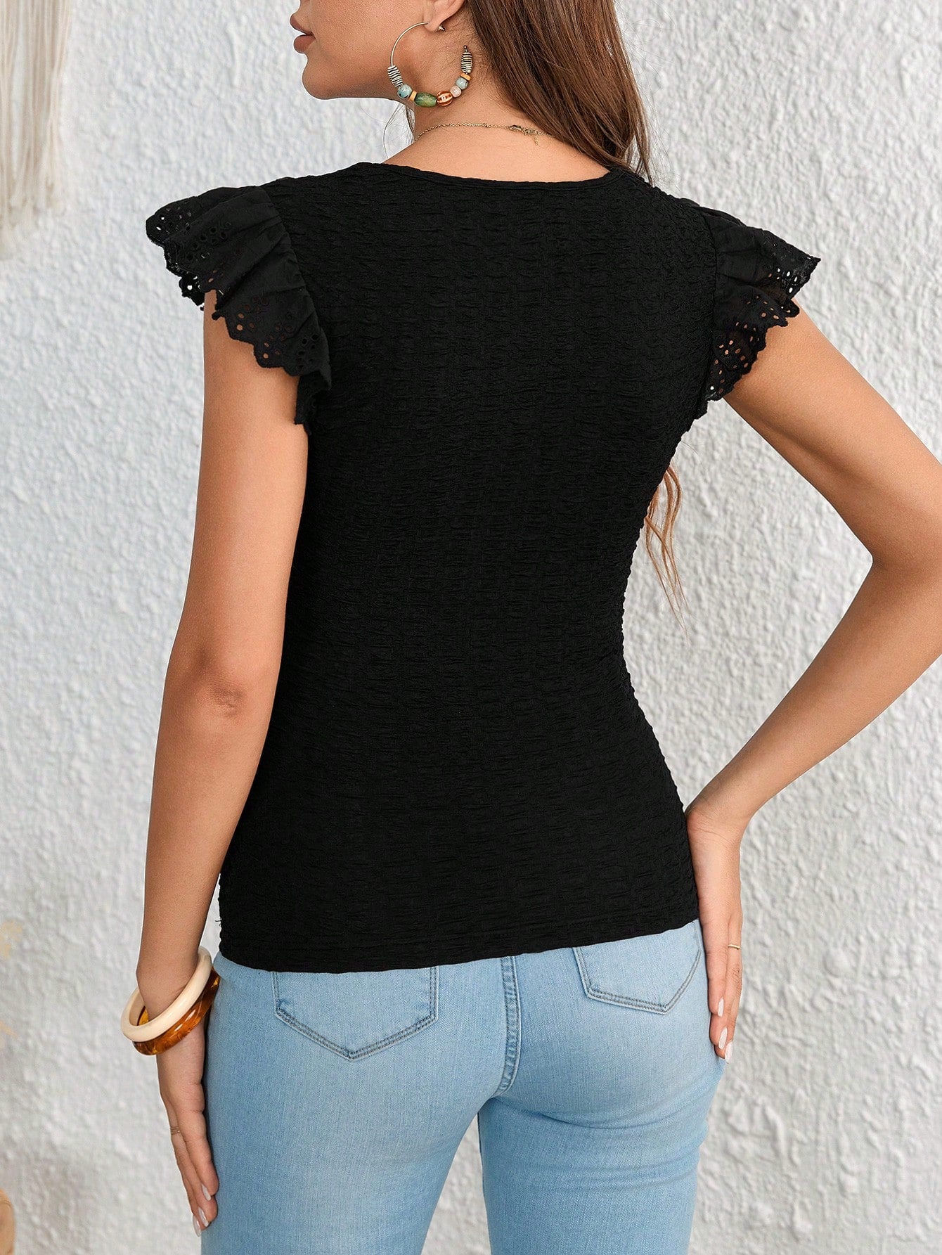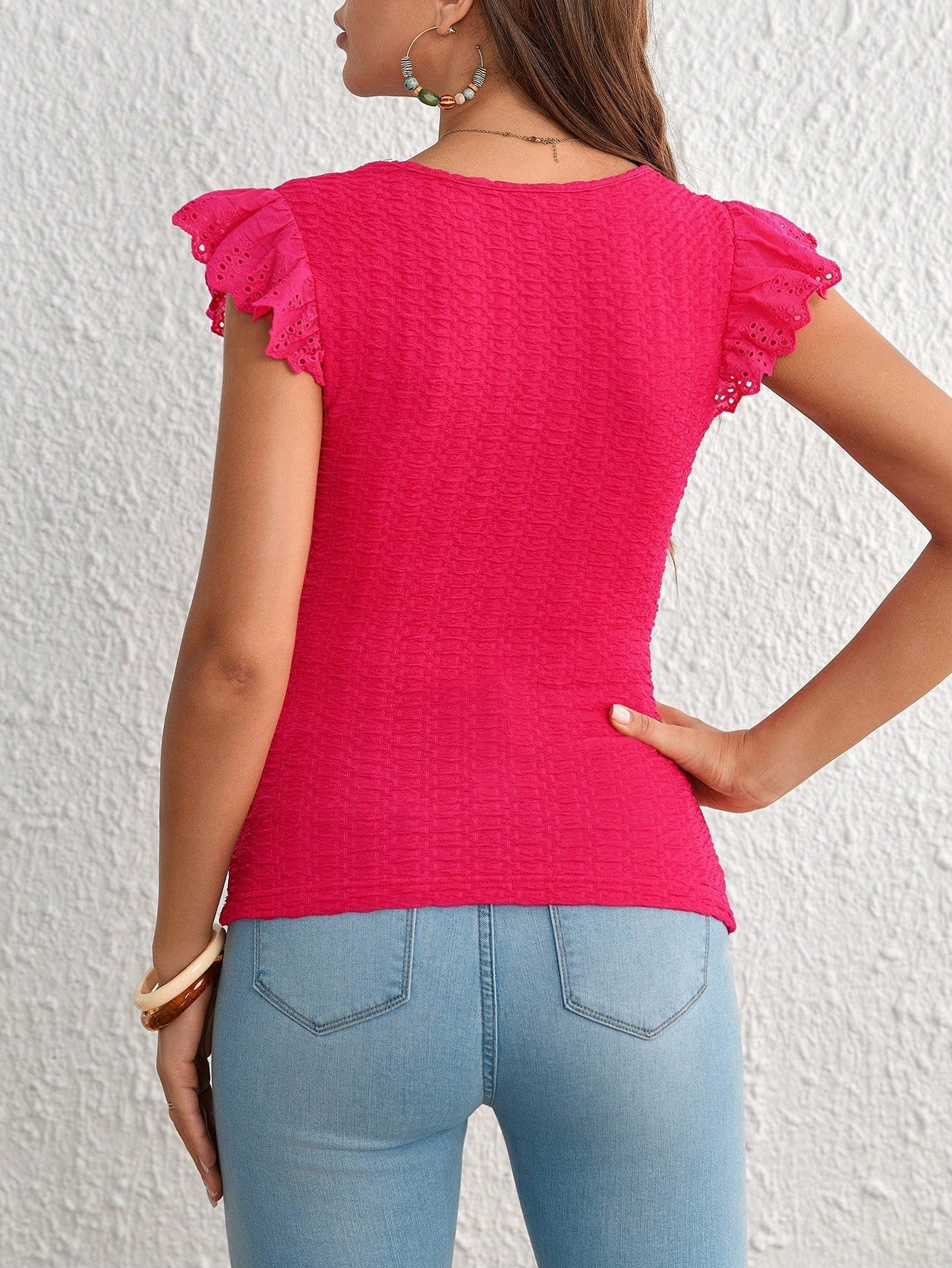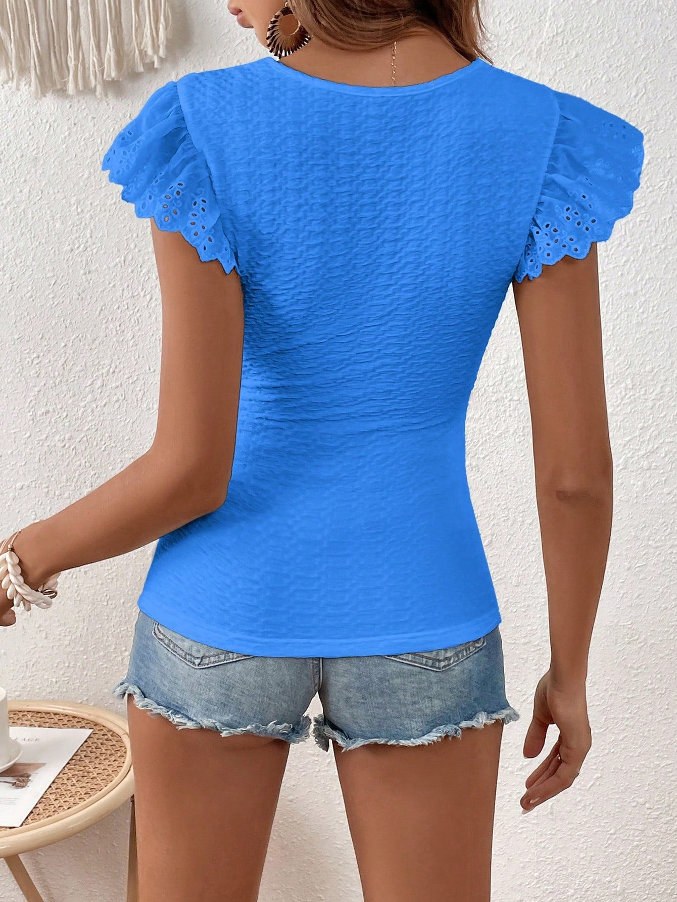 Maglietta pizzo a contrasto manica a farfalla con orlo smerlato