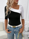 Maglietta slim fit asimmetrica da donna con collo a blocchi di colore nero e bianco