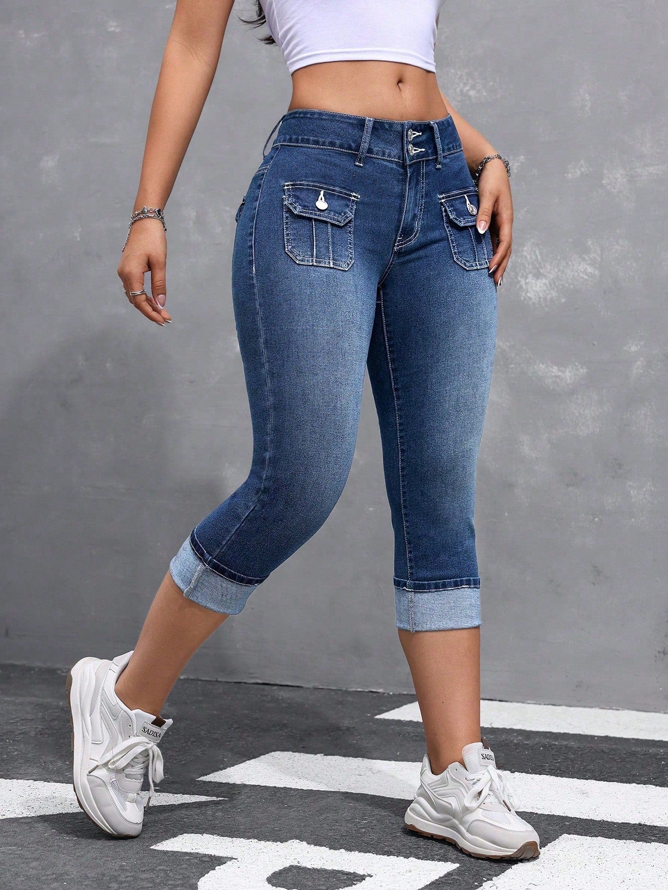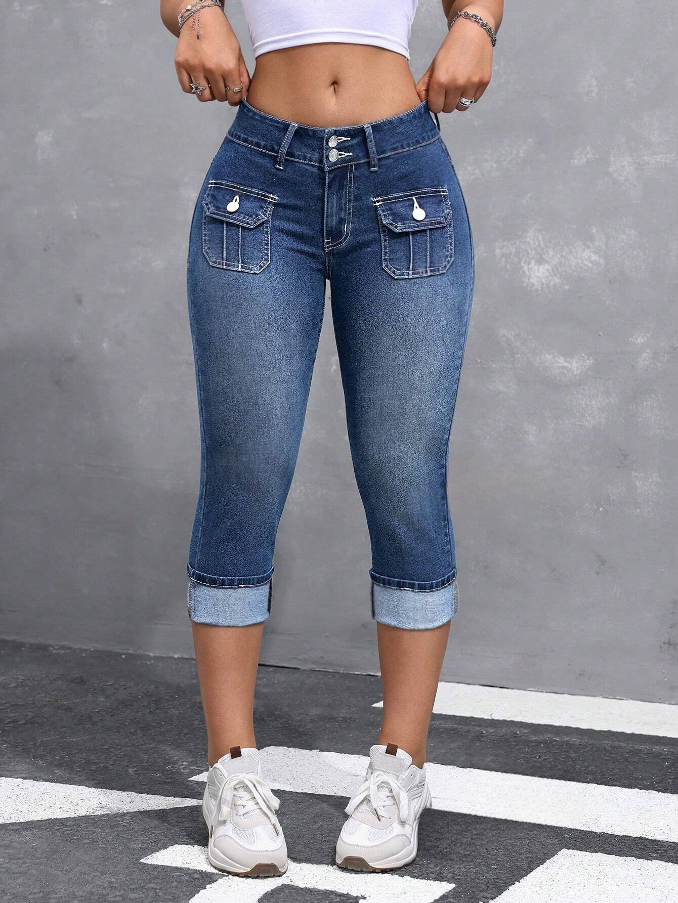 Pantaloni in denim casual a sette punte con orlo ripiegato e tasche, da donna
