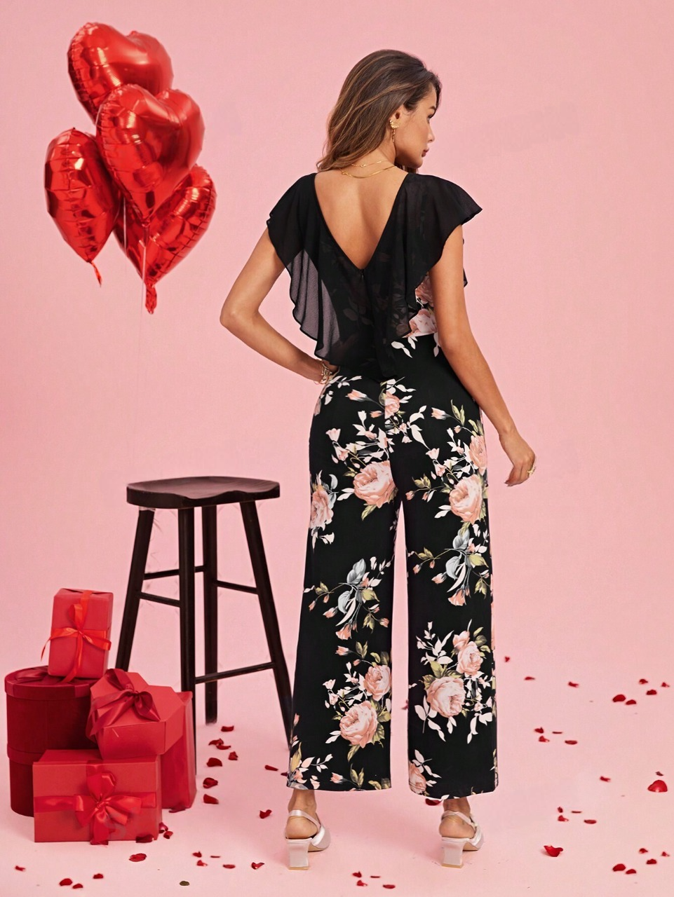Colore : Multicolore Stile : Bohemien Tipo di motivo : Floreale Tipo : Pantaloni larghi Scollatura : Scollatura a V Dettaglio : Volanti, Schiena scoperta, Cerniera Lunghezza manica : Maniche...