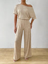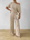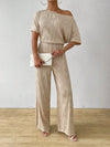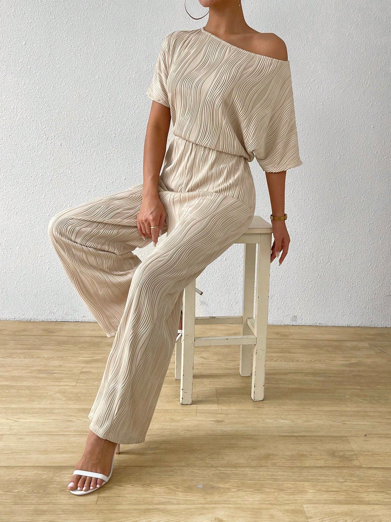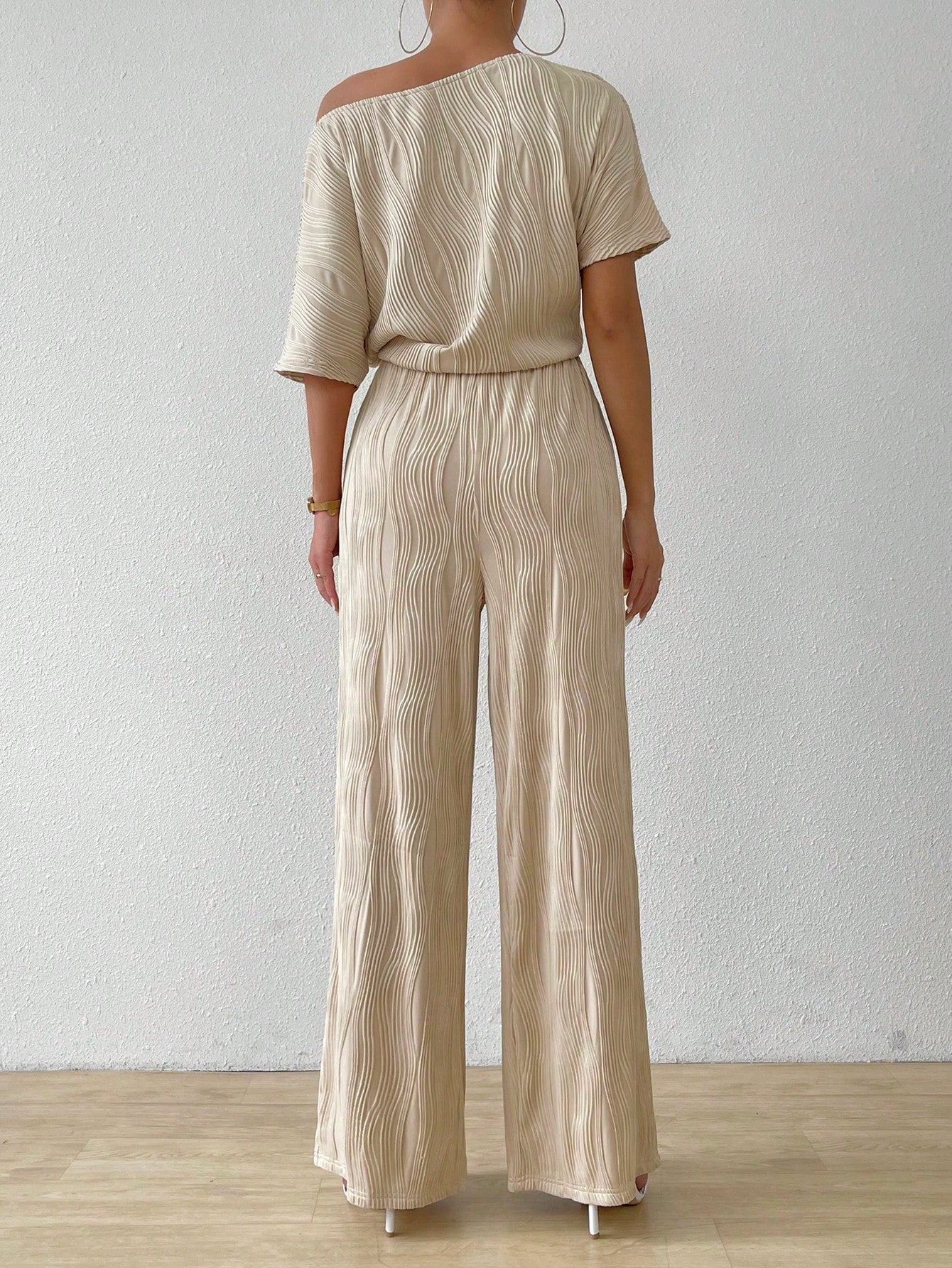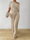 Salopette a gamba larga in colore solido estivo da donna con manica corta a pipistrello e collo asimmetrico