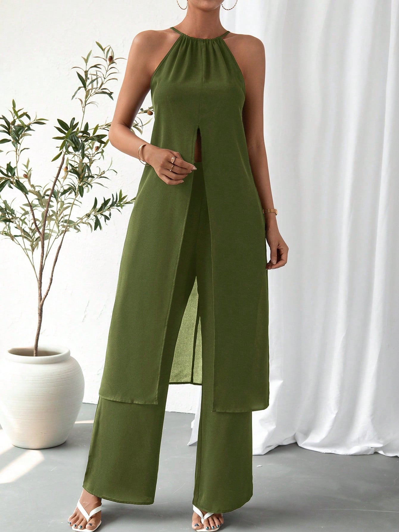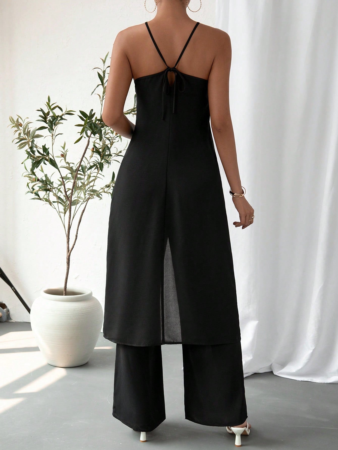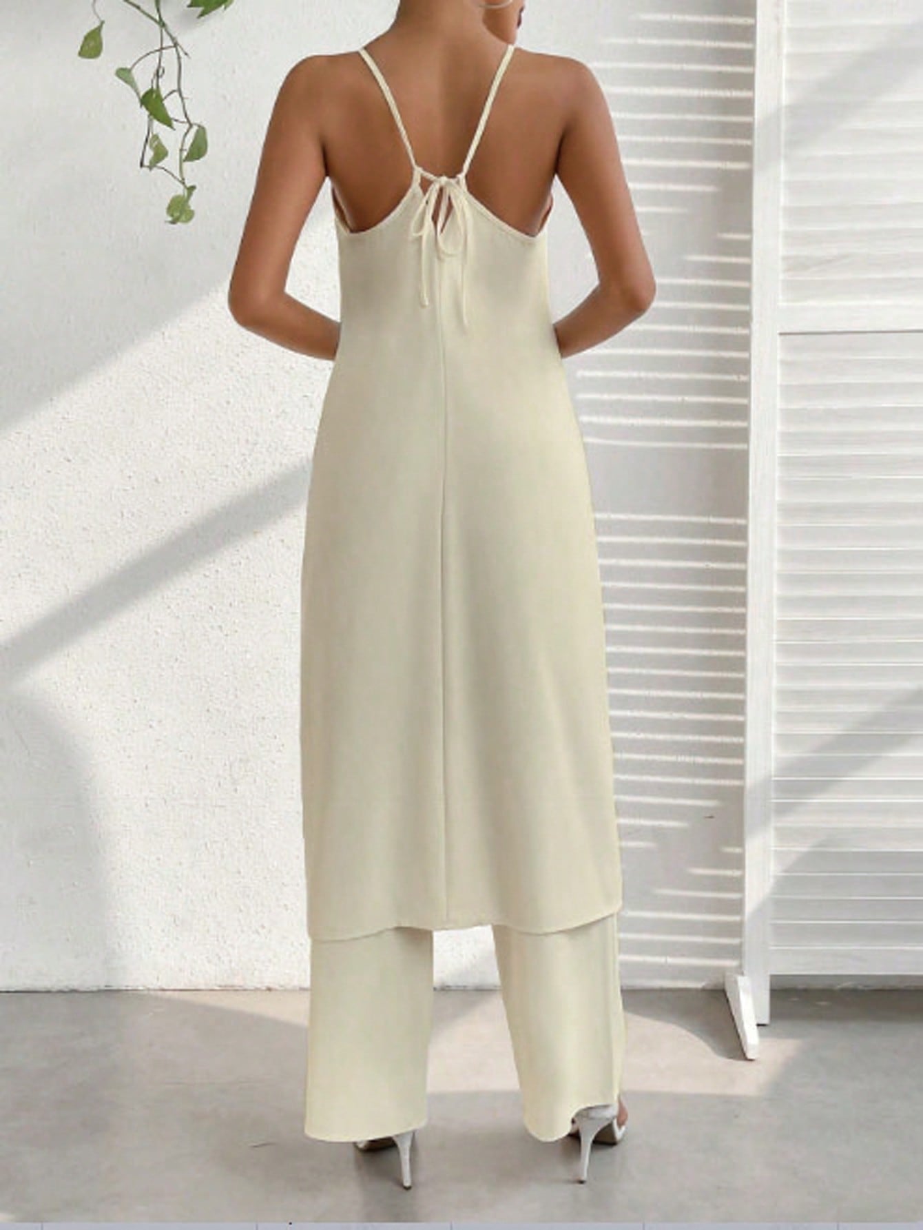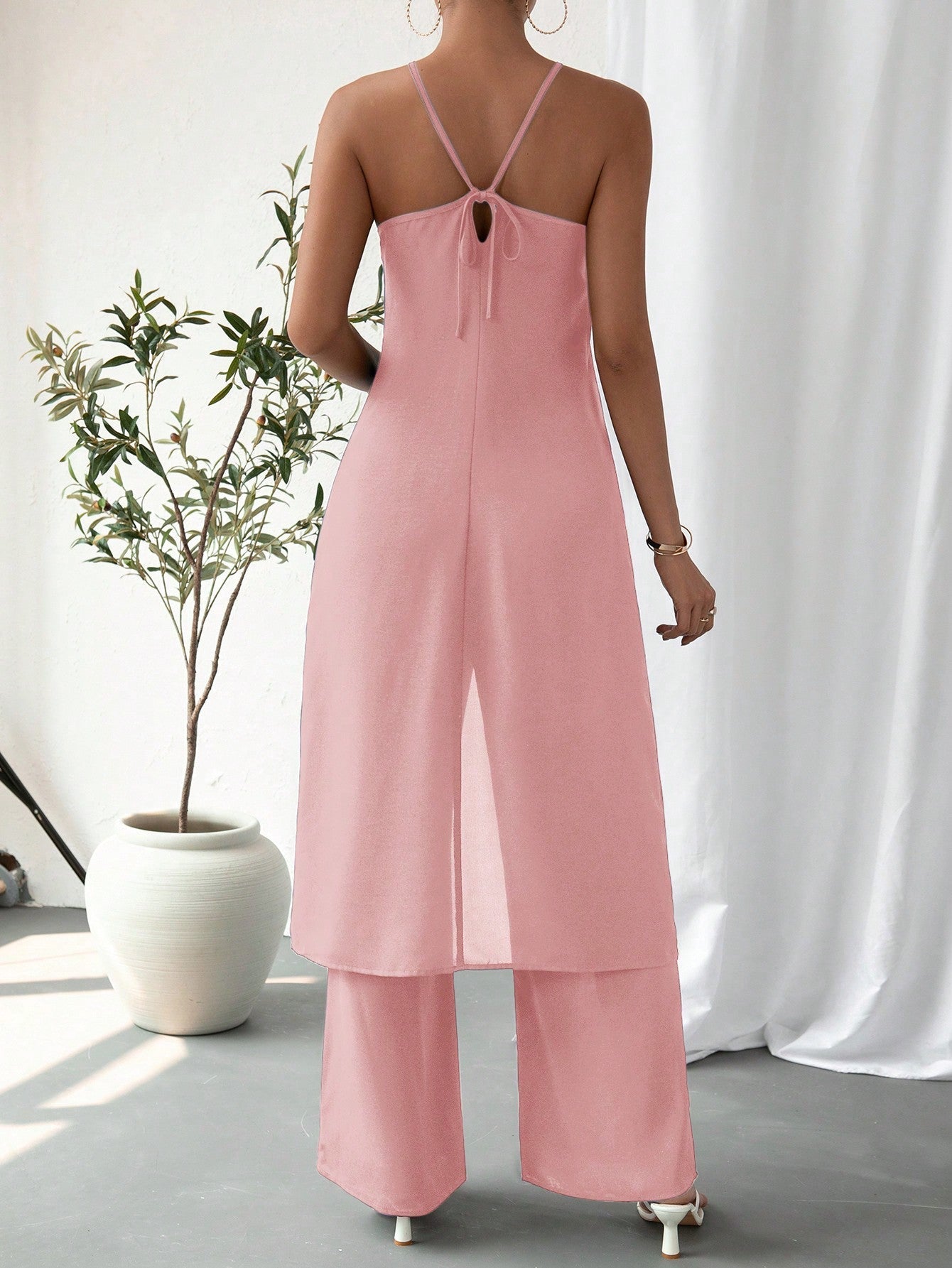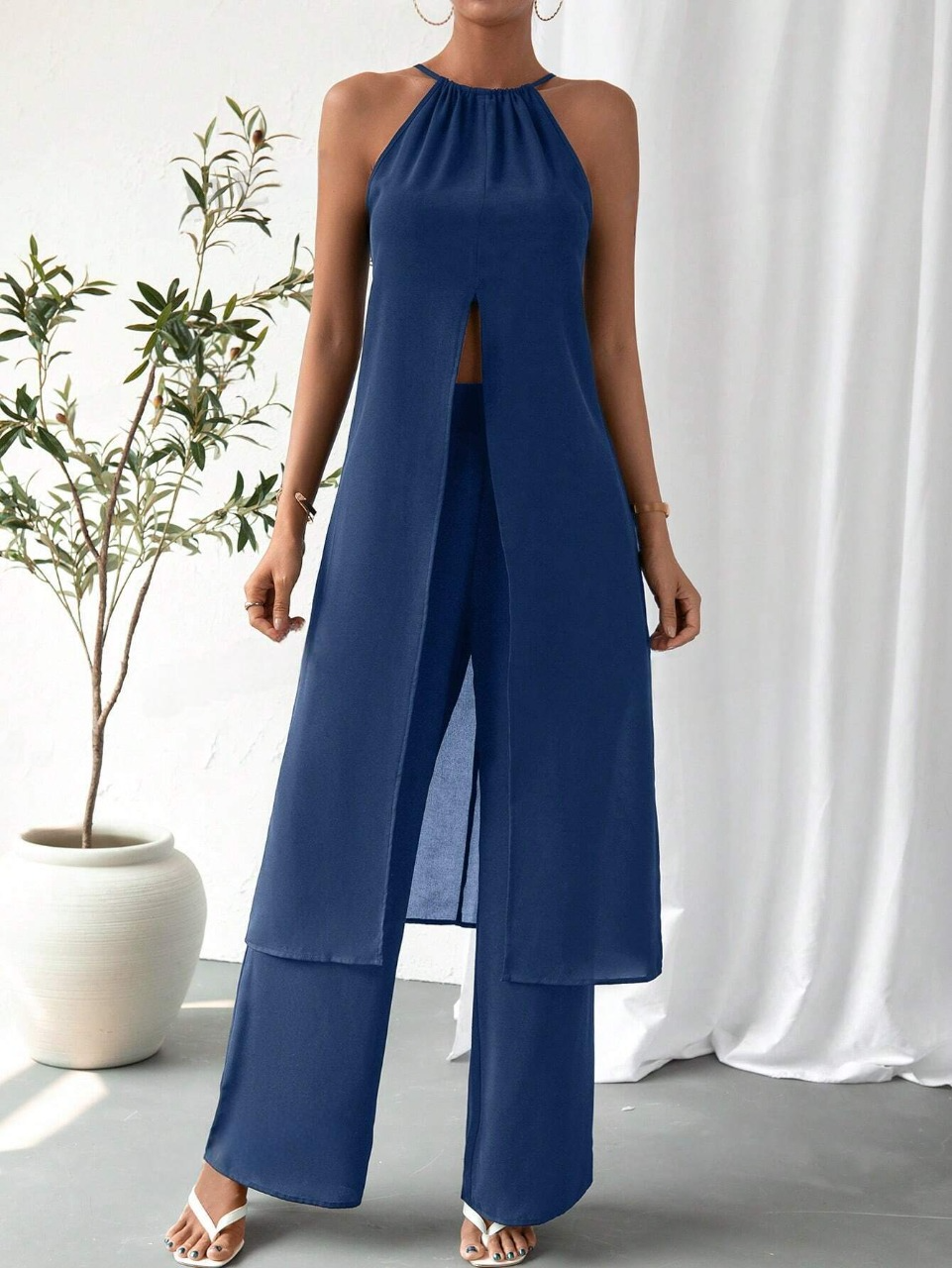 Colore : Blu realeStile : CasualTipo di motivo : Colore unicoDettaglio : Catena, Nodo, ApertaScollatura : HalterTipo di top : Top con bretelleTipo di bottom : PantaloniTipo di montaggio :...