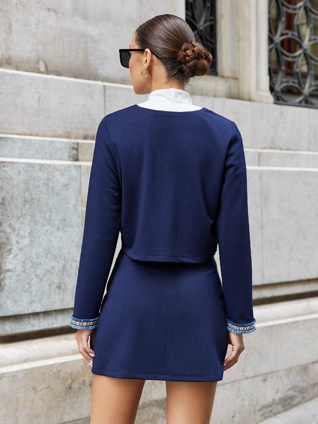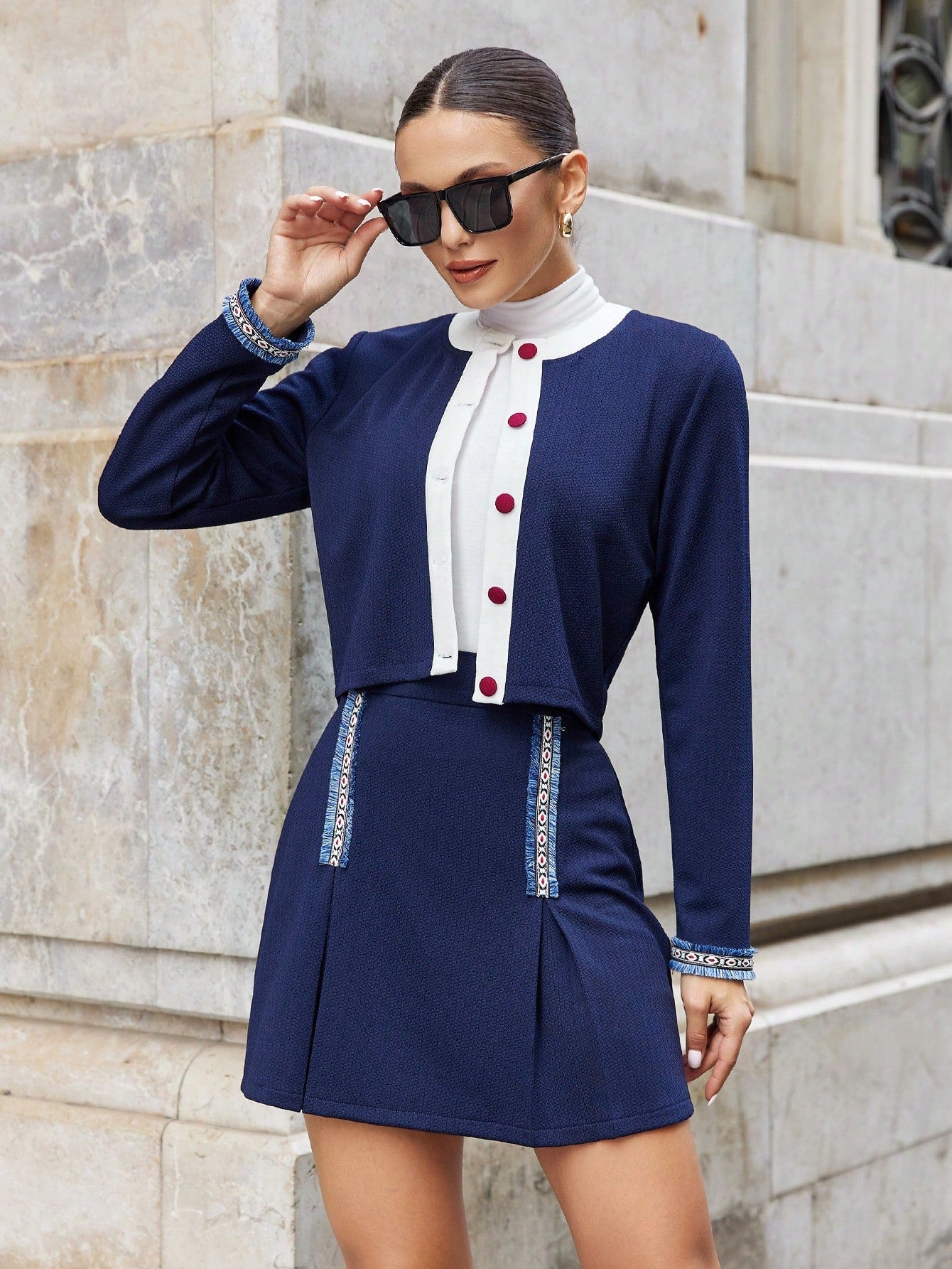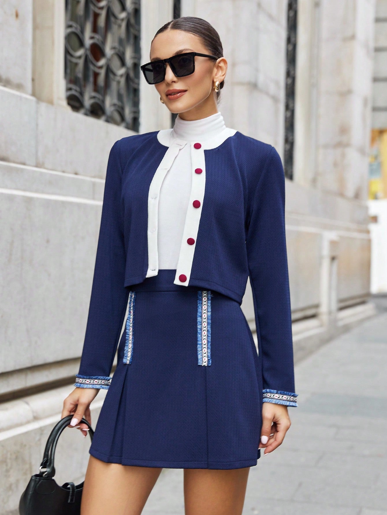 Stile : EleganteDettaglio : Bottoni, Nastro, Bottone frontaleTipo di motivo : Blocchi di coloreScollatura : Collo altoTipo di manica : ClassicaColore : Blu NavyTipo di top : GiaccheTipo di bottom...