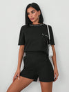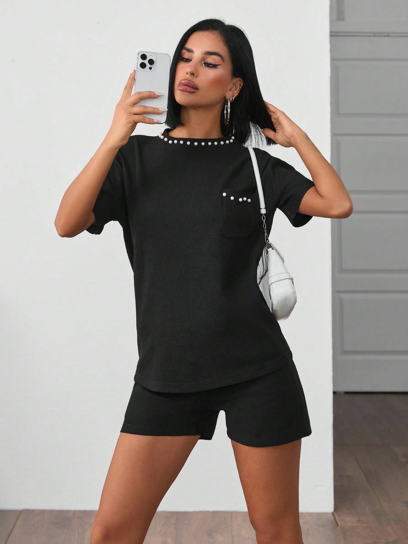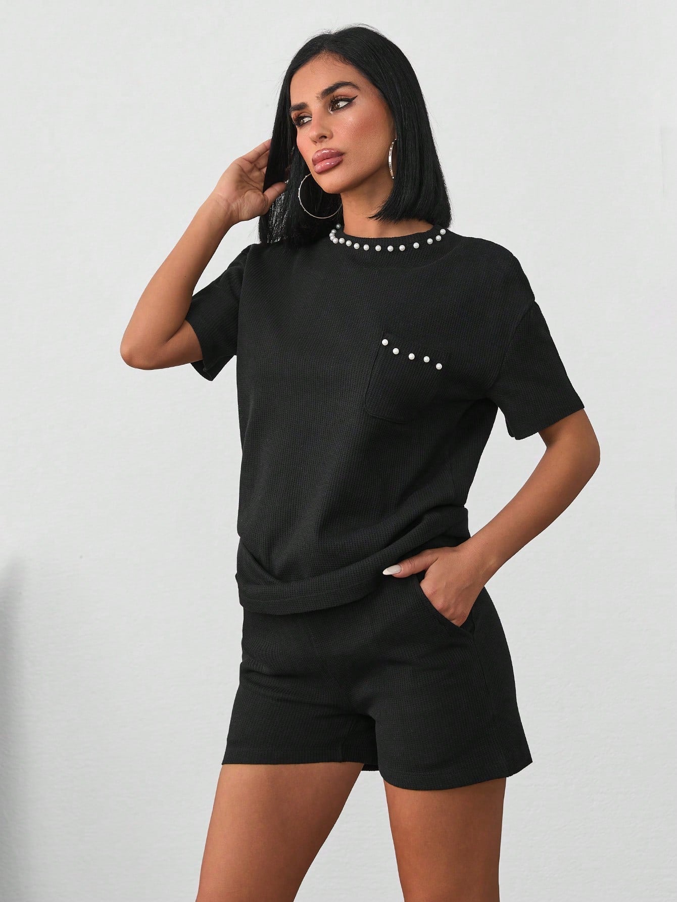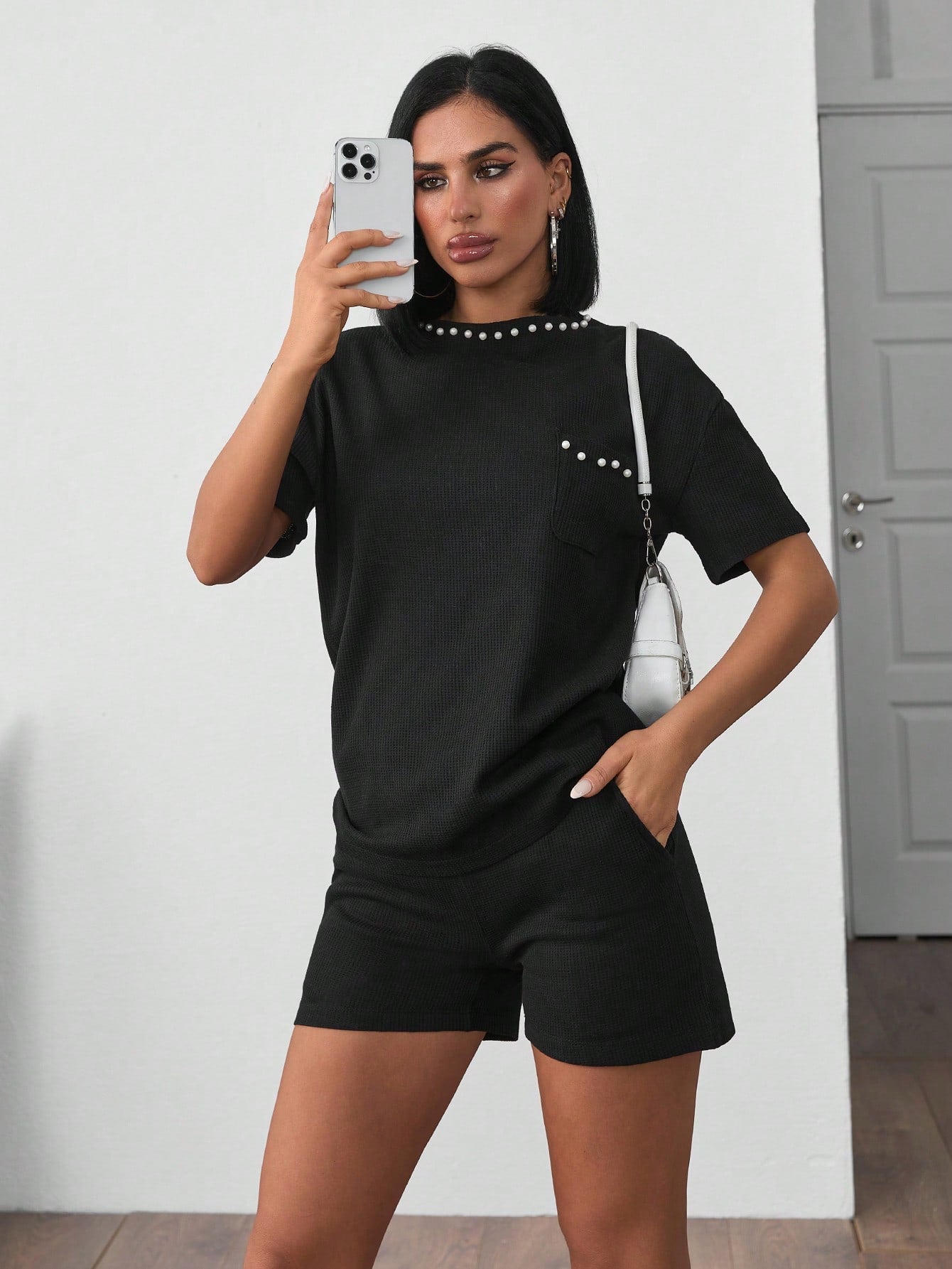 Set composto da 2 pezzi in maglia a nido d'ape perlata: canotta corta e pantaloncini