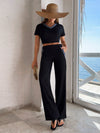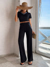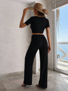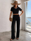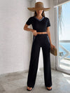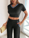Set coordinato composto da blusa a maniche corte con scollo a V e linea etnica, abbinata a pantaloni a gamba dritta lunghi con elastico in vita, tasche ed orlo