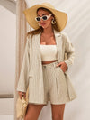 Set coordinato in lino a righe beige con blazer oversize e pantaloncini vita alta