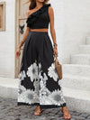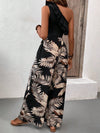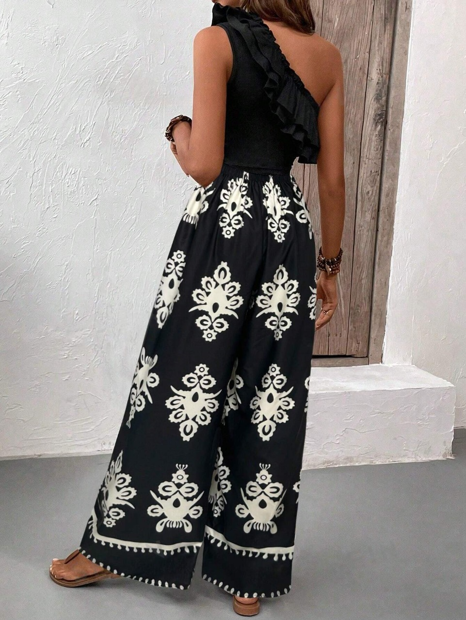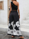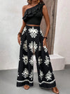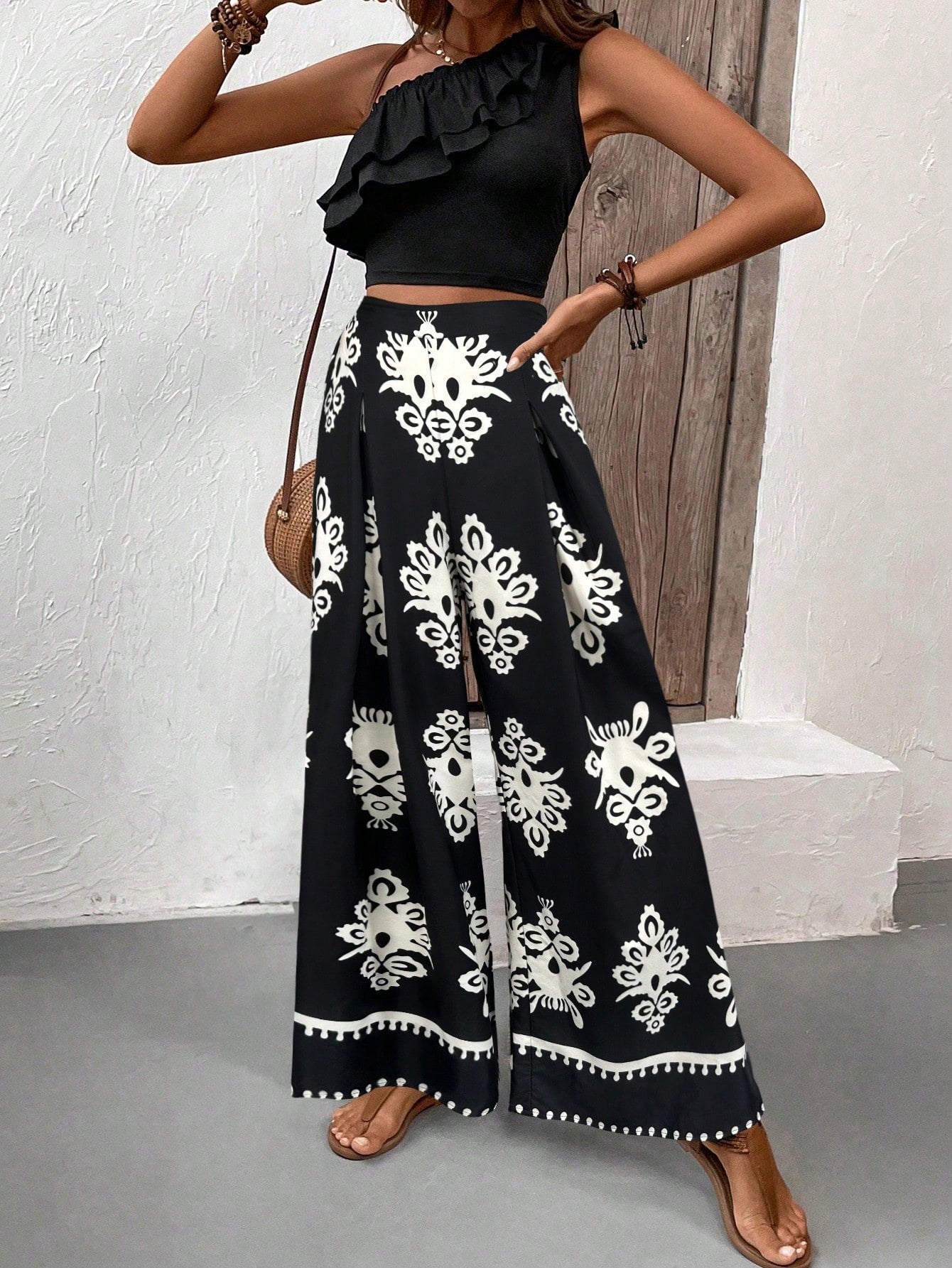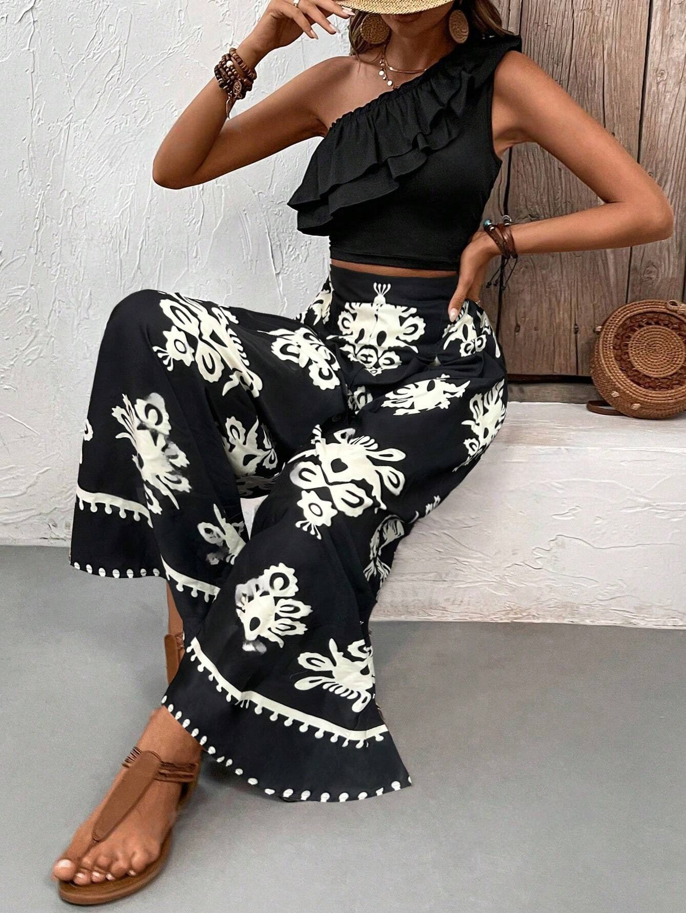 Top canotta asimmetrica con volant e spallina singola e pantaloni a gamba larga con stampa hawaiana