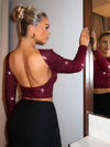 Top ciliegia rossa, marrone rossiccio con schiena scoperta, maniche lunghe, scollo a barca