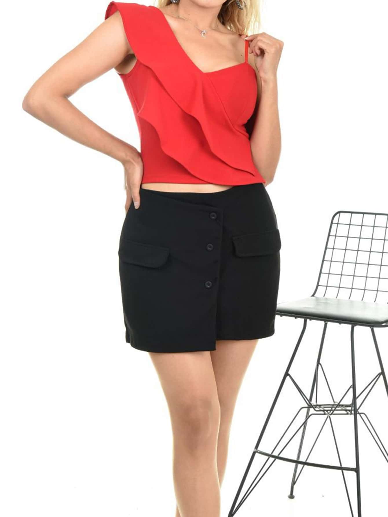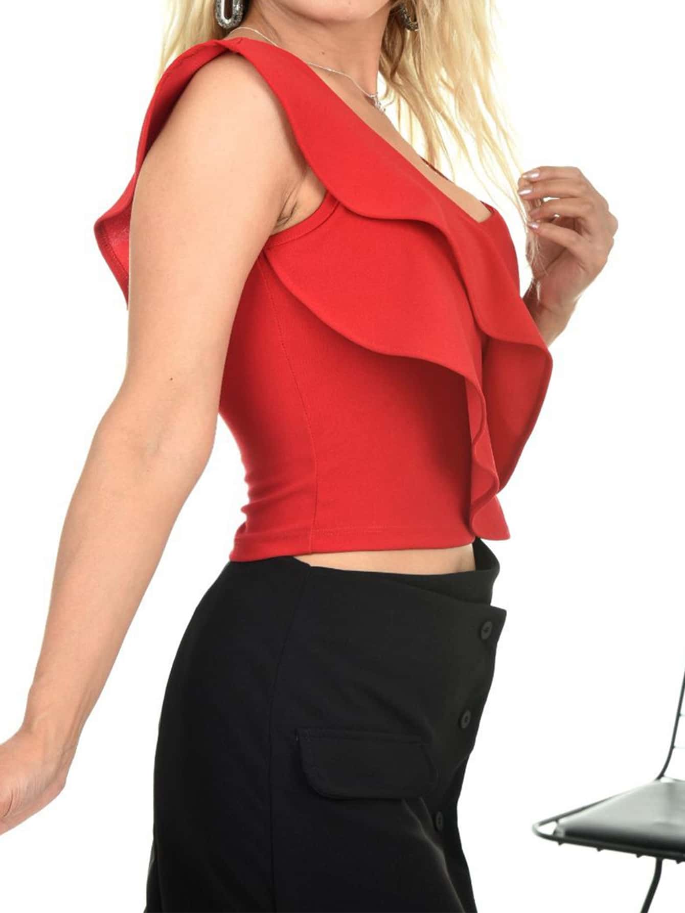 Dettaglio : Asimmetrico, VolantiScollatura : Scollatura asimmetricaStile : CasualTipo di motivo : Colore unicoOrlo/ Forma : ClassicoColore : RossoLunghezza manica : Senza manicheLunghezza : CropTipo di montaggio : Forma normaleTessuto...